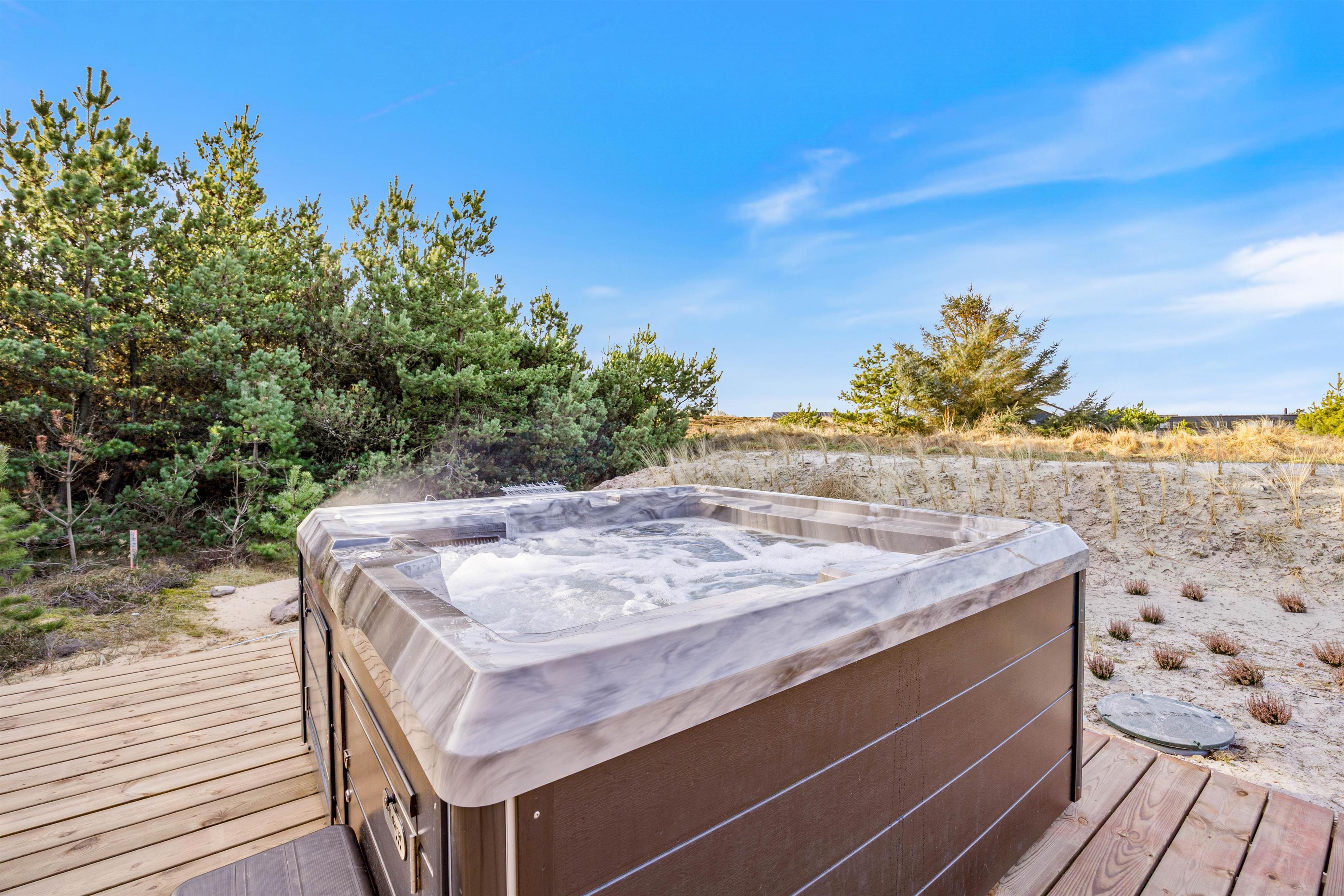 Terrassen har også sit eget wellness-område i form af en vidunderlig udesauna og udespa, hvor I kan få varmen og se stjernerne danse på himlen. Praktisk er her også en udebruser (april til november), hvis I hurtigt skal køles ned eller skylle sandet væk efter en tur på stranden.