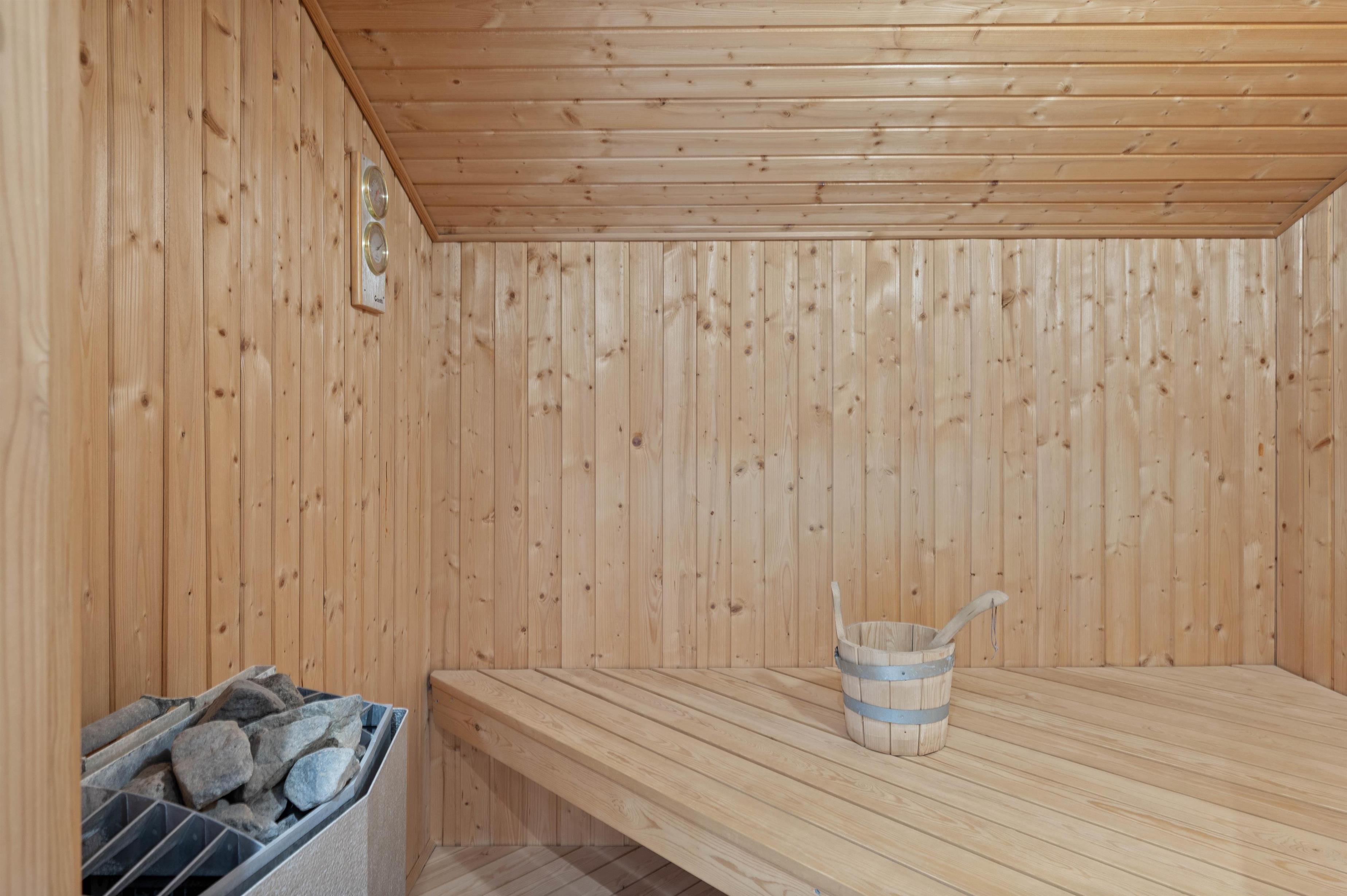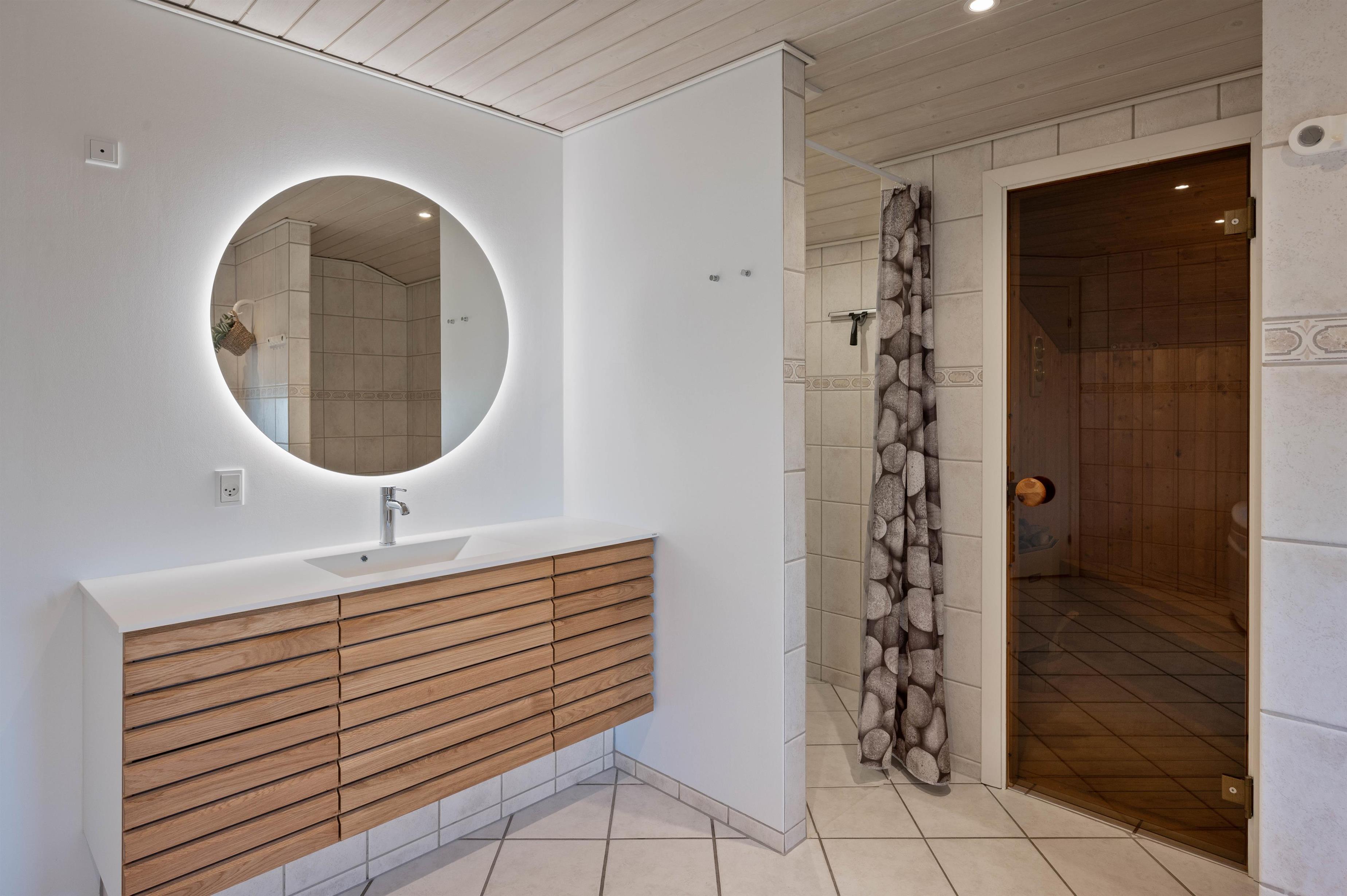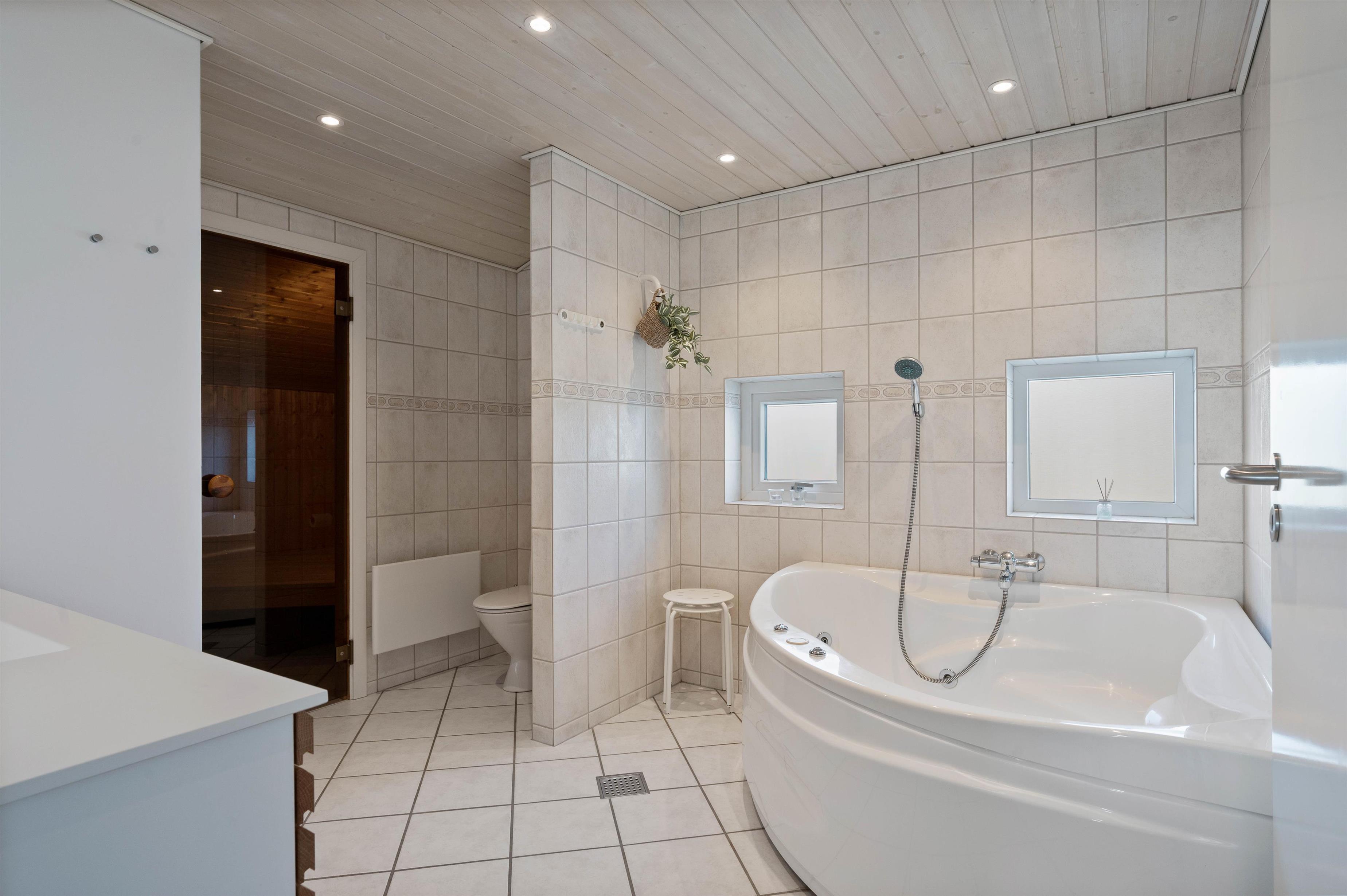 Det lækre badeværelse byder på total afslapning i den store spa og feriehusets skønne sauna. De 3 gode soveværelser er indrettet med 2 dobbeltsenge og et værelse med 2 enkeltsenge.