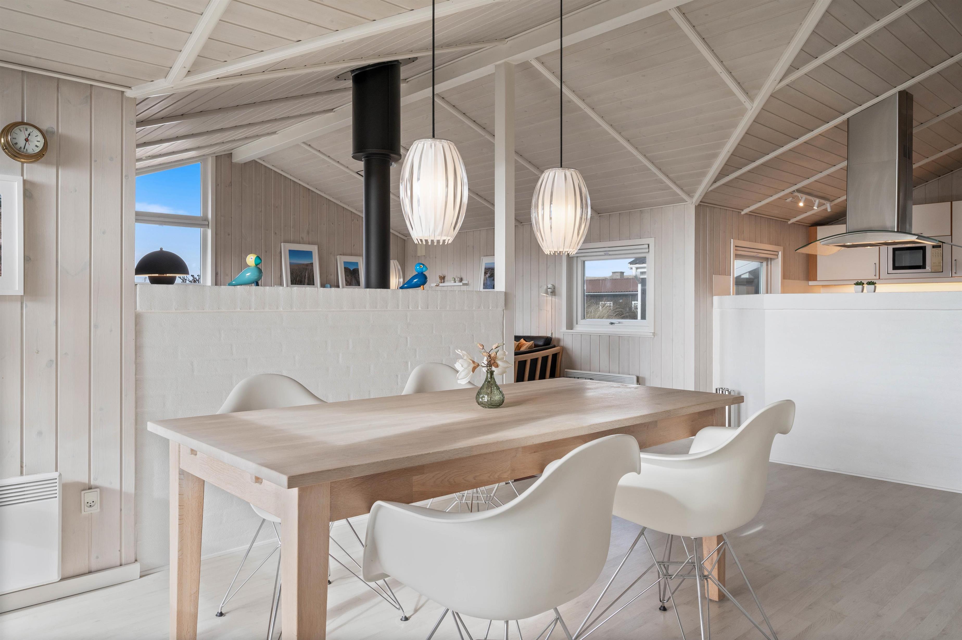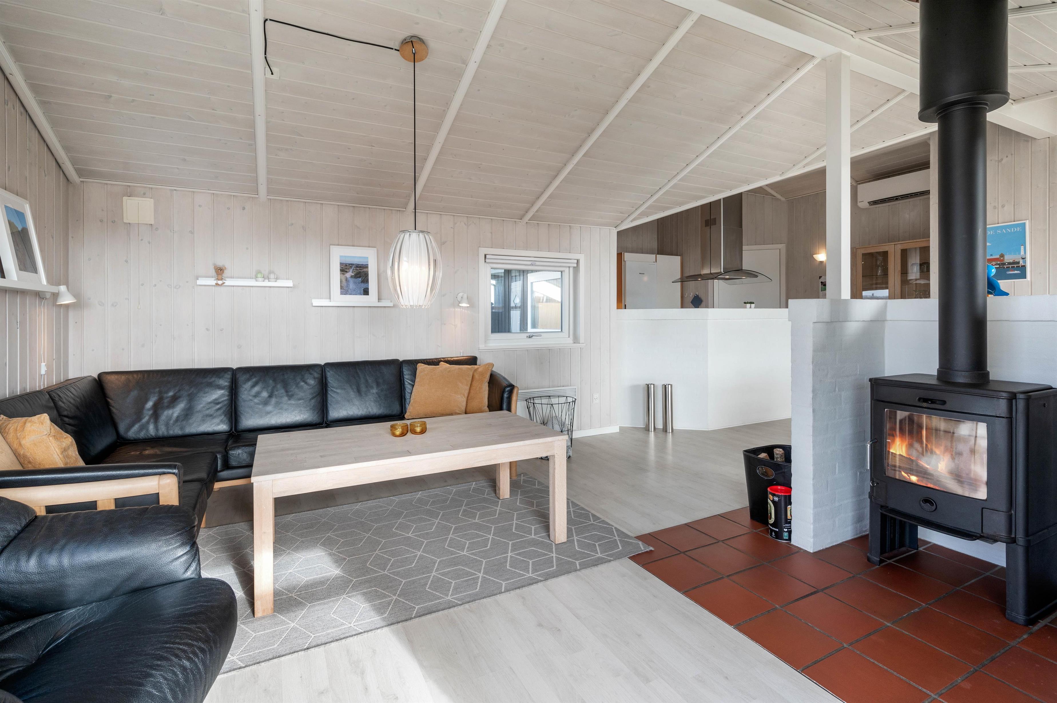 Man betages omgående af den fine indretning, lige fra det lyse og praktiske køkken med alt tænkeligt udstyr, over den elegante spiseafdeling med udsigt til klitafsnit, til den magelige og smagfuldt møblerede opholdsafdeling. Her er der rig mulighed for at slappe af foran brændeovnen eller med TV, stereoanlæg eller evt. opkobling på det trådløse internet (gratis). I kan med fordel benytte jer af den energibesparende varmepumpe i sommerhuset.