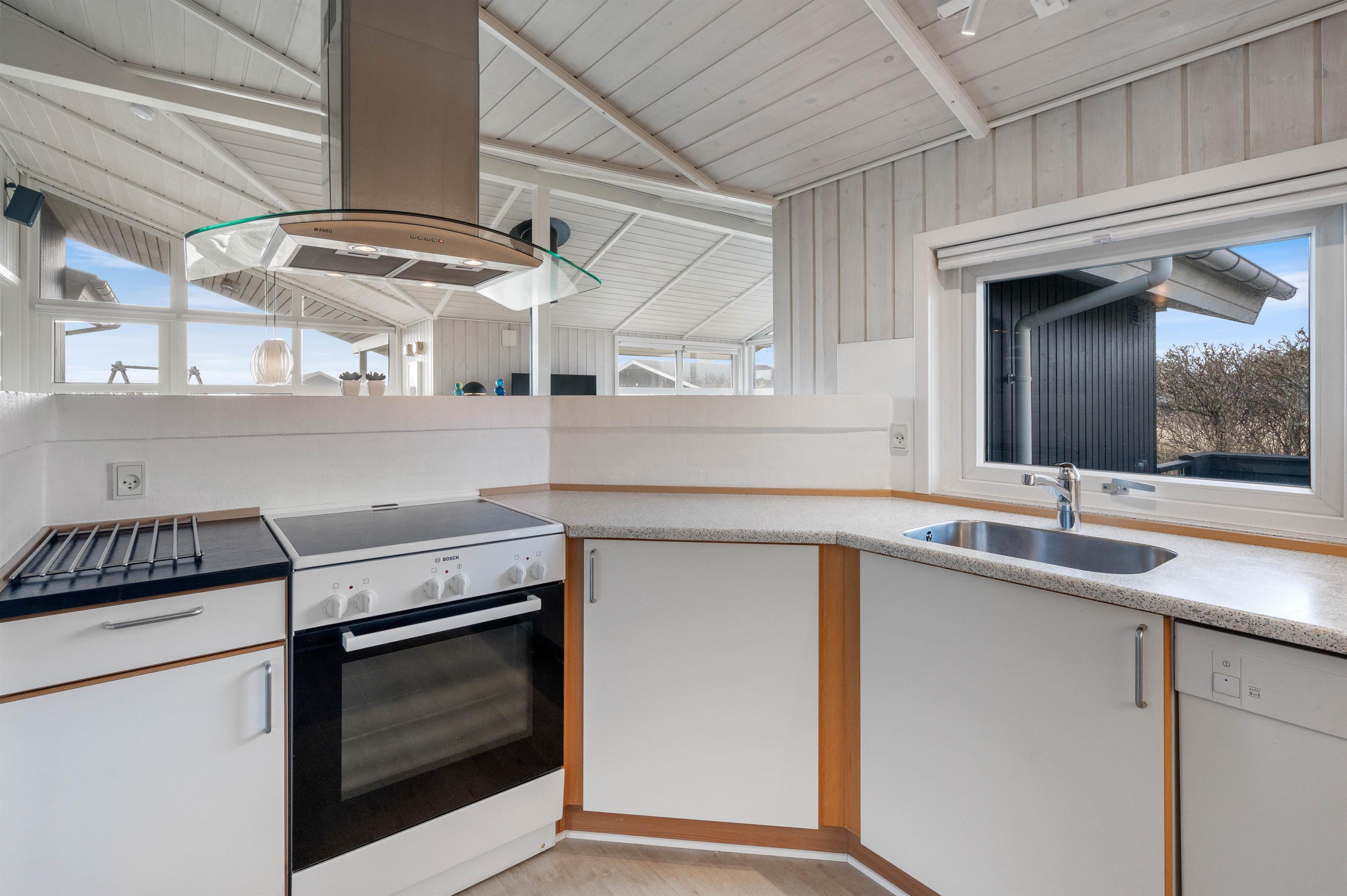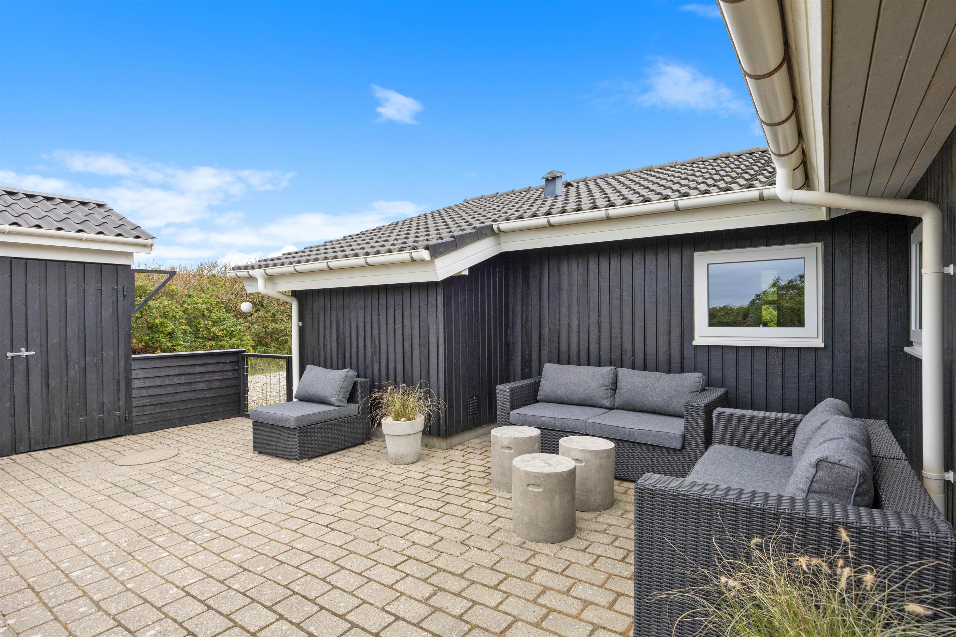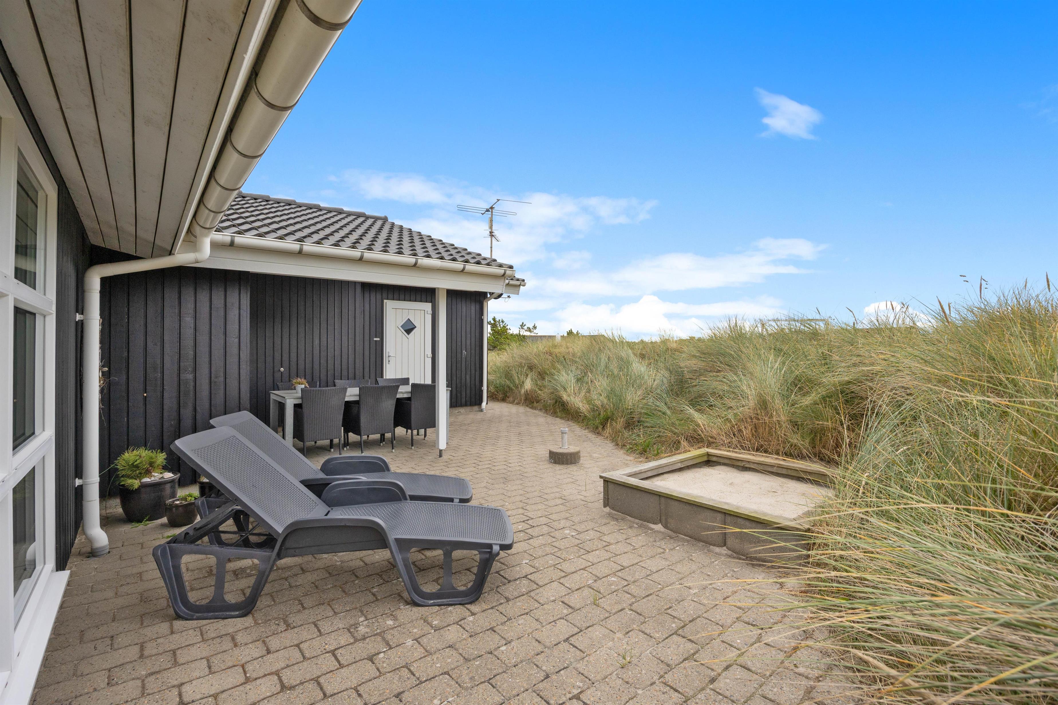 På Holmsland Klit mellem hav og fjord i det skønne Vestjylland ligger dette indbydende feriehus. Den kuperede naturgrund gør, at du ugeneret kan slappe af på den store, delvis overdækkede terrasse. Her er naturligvis gode havemøbler og liggestole og det er altid muligt at finde en lækrog til afslapning og kulinariske udfoldelser på grillen. Til familiens yngste er der både sandkasse og gynge på naturgrunden.