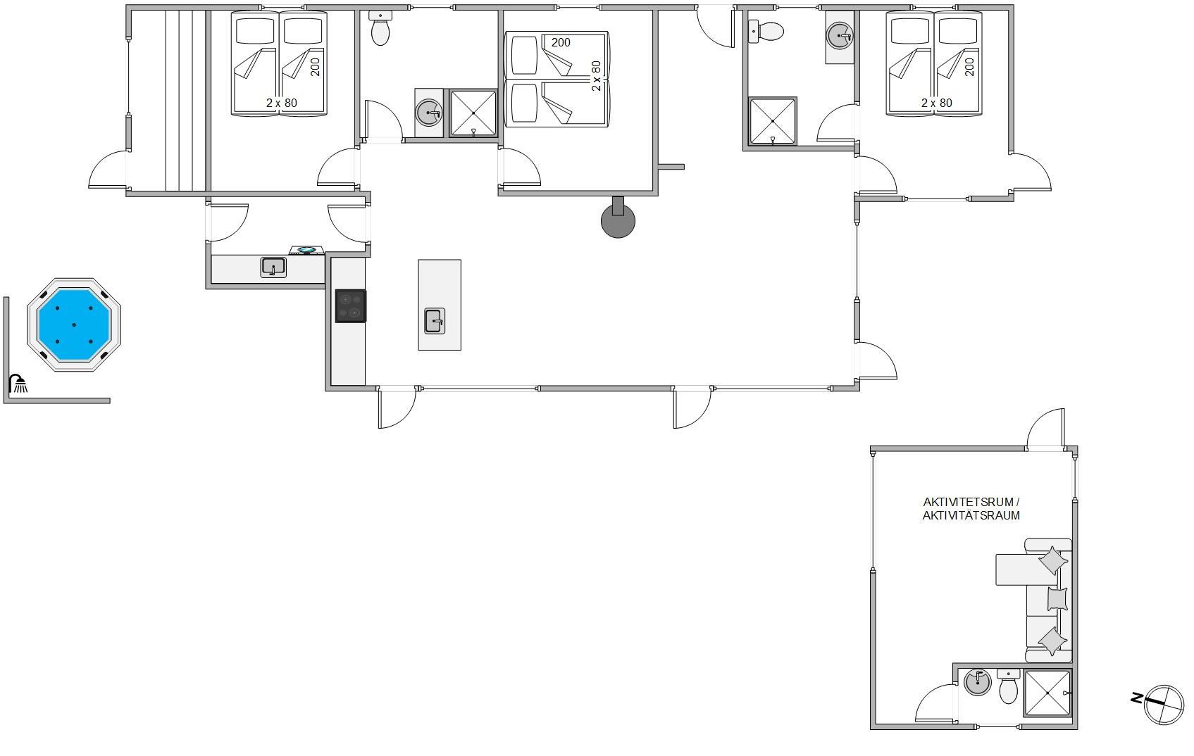 Her er plads til 8 feriegæster, som kan nyde en dejlig ferie i det eksklusive sommerhus. Sovepladserne fordeler sig på 3 gode soveværelser, som alle er indrettet med komfortable dobbeltsenge. Er børnene med, så er der mulighed for at rykke dem fra hinanden, så det bliver enkeltsenge. De sidste 2 sovepladser finder I i det rummelige aktivitetsrum, hvor en sovesofa (130x195 cm) er placeret.