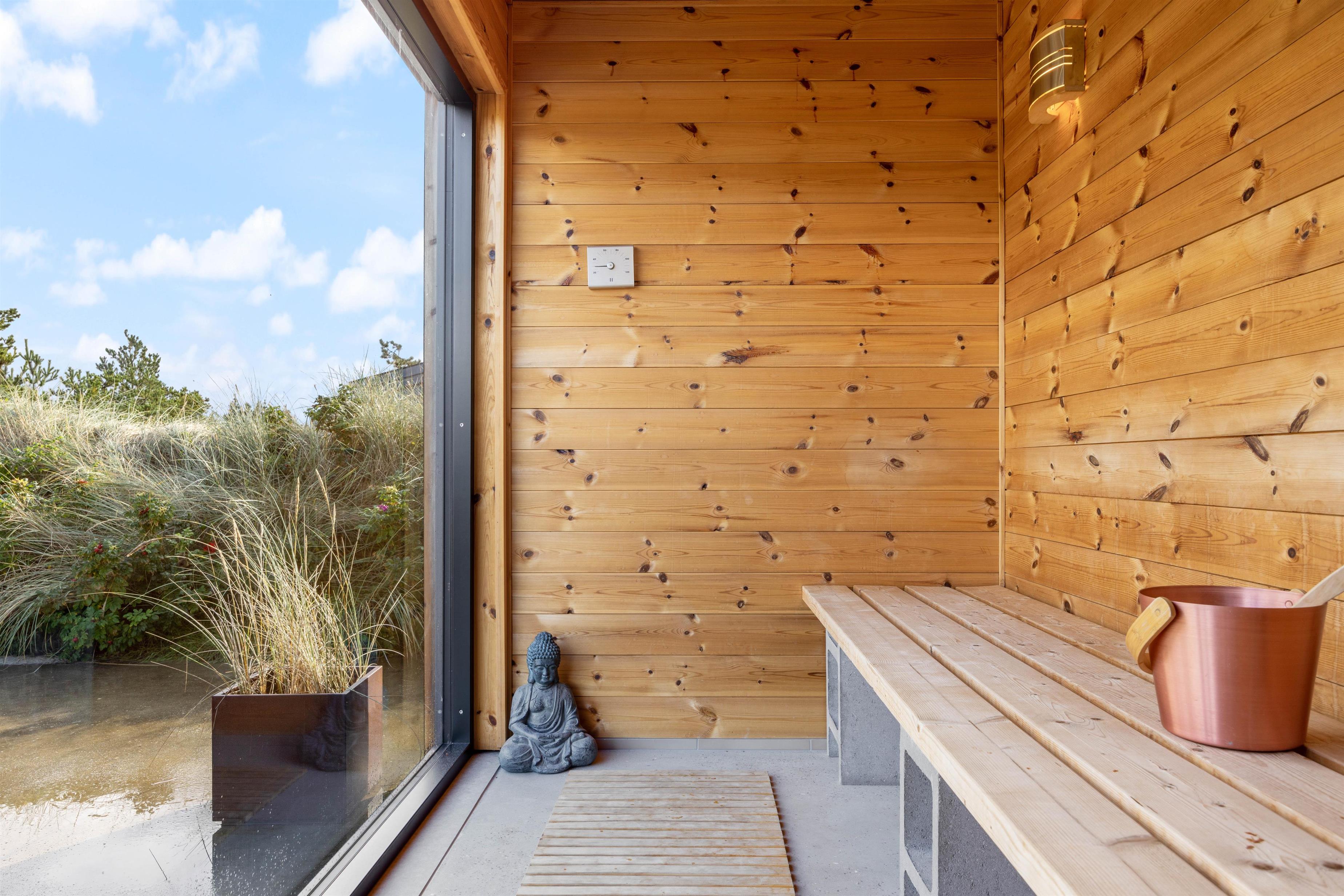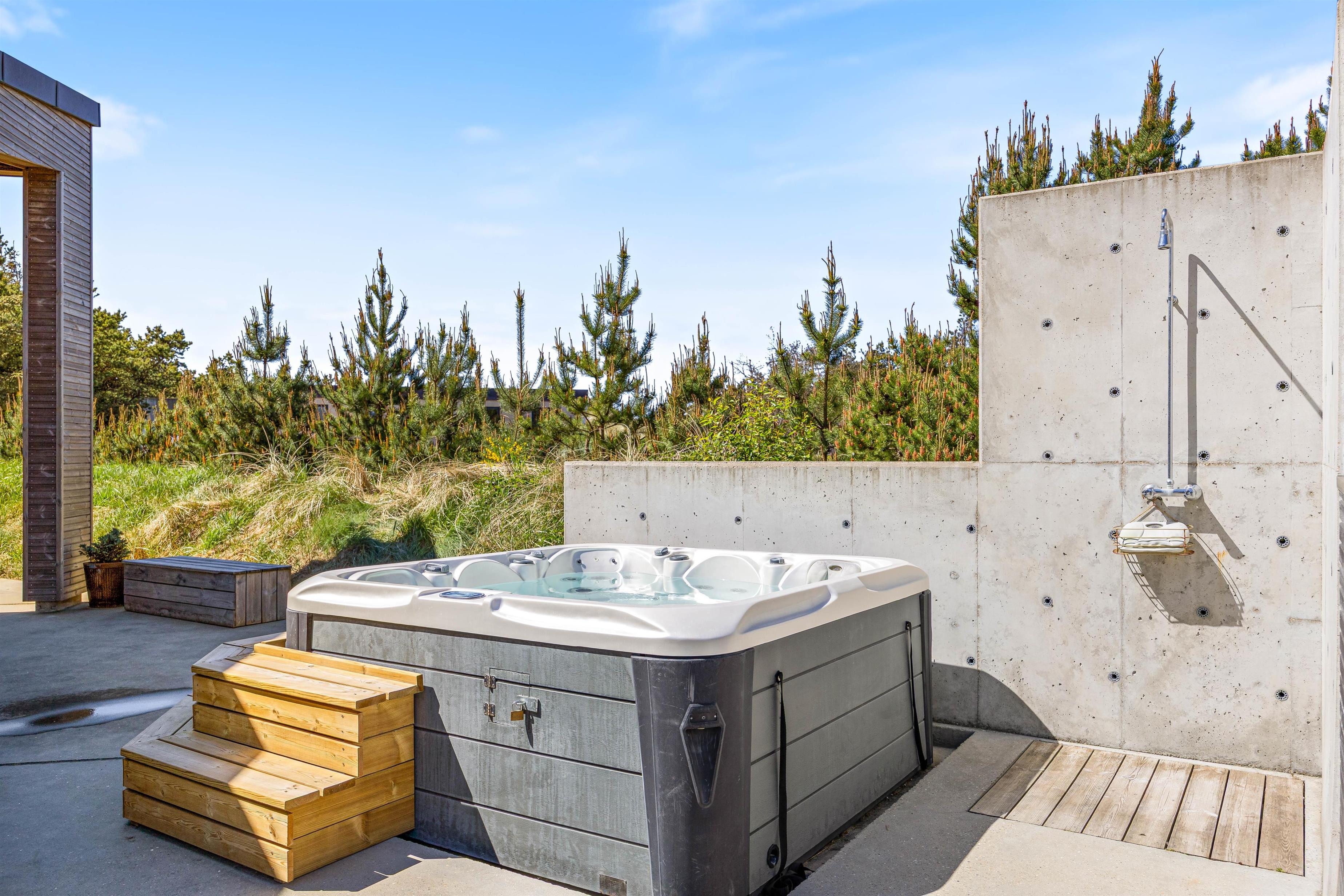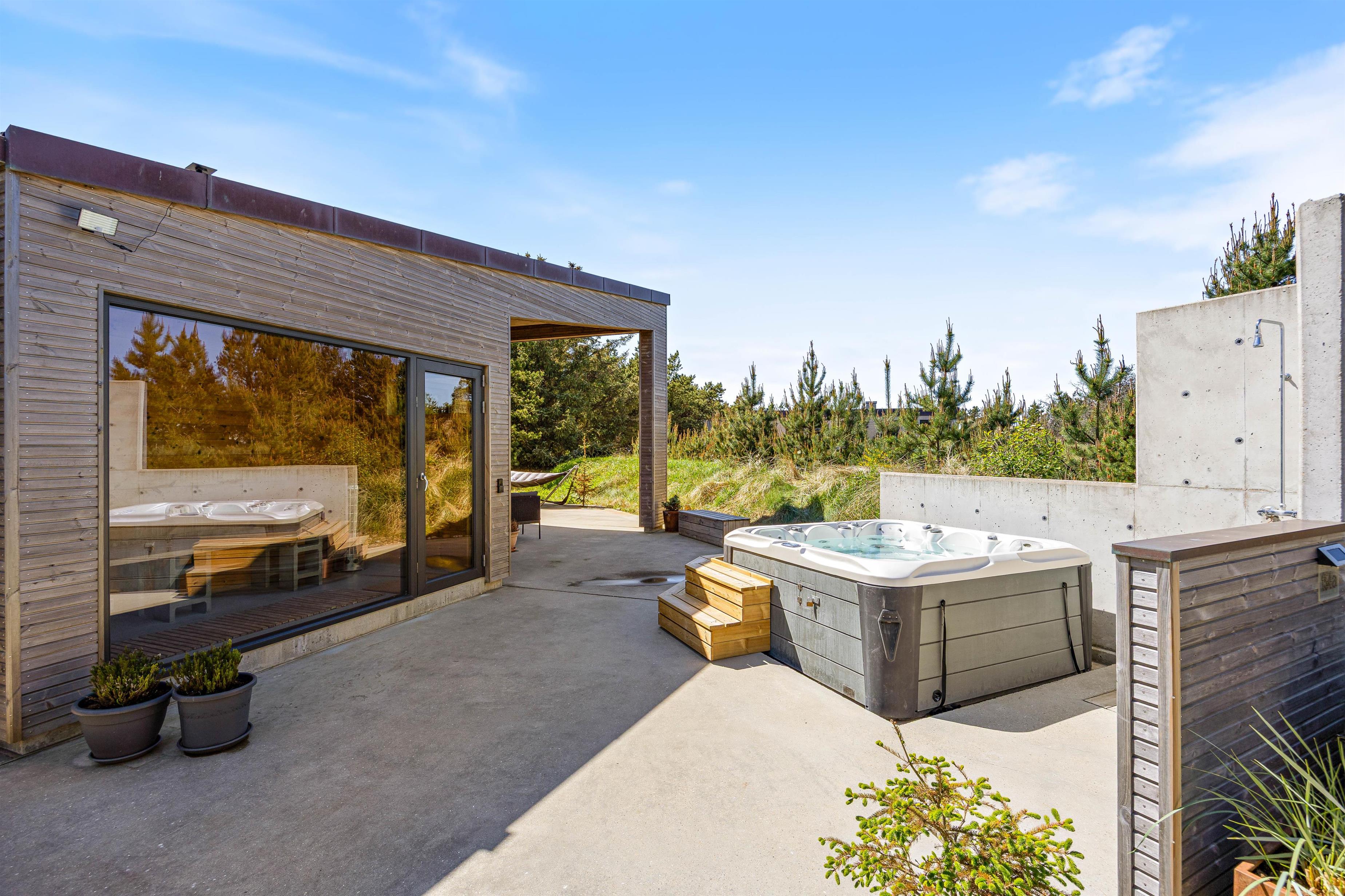 Et af sommerhusets absolutte højdepunkter er den udendørs wellnessafdeling, som byder på både sauna, spabad og udebruser. Efter en dejlig dag i naturen findes der intet bedre end afslappende stunder i familiens selskab. Udebruseren på terrassen er perfekt til at skylle sand og salt af kroppen efter en tur i Vesterhavets bølger (kan bruges fra april til november).