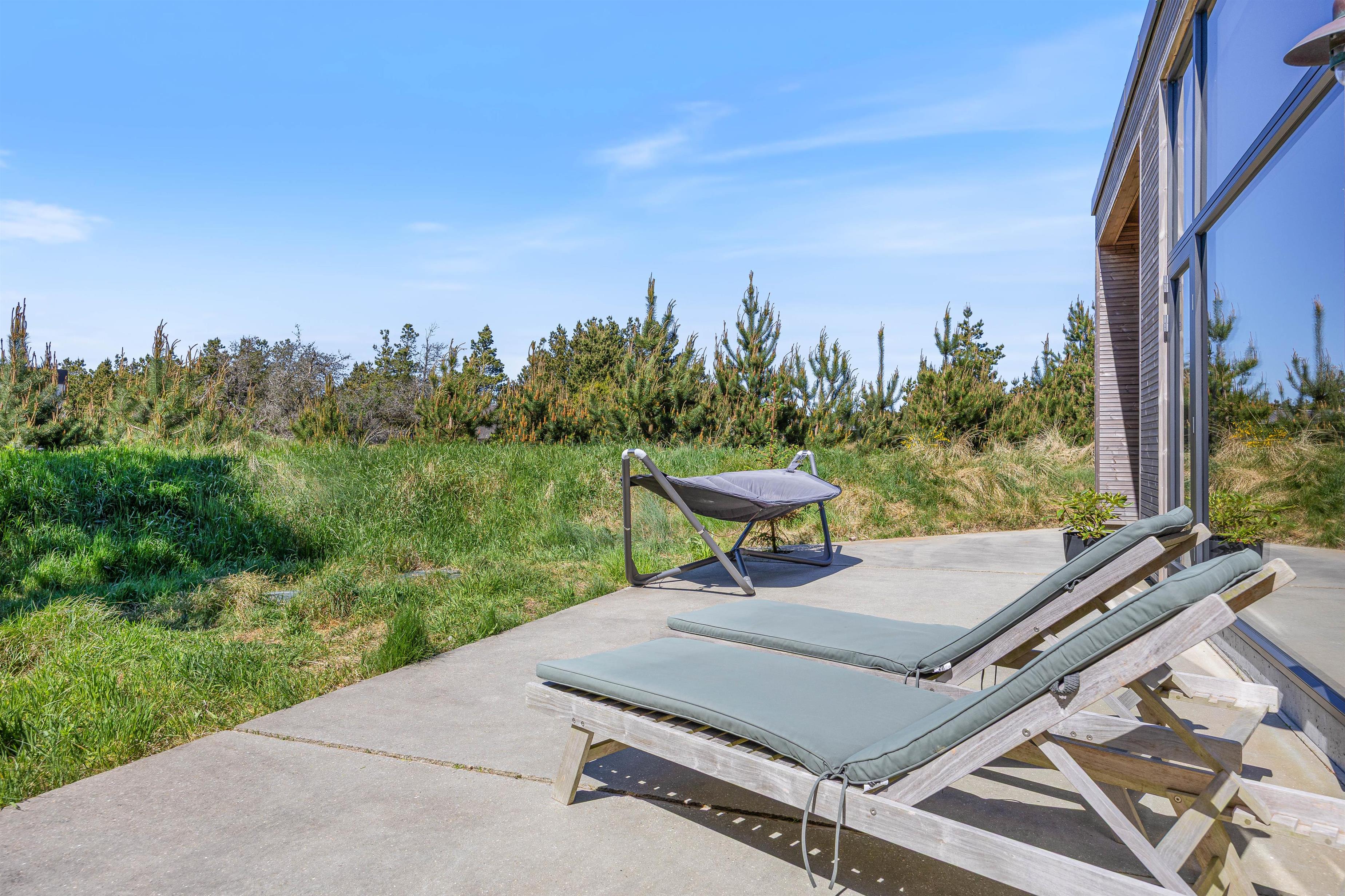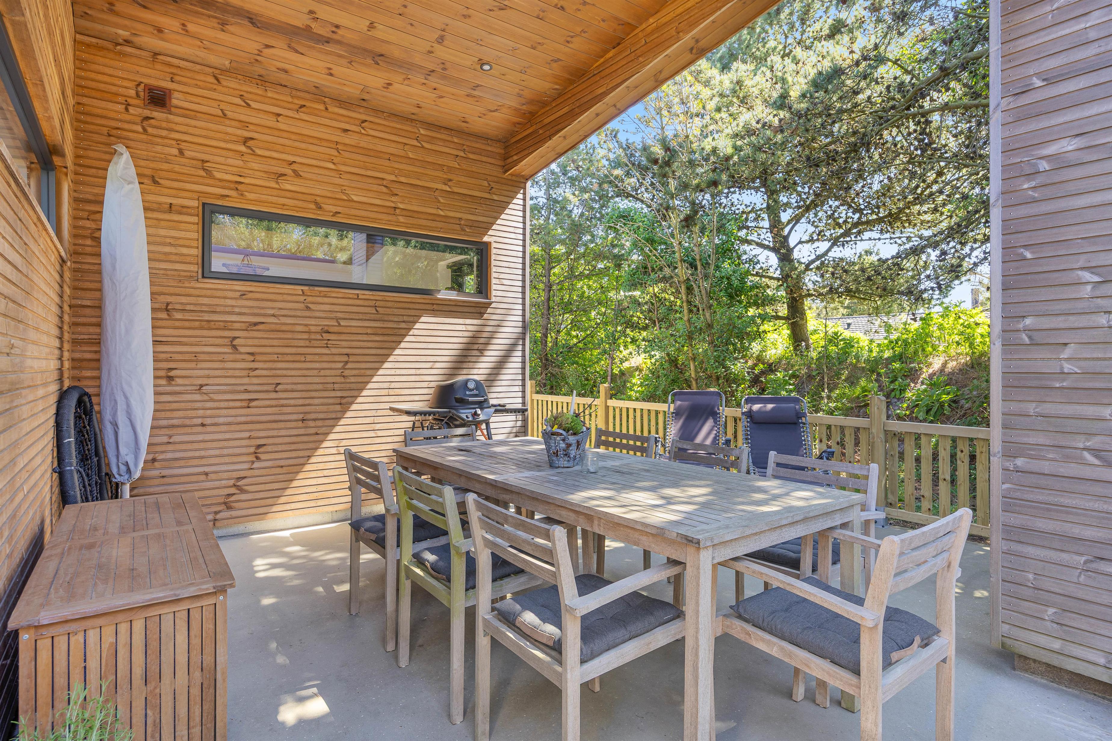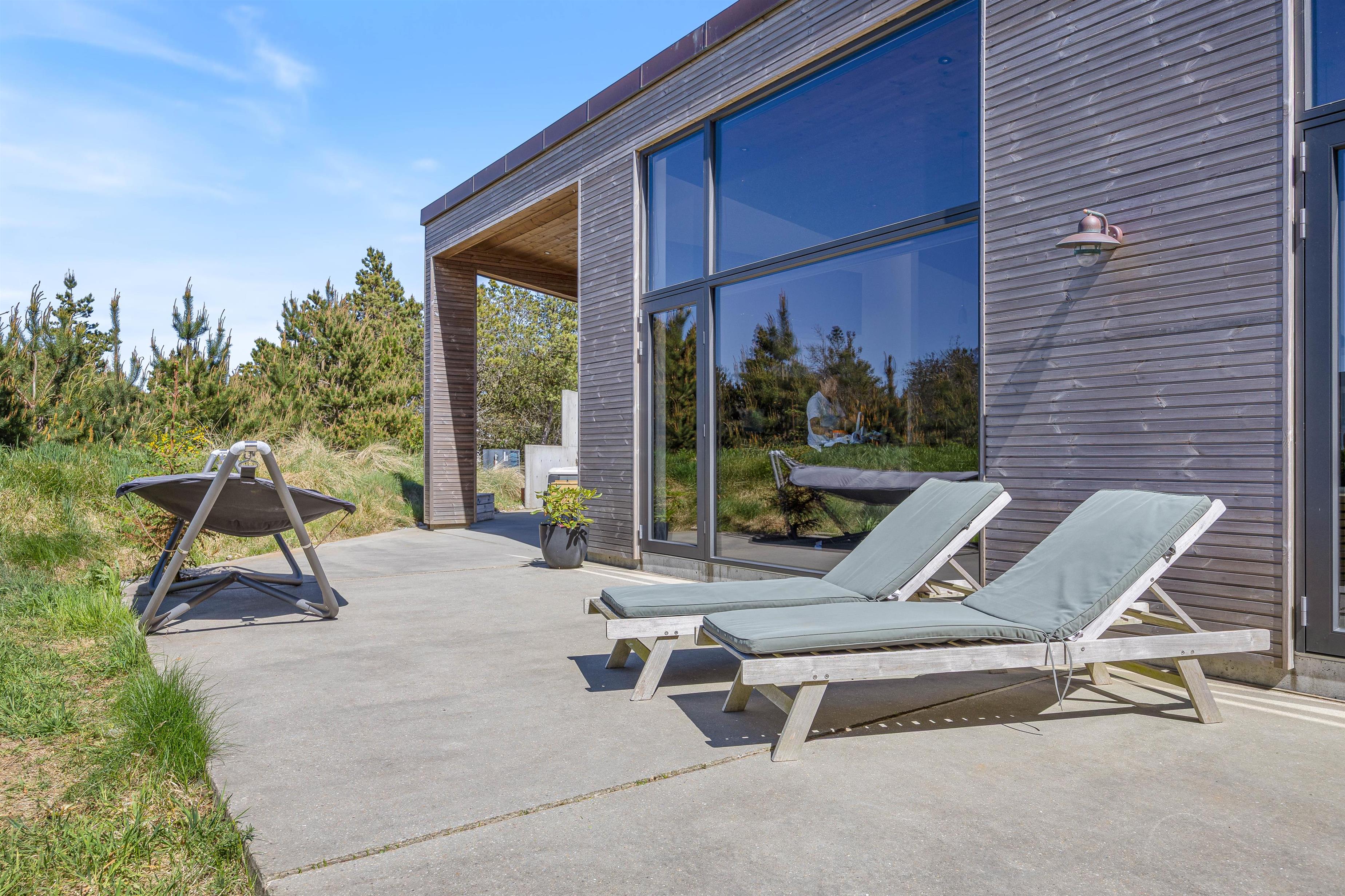 Et af sommerhusets absolutte højdepunkter er den udendørs wellnessafdeling, som byder på både sauna, spabad og udebruser. Efter en dejlig dag i naturen findes der intet bedre end afslappende stunder i familiens selskab. Udebruseren på terrassen er perfekt til at skylle sand og salt af kroppen efter en tur i Vesterhavets bølger (kan bruges fra april til november).
