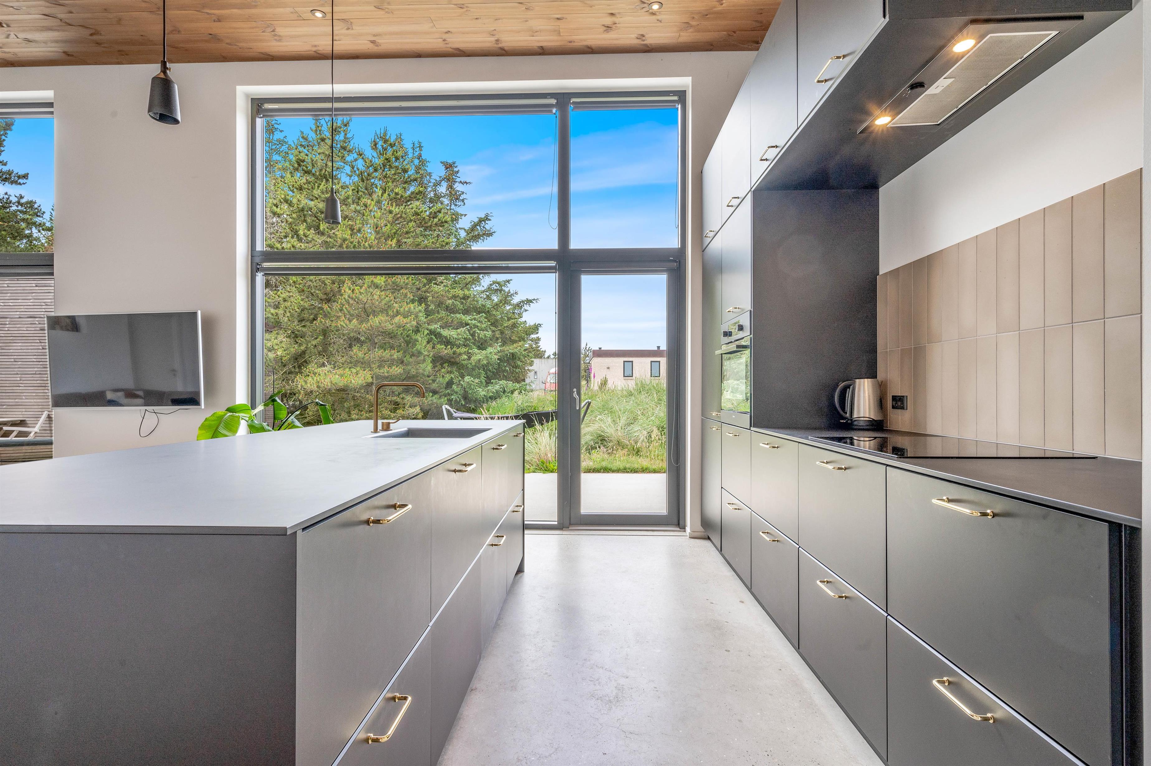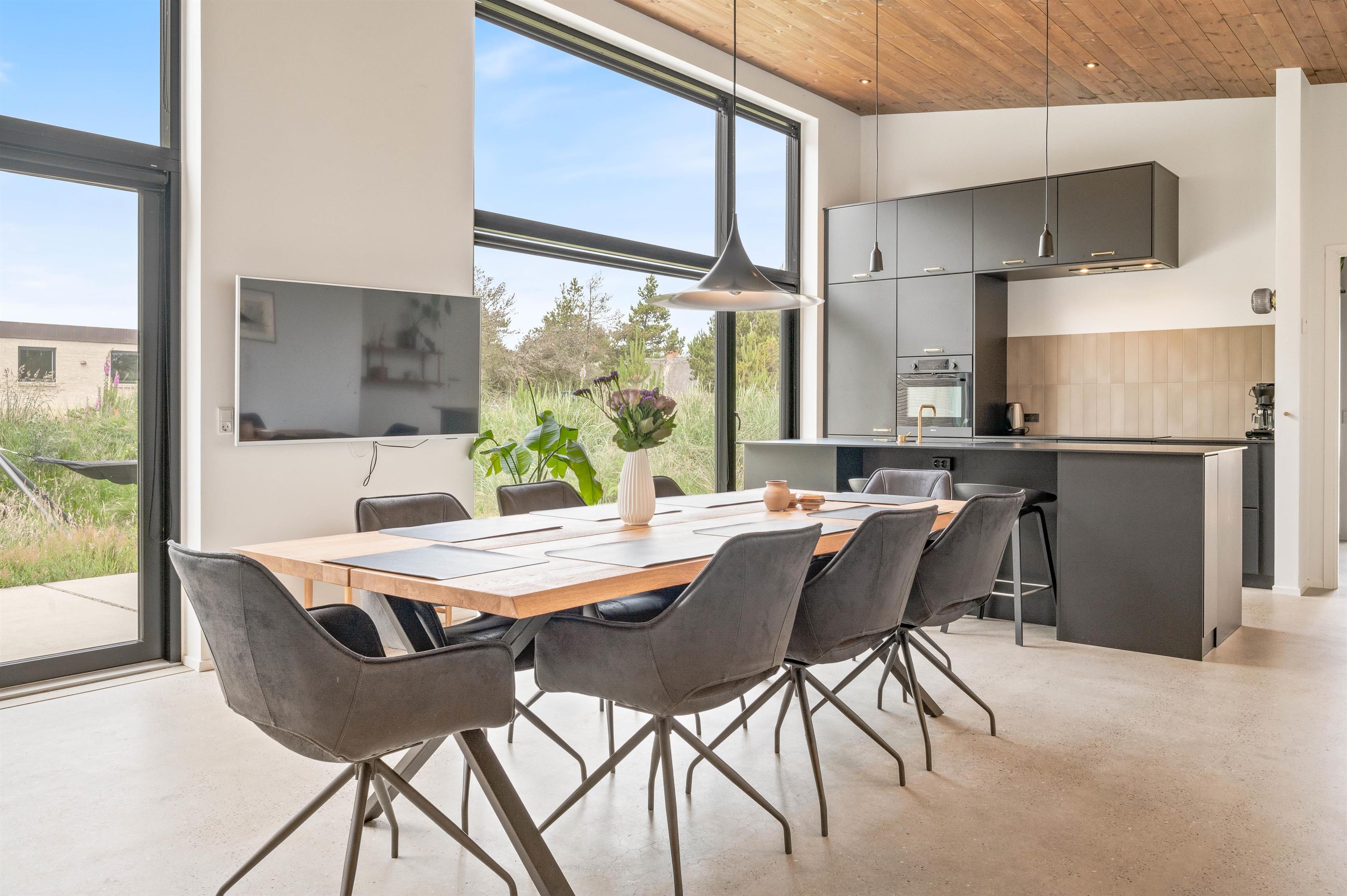 Det veludstyrede og moderne køkken ligger i åben forbindelse med stuen, hvor hele familien kan samles. Her er der en miljøvenlig vandpejs, som sørger for en rigtig hyggelig feriestemning året rundt. I kan med fordel benytte jer af den energibesparende varmepumpe til at holde temperaturen behagelig. Sommerhuset har desuden både vaskemaskine og tørretumbler, som I kan bruge, hvis det bliver nødvendigt.