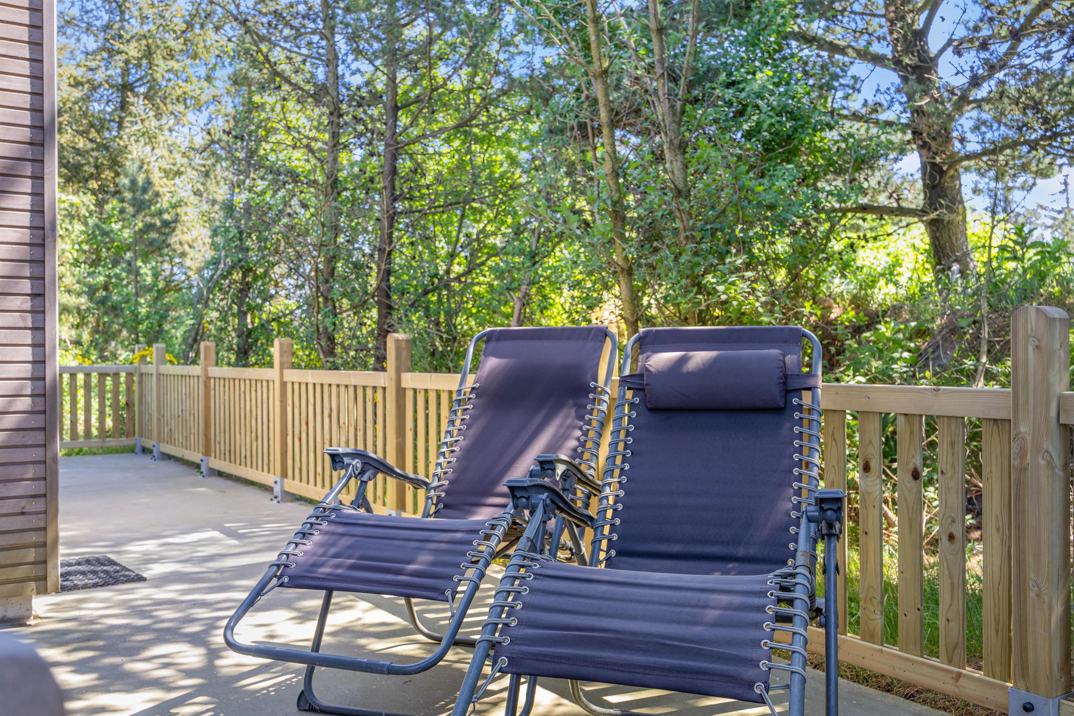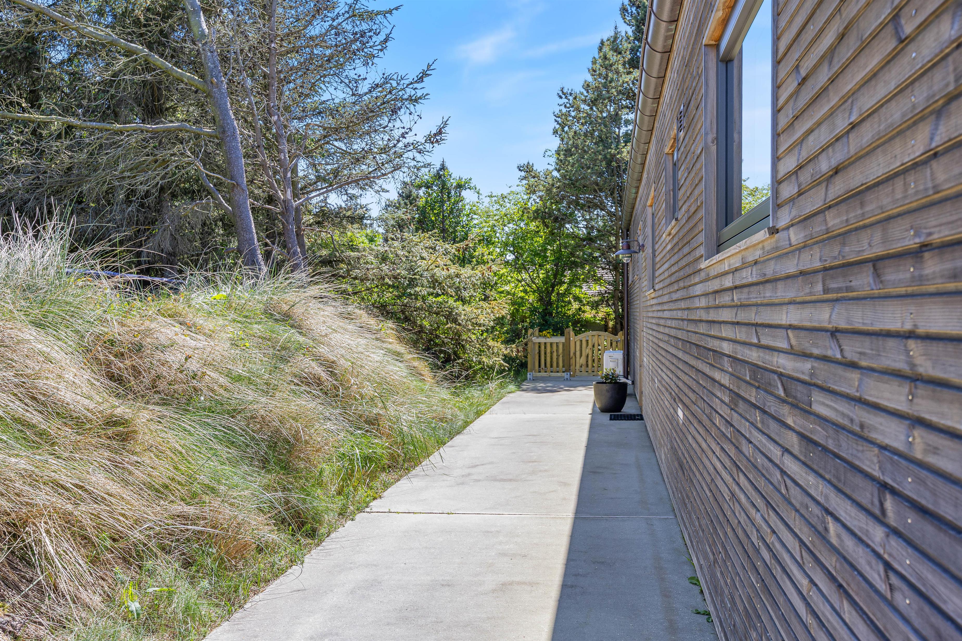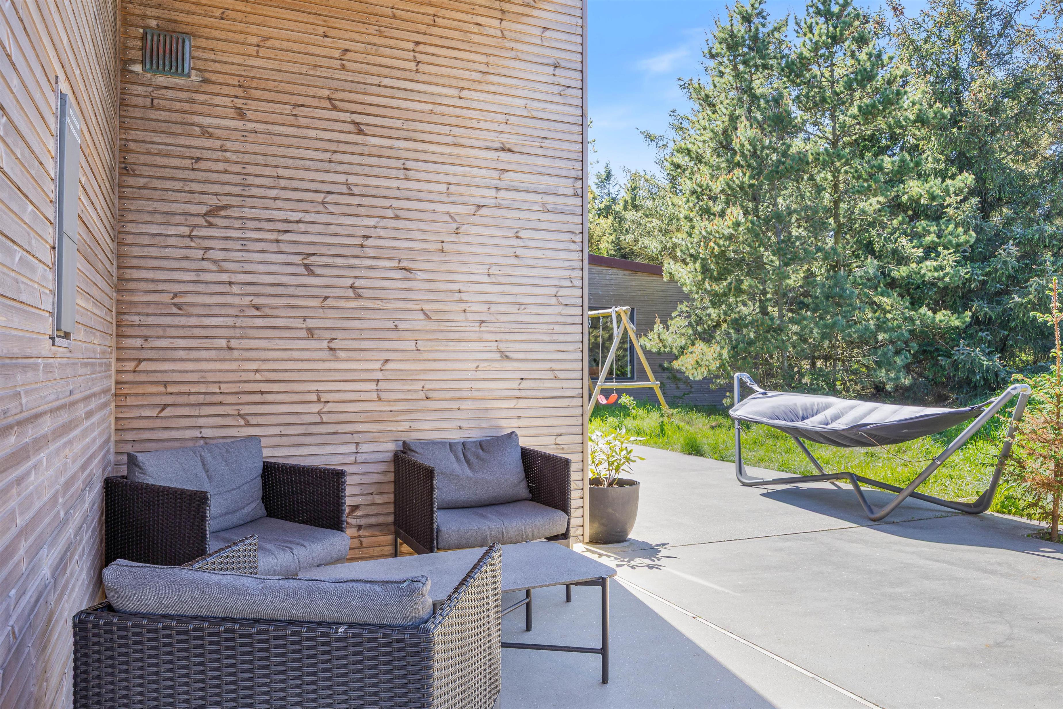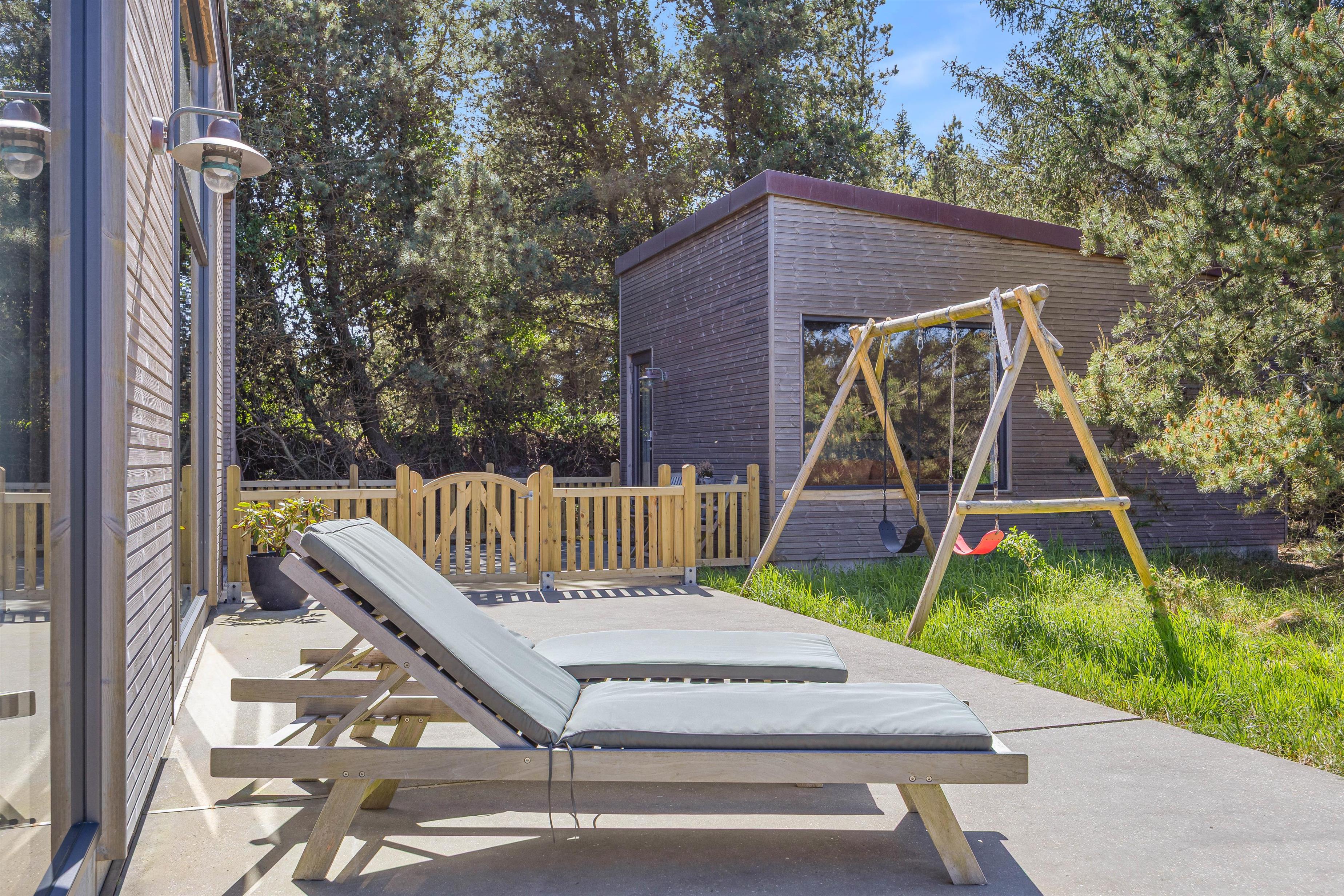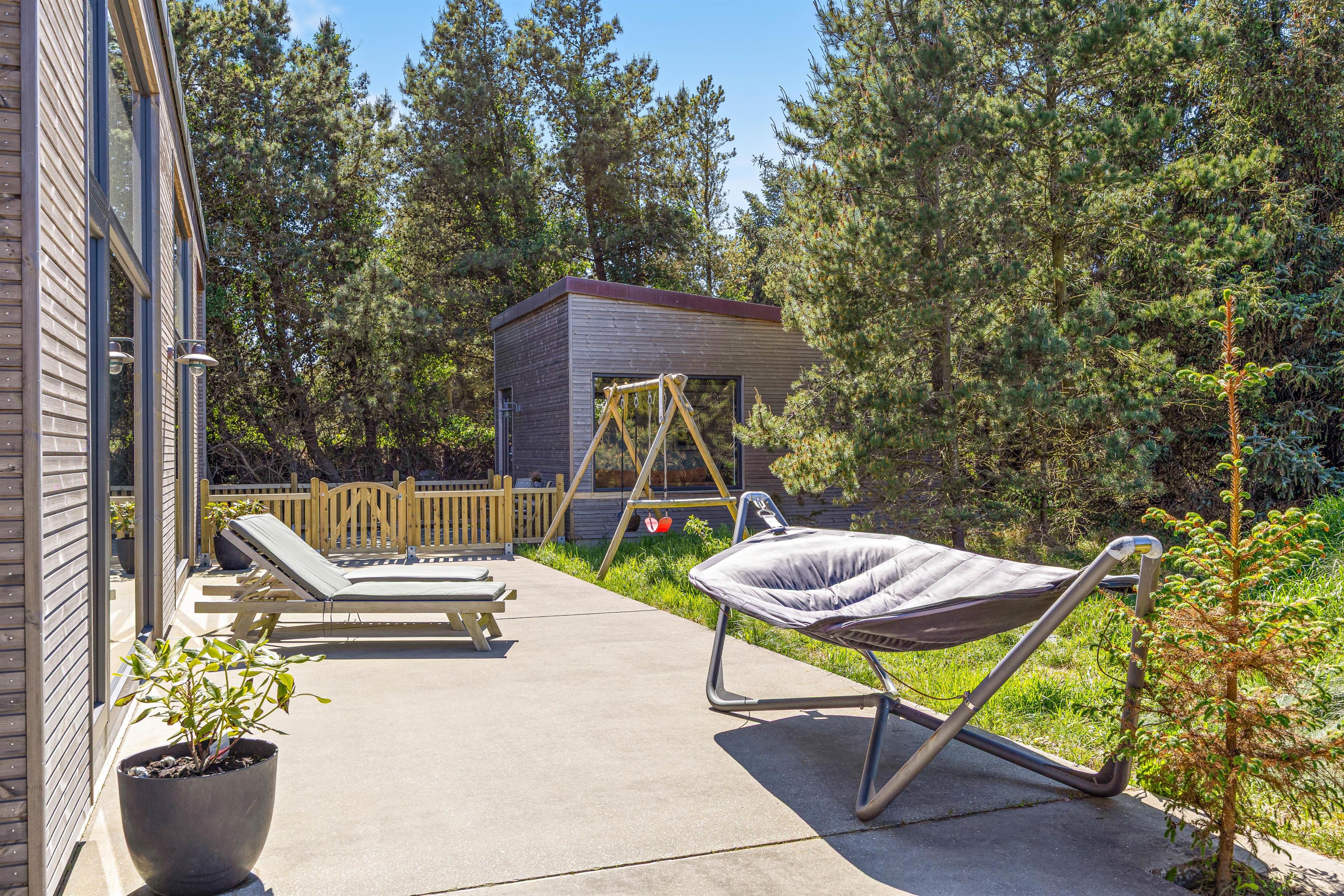 Sommerhuset ligger på en 1225 m² stor naturgrund, som er godt udnyttet med wellnessafdelingen. Derudover er der en dejlig terrasse, der er lukket og delvist overdækket. Her kan I nyde et lækkert grillmåltid, imens solen går ned i horisonten, og de yngste gynger på gyngestativet inde sengetid.