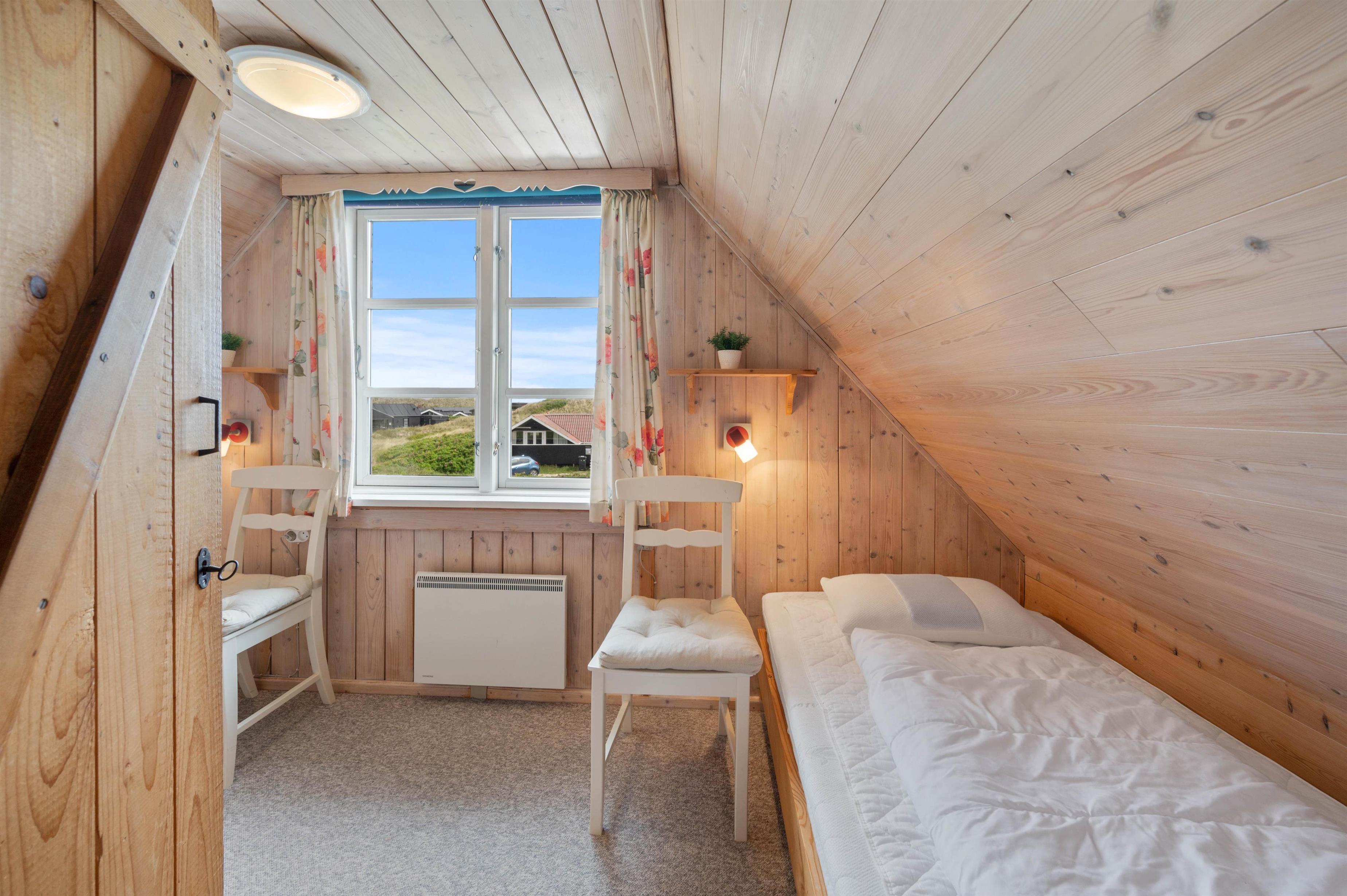 Førstesalen indeholder 2 soveværelser og en charmerende repos med et par gode stole, hvor du kan sidde med en god bog og en kop te. Fra det ene soveværelse er der endvidere udgang til en lille svalegang, hvor I kan nyde udsigten over det betagende klitlandskab.