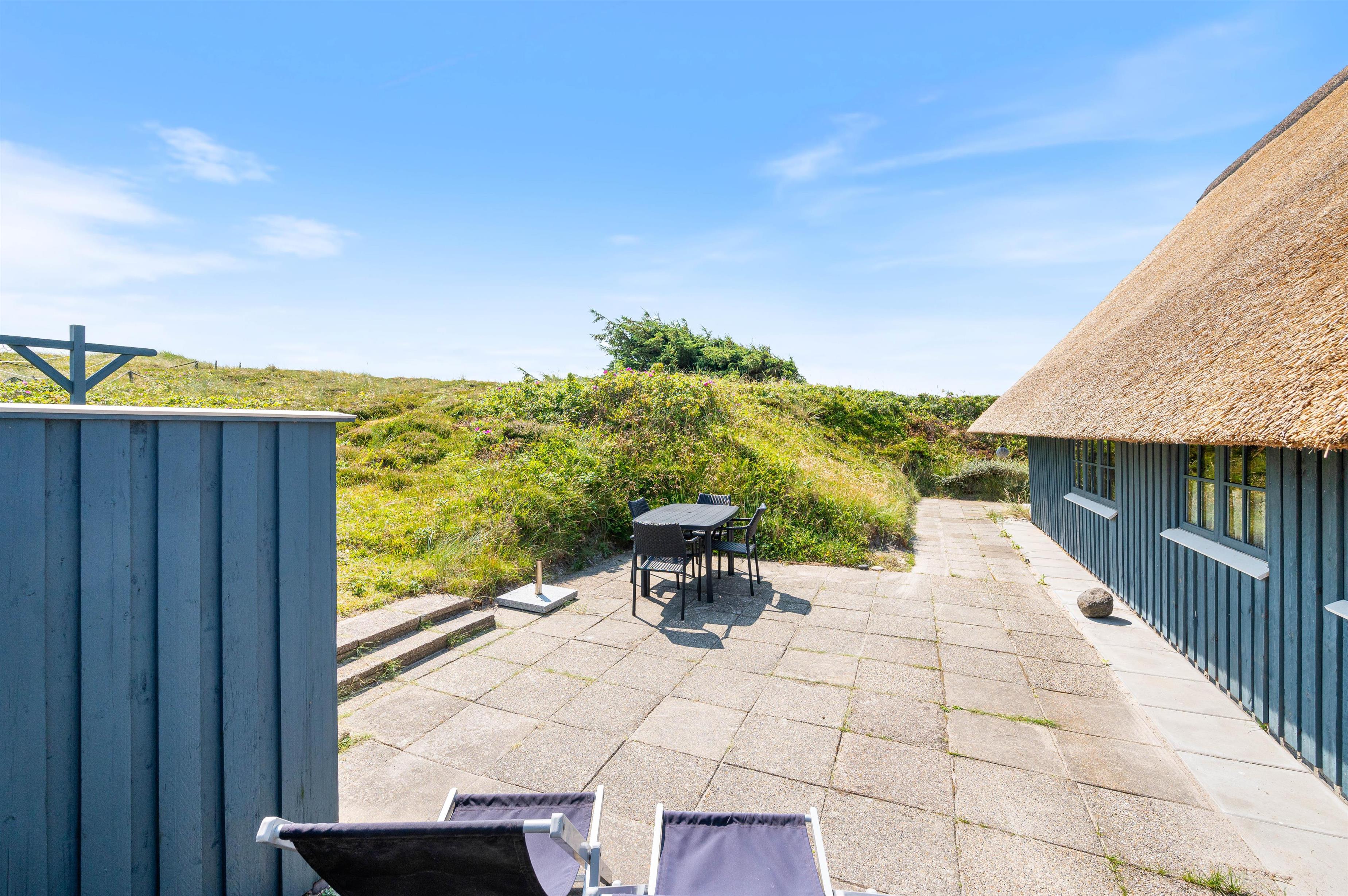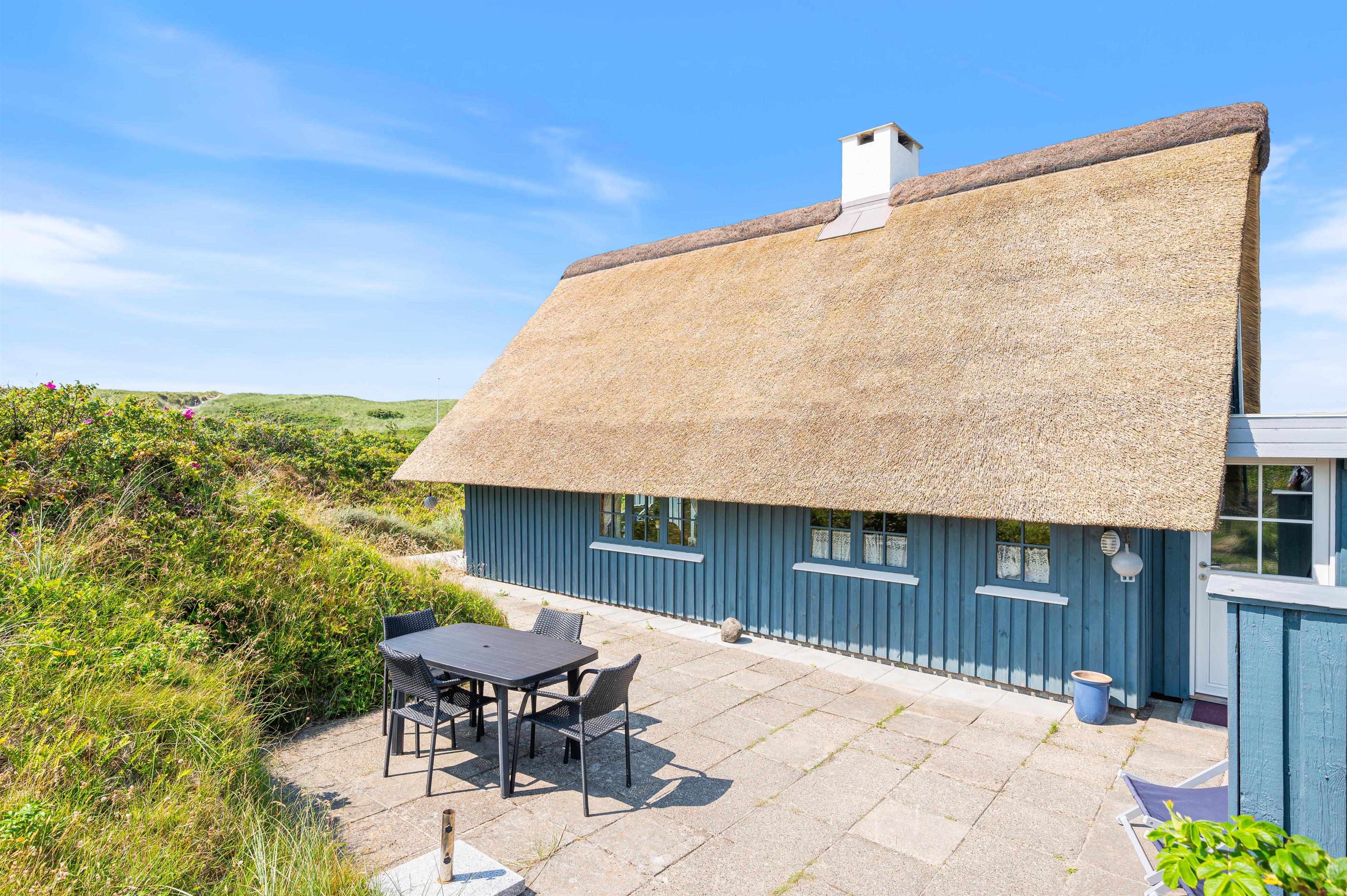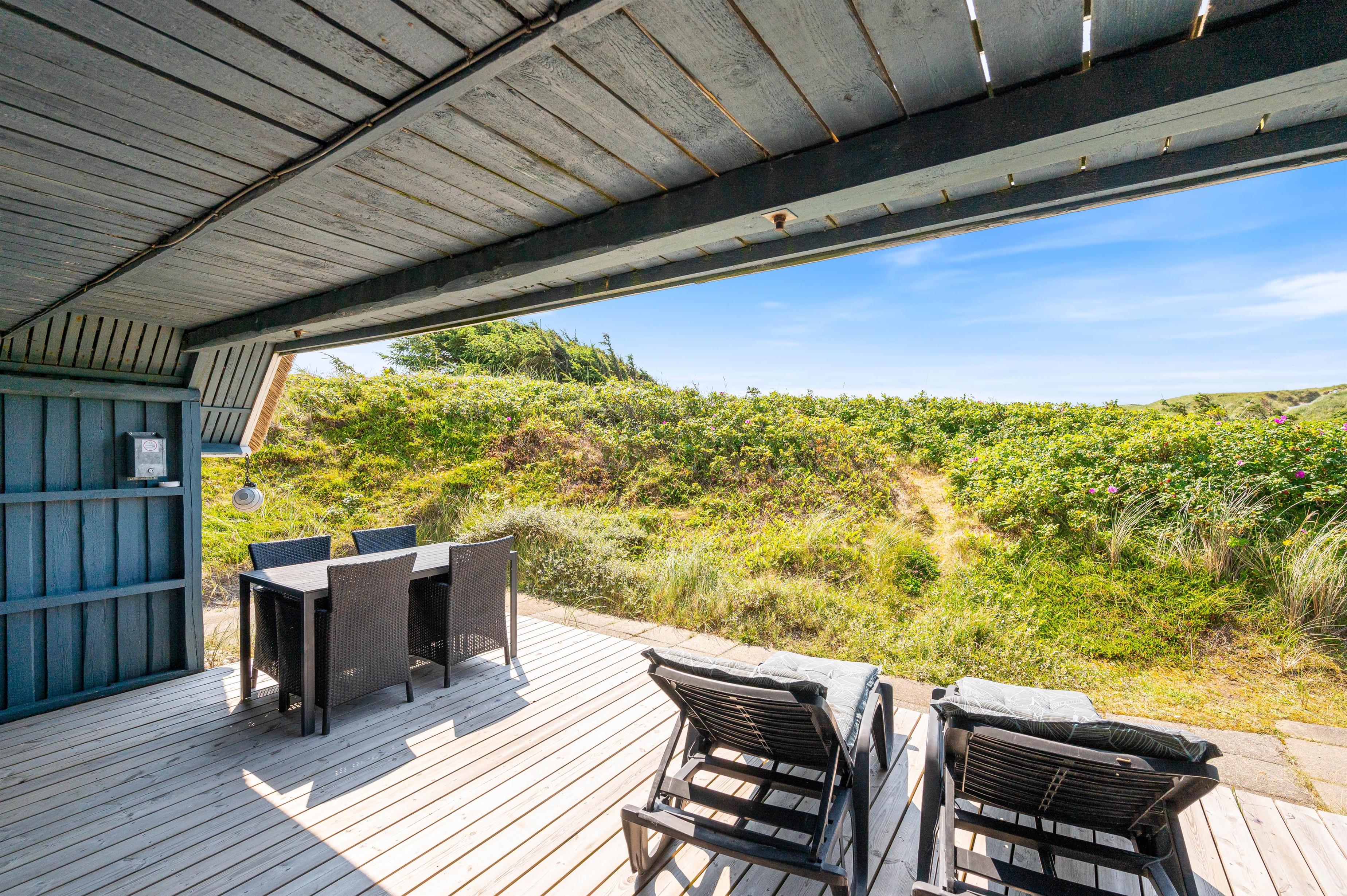 Julianevej 142 ligger kun 150 meter fra Vesterhavet og den kilometerlange hvide sandstrand. Den delvist afskærmede og overdækkede terrasse inviterer til afslapning i solen i komfortable havemøbler. Eller I kan tilberede og nyde et lækkert grillmåltid i den friske luft.