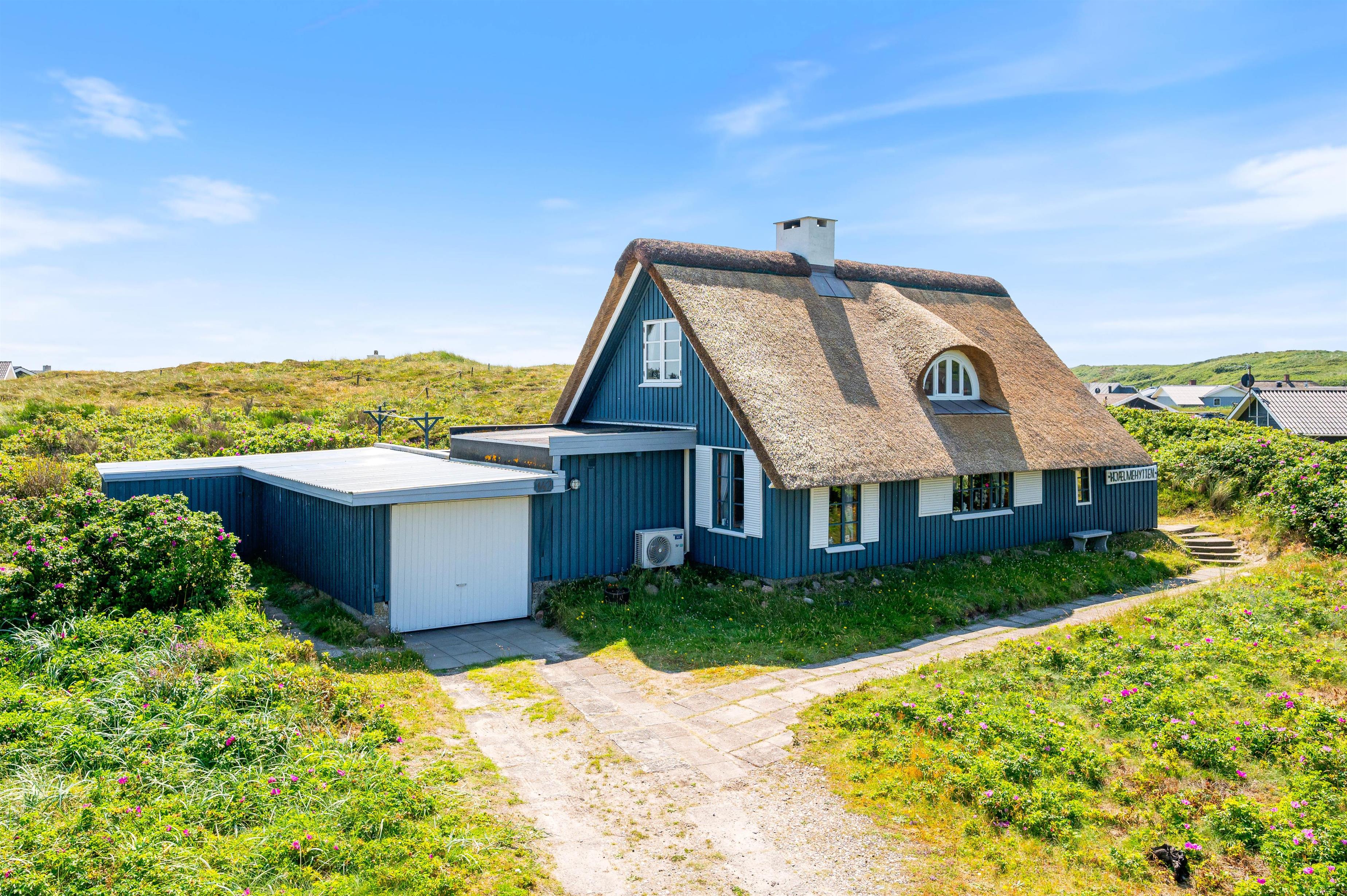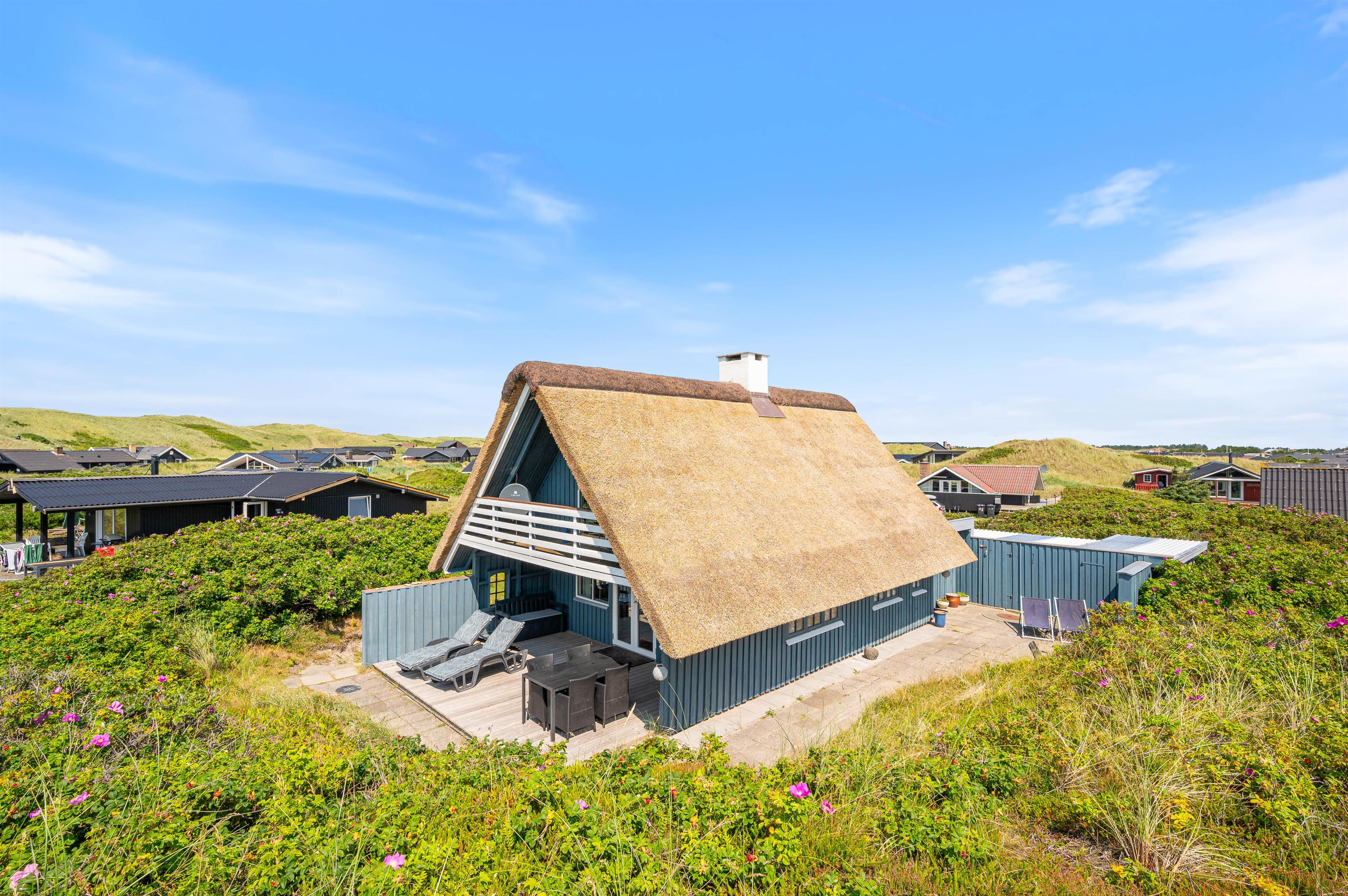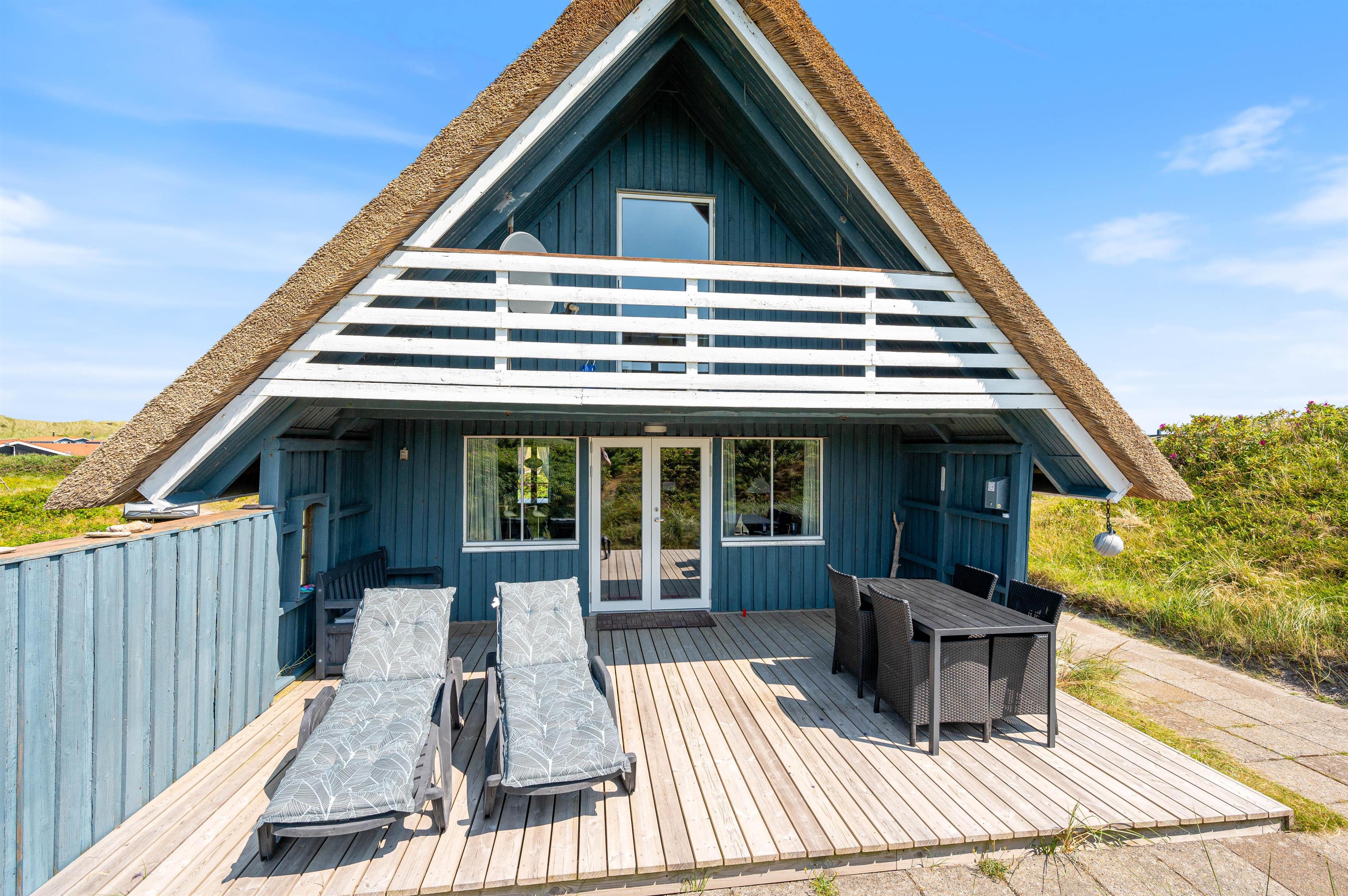 Julianevej 142 ligger kun 150 meter fra Vesterhavet og den kilometerlange hvide sandstrand. Den delvist afskærmede og overdækkede terrasse inviterer til afslapning i solen i komfortable havemøbler. Eller I kan tilberede og nyde et lækkert grillmåltid i den friske luft.