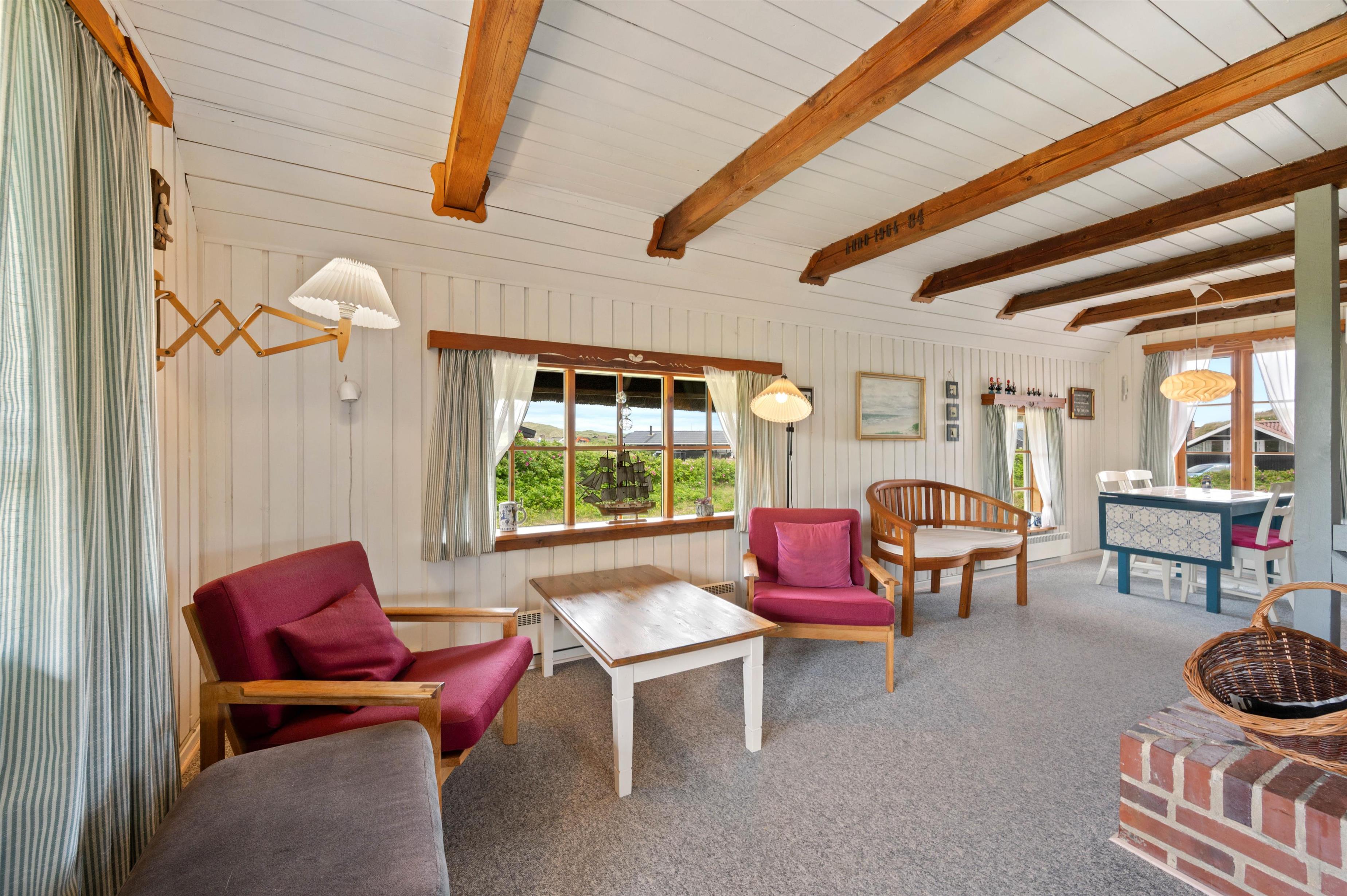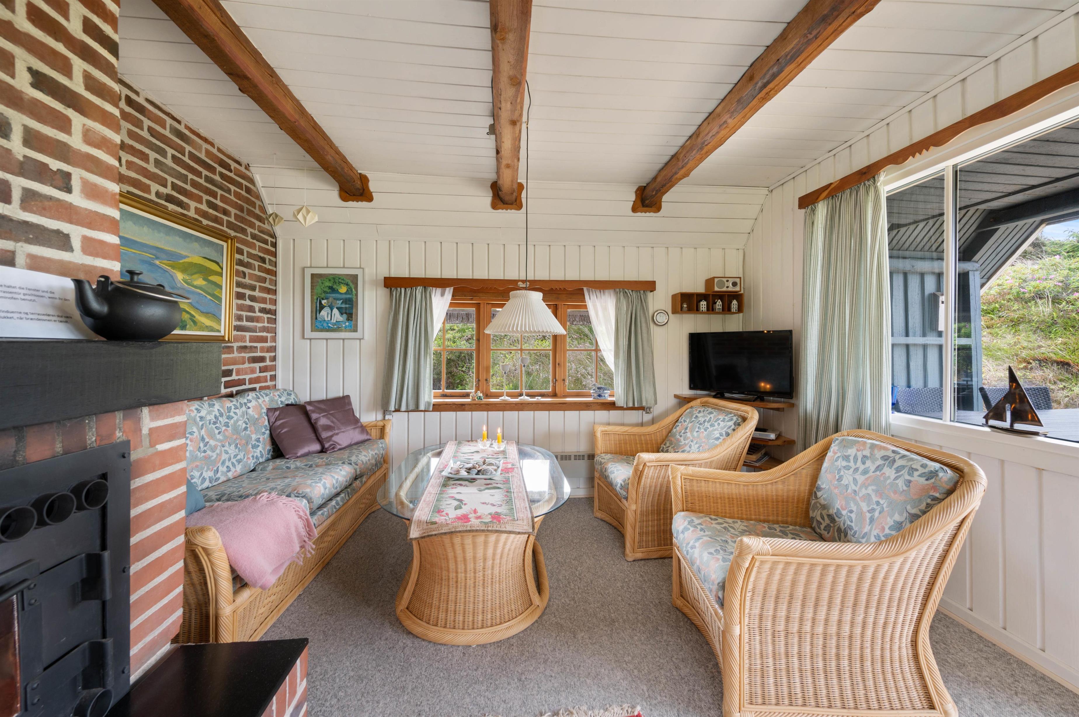 Feriehuset er dekorativt indrettet med personlig stemning og charme. I stueetagen er der hvidmalede trævægge i kombination med murstensvægge. På gulvene er der klinker, træ og tæpper, og de synlige bjælker i loftet fremhæver sommerhusets stil. Møblerne er tilpasset stilen med retro træmøbler, fletstole og sofa. Her finder I et badeværelse med bruser, et lyst og praktisk indrettet køkken og stue med spiseplads, brændeovn, fladskærms-TV og en hyggelig sofagruppe.