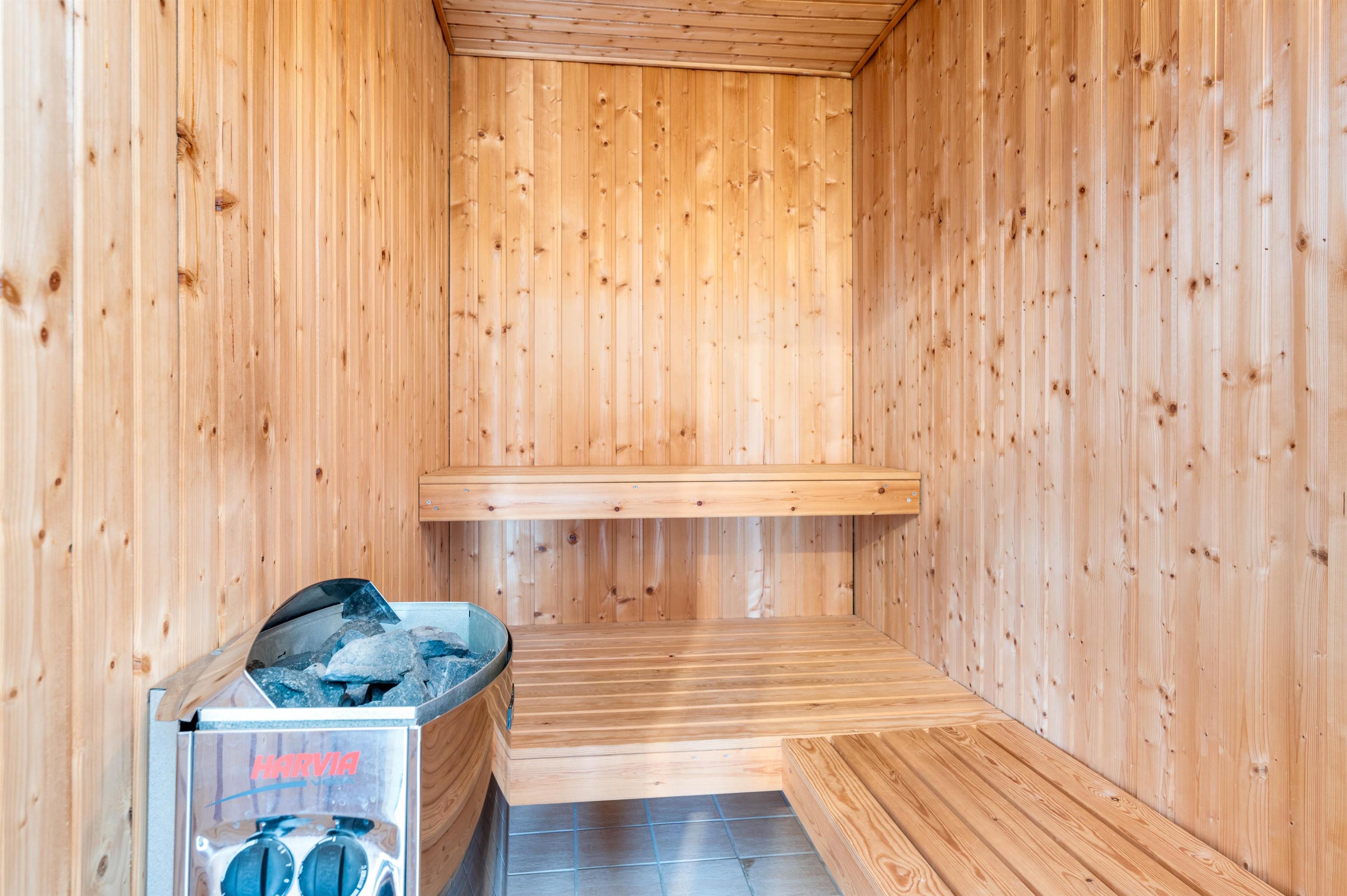 Det store badeværelse, som er udstyret med 2-personers spa og stor sauna, har gulvvarme. Her findes både vaskemaskine og tørretumbler. Desuden har sommerhuset et praktisk gæstetoilet, så der ikke opstår kø fra morgenstunden.