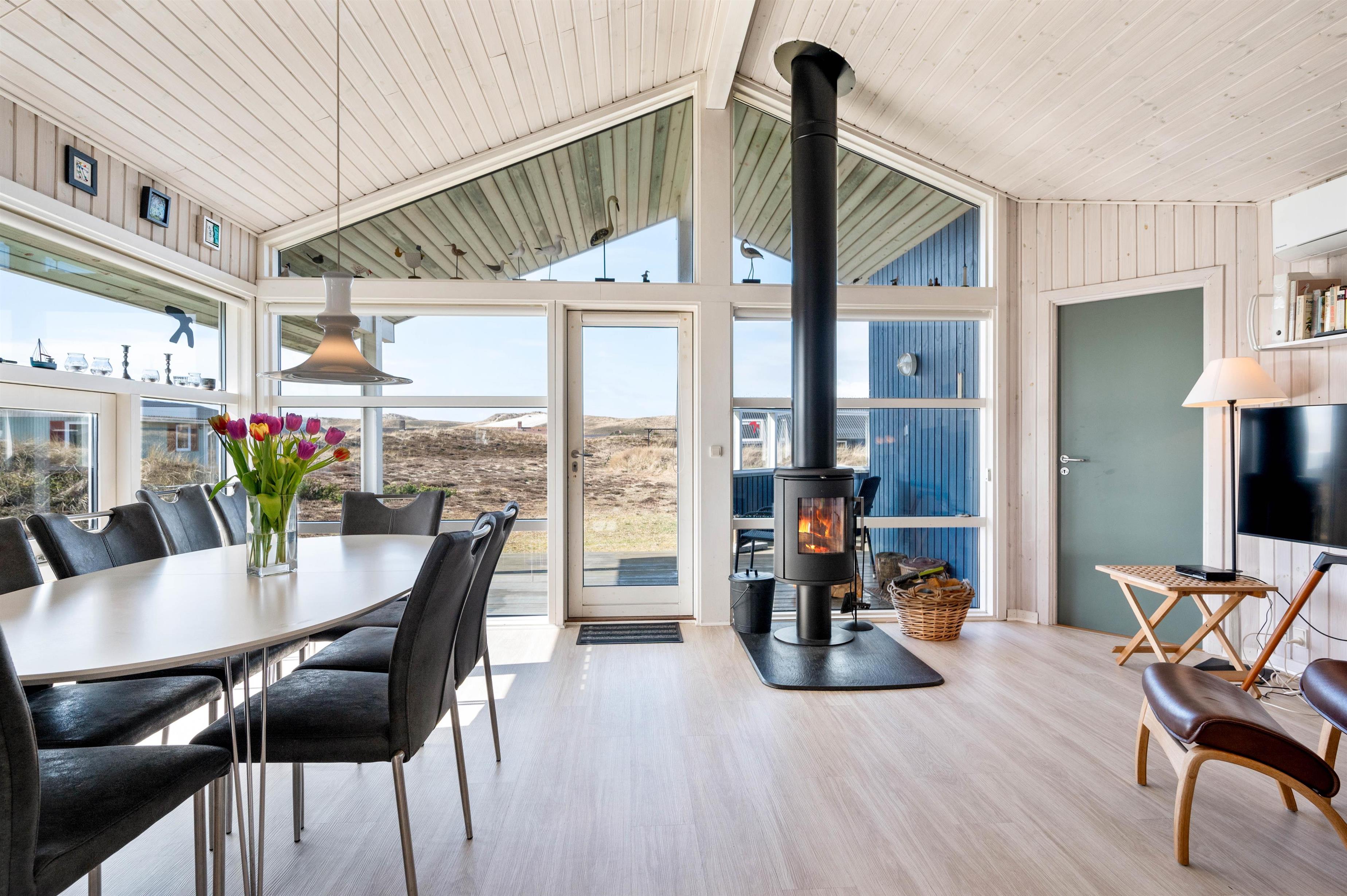 Dette lyse og venlige feriehus er flot indrettet med loft til kip og lyse træbeklædte vægge. Det veludstyrede køkken står i åben forbindelse med den store og hyggelige stue, hvor brændeovnen skaber ægte sommerhushygge. Herfra kan I nyde udsigten over det smukke naturområde ved Arvidvej i Bjerregård. Her får I gratis trådlåst internet samt en energibesparende varmepumpe, der sørger for et behageligt indeklima.