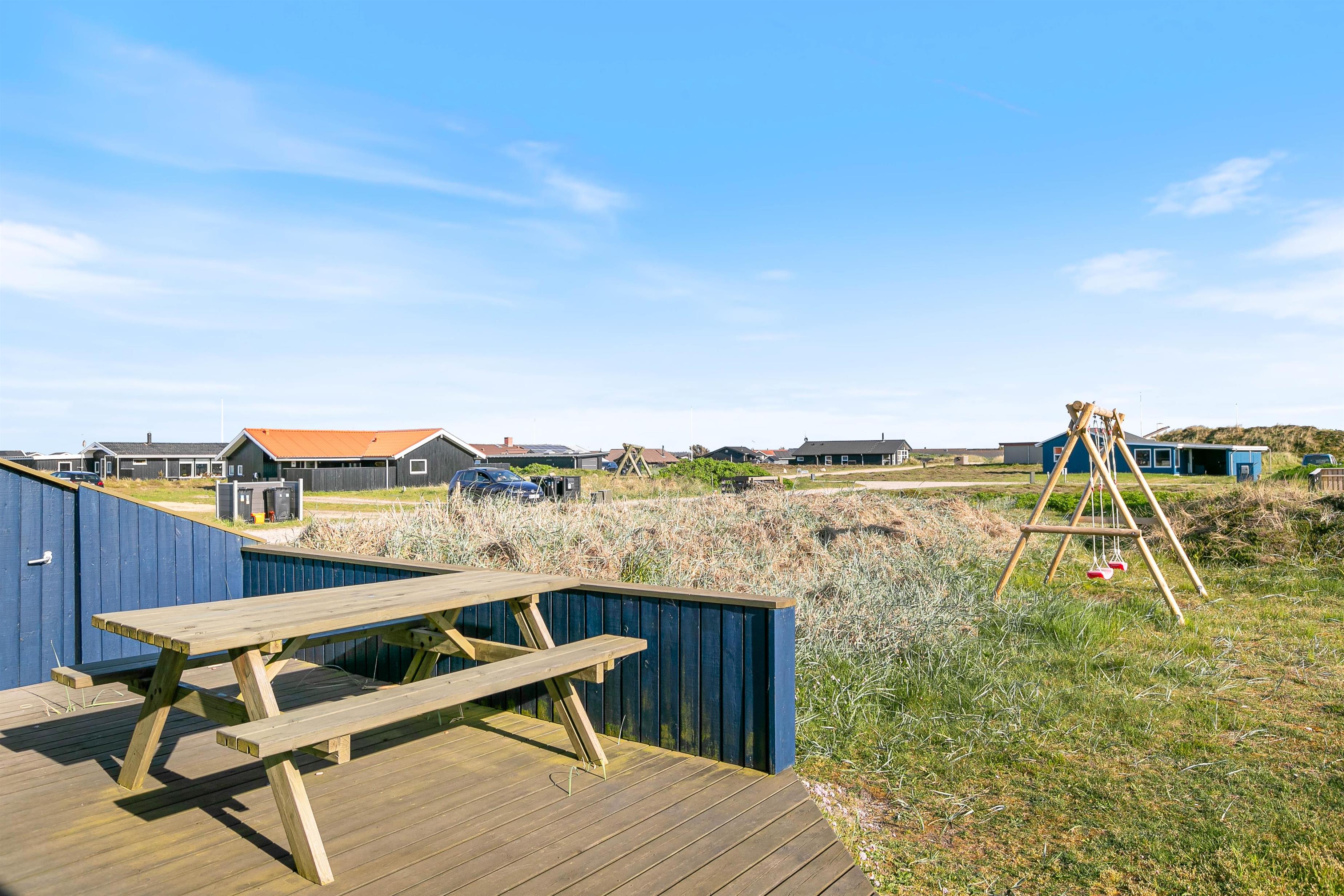 Rundt om sommerhuset finder I flere hyggelige, afskærmede terrasser med gode havemøbler, liggestole og grill. For de mindste er der både gyngestativ og sandkasse på naturgrunden. Fra alle terrasser kan I nyde udsigten til det skønne landskab, som indbyder til en travetur med børn og hund.