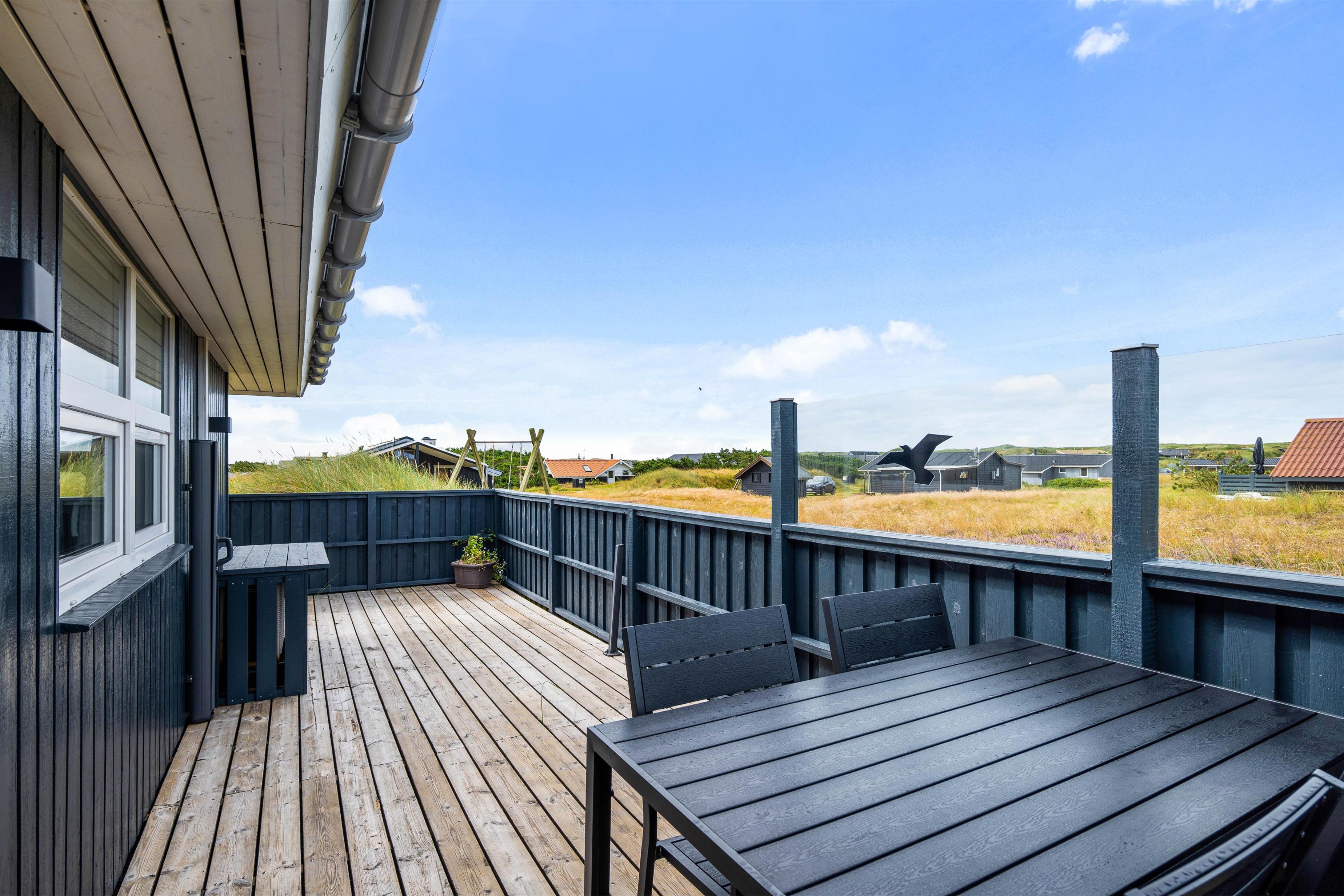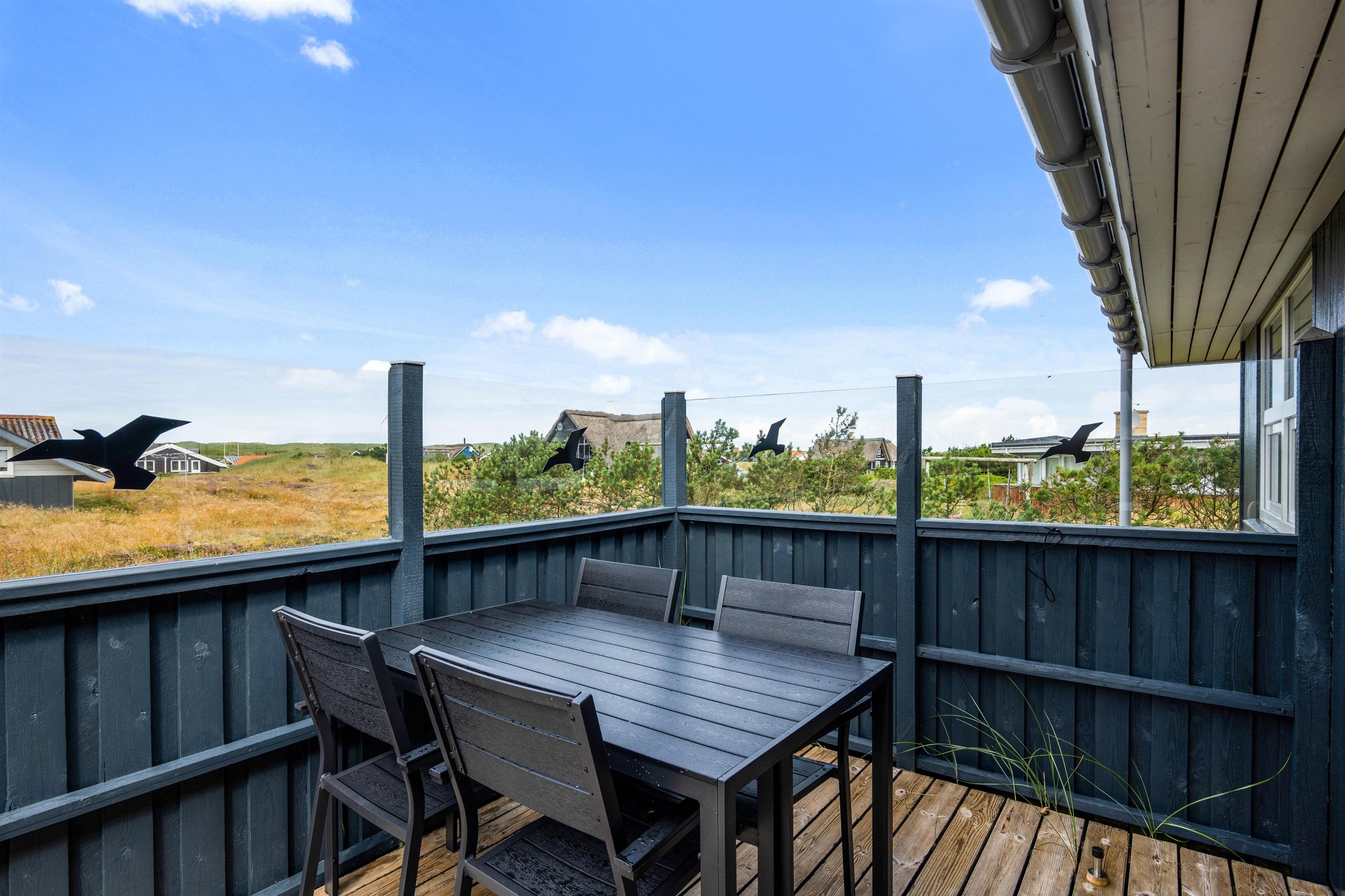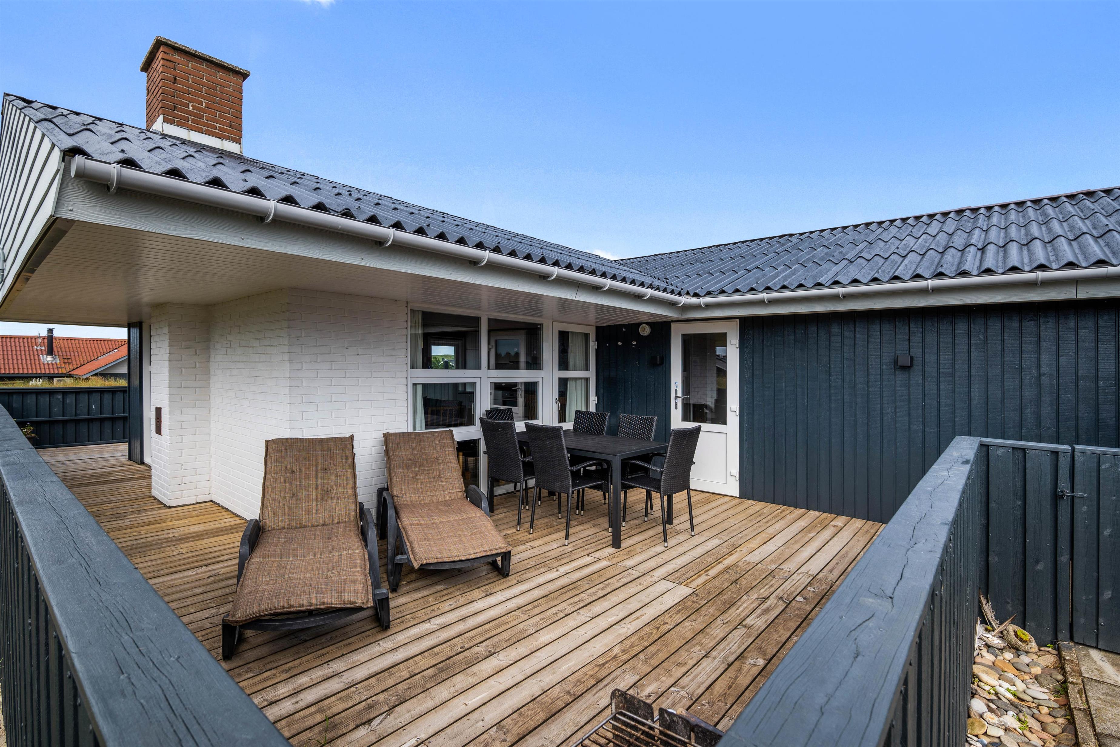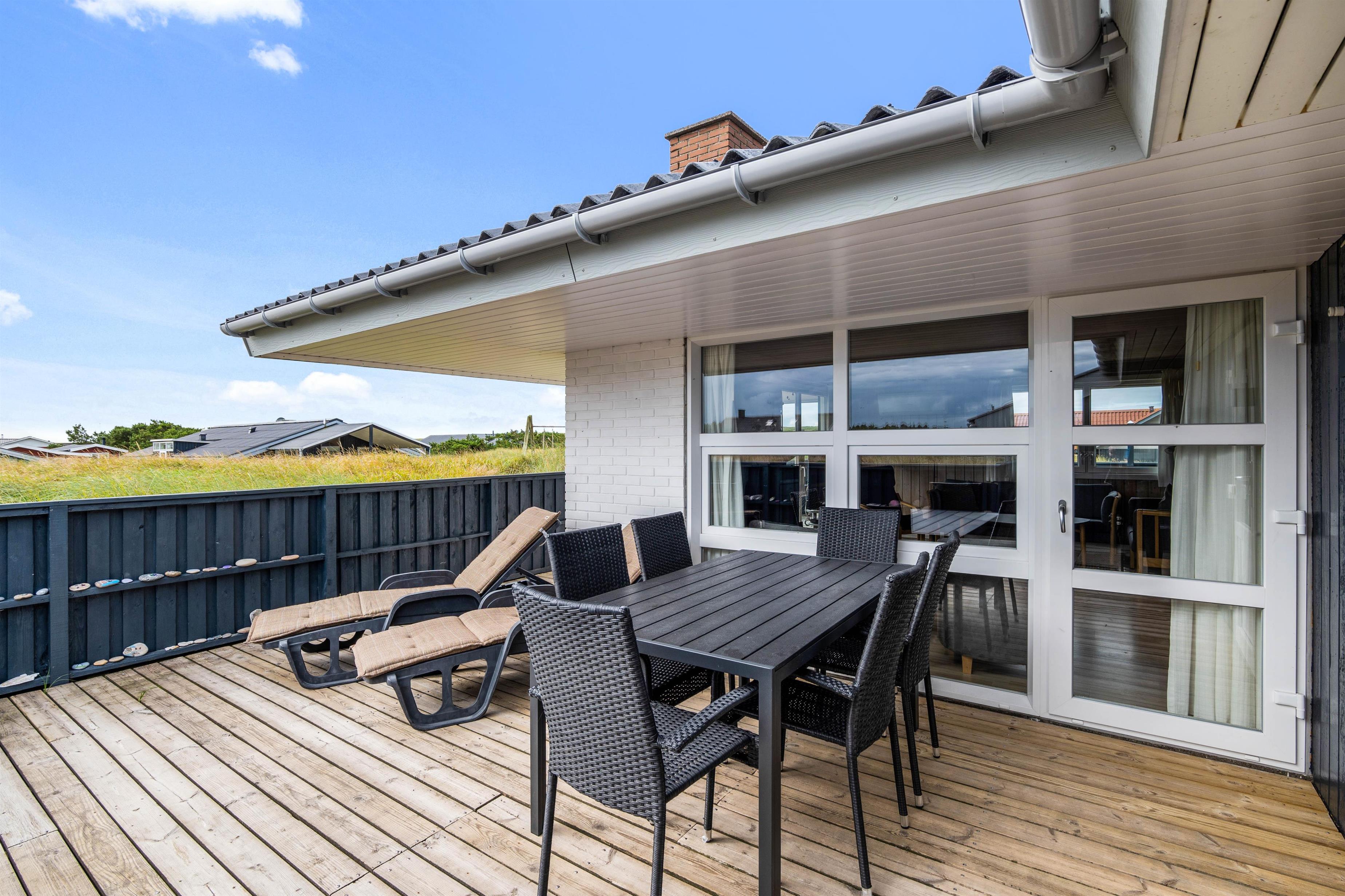 Terrassen er dejlig stor, så der er god plads til både solbadning og grillhygge. Og da terrassen strækker sig omkring sommerhuset, kan man flere steder finde god læ. Og skulle det danske sommervejr blive drilsk, kan man sætte sig under terrassens overdækning, og stadig nyde den friske luft på terrassen.