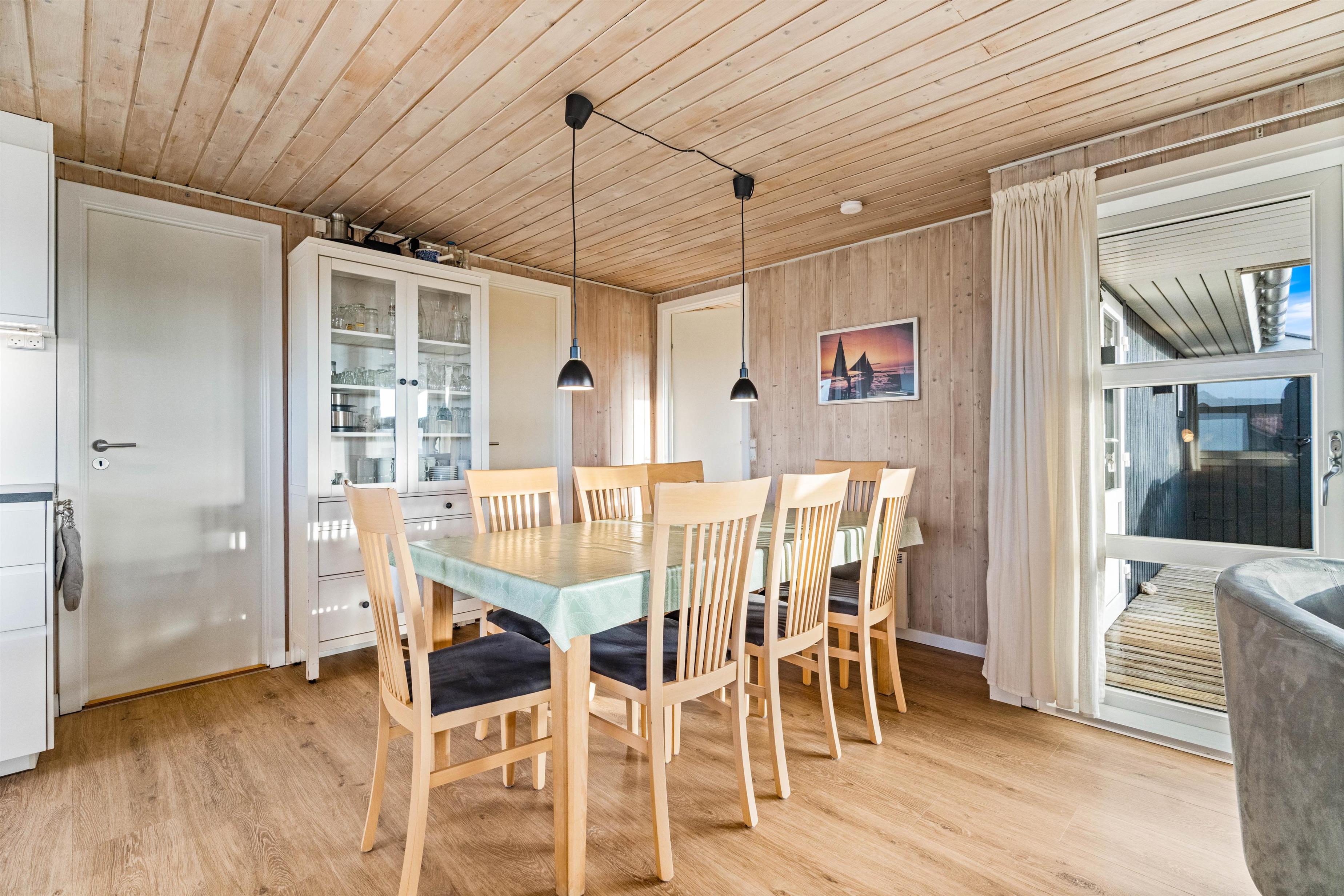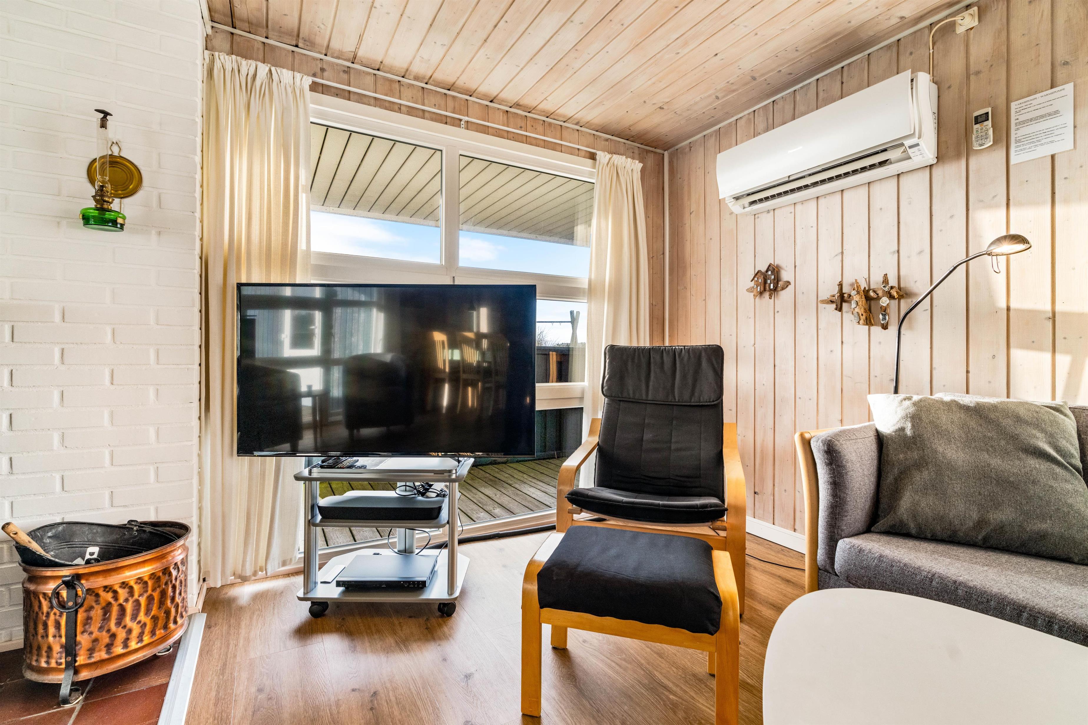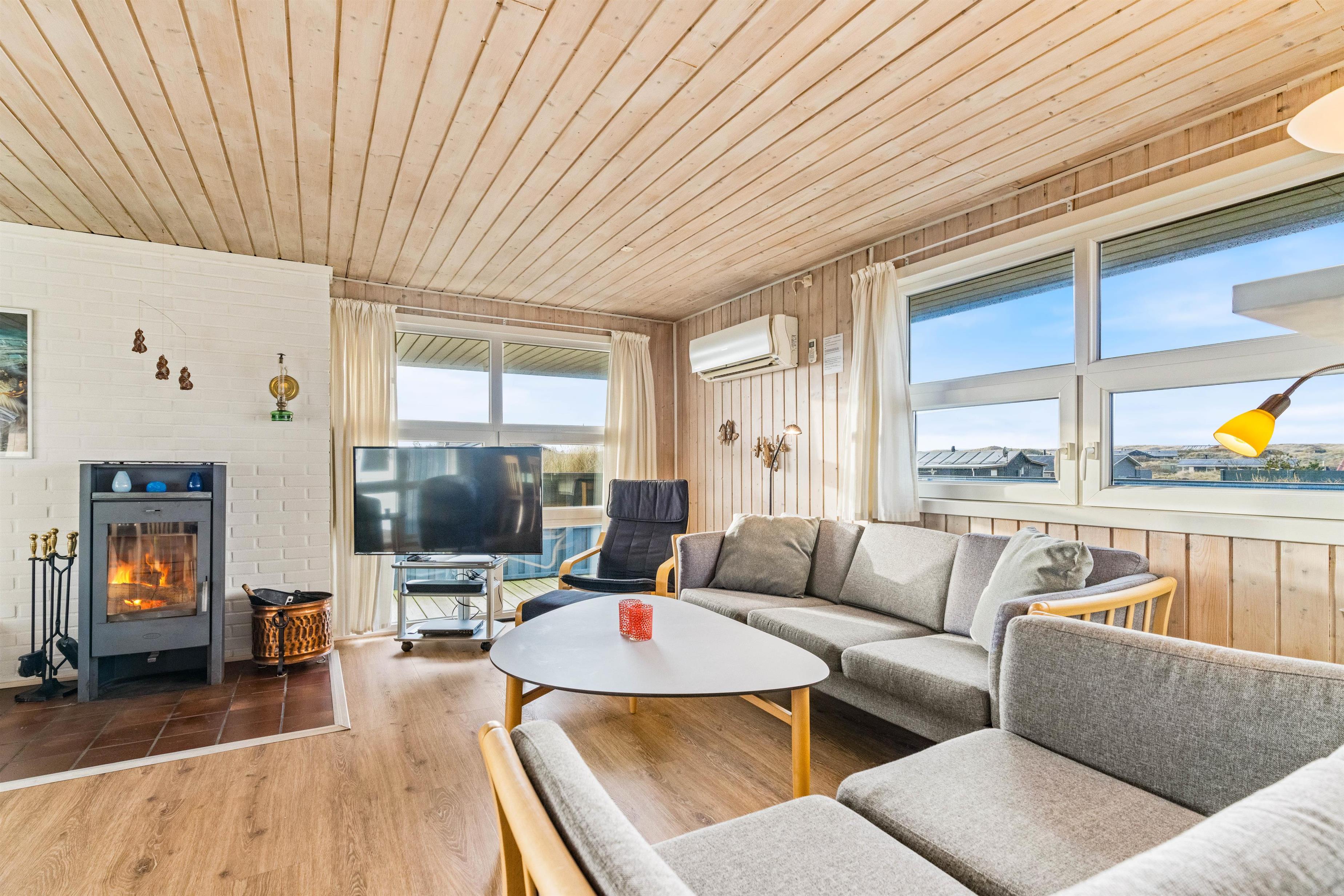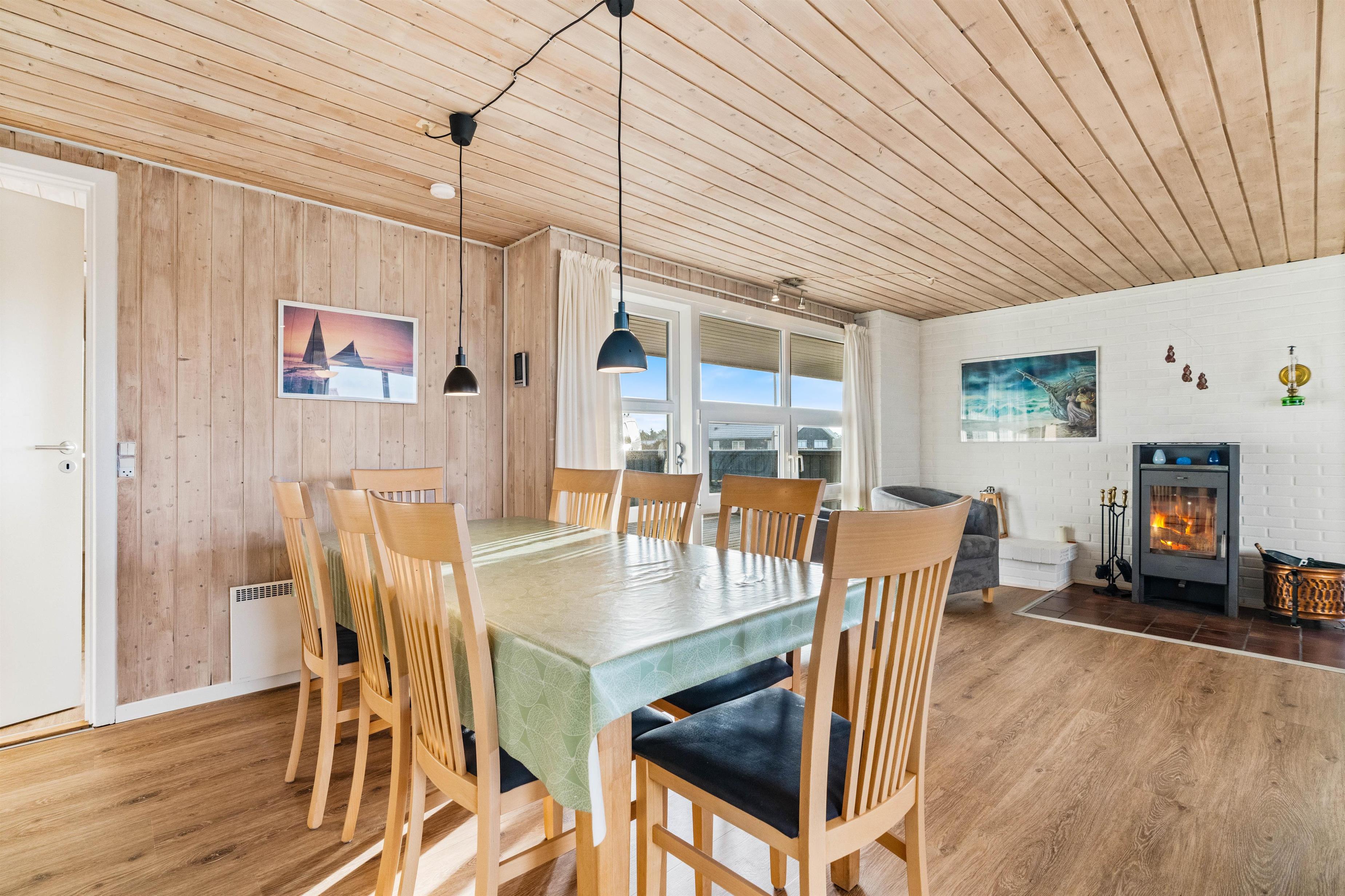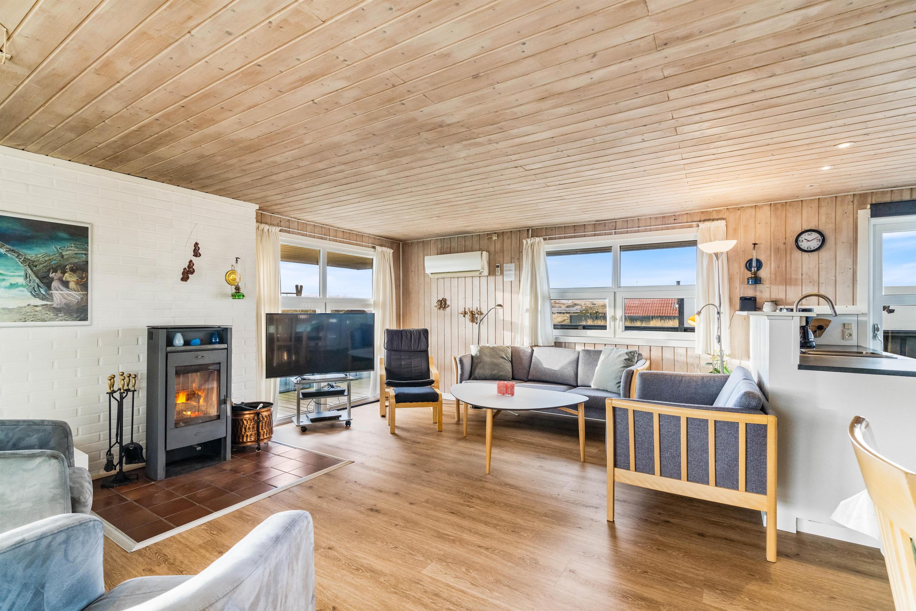 Sommerhuset er velholdt, hyggeligt og godt indrettet med brændeovn, så der er plads til selv den store familie og to hunde.