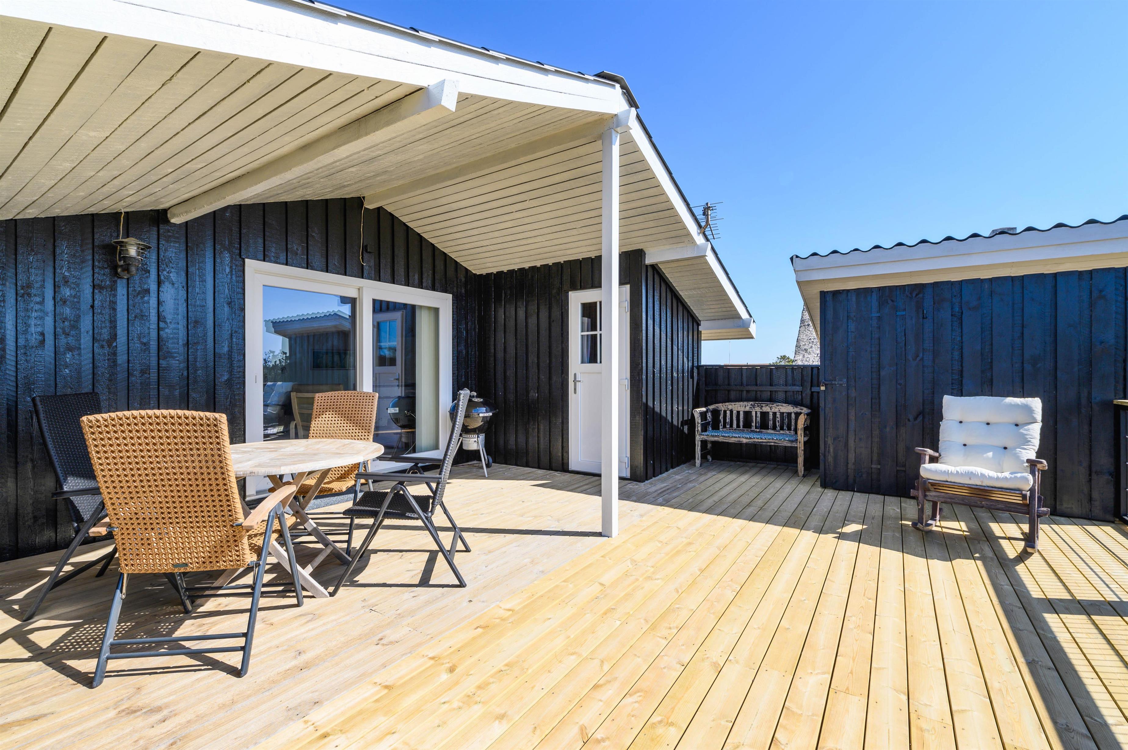 Fra opholdsrummet kan I gå ud på den skønne sydvendte terrasse, hvorfra I har en fin udsigt til naturen. Her kan I sidde i ly for vind og vejr; den er nemlig afskærmet og delvist overdækket. Her kan hunden også gå frit, da terrassen er lukket.
