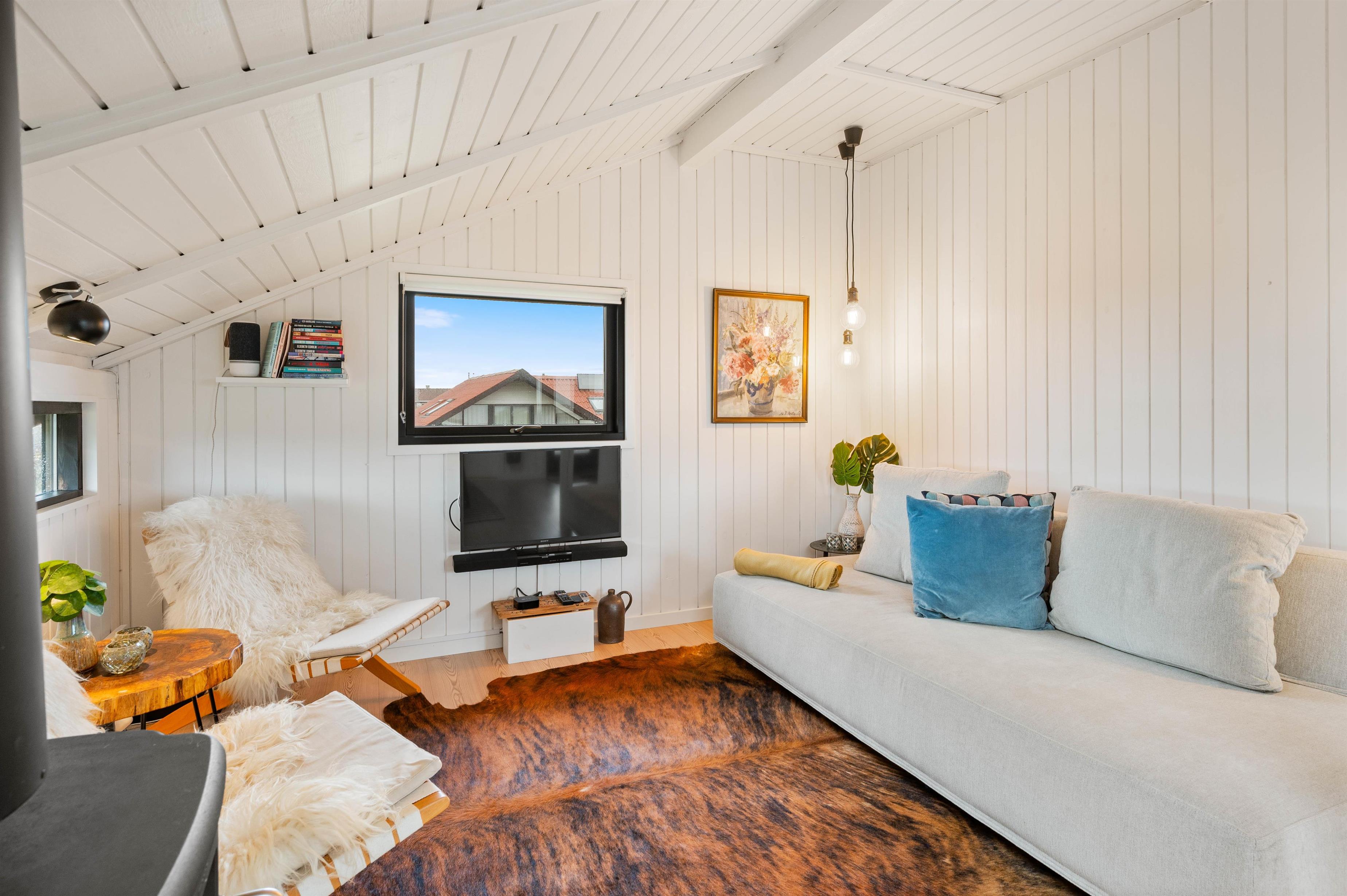 Fra det lyse og praktiske køkken er der åbent ind til stuen, hvor I kan nyde en god kop kaffe foran brændeovnen, mens ungerne hygger sig med sommerhusets Playstation 4. Her har I også mulighed for at bruge Apple TV.