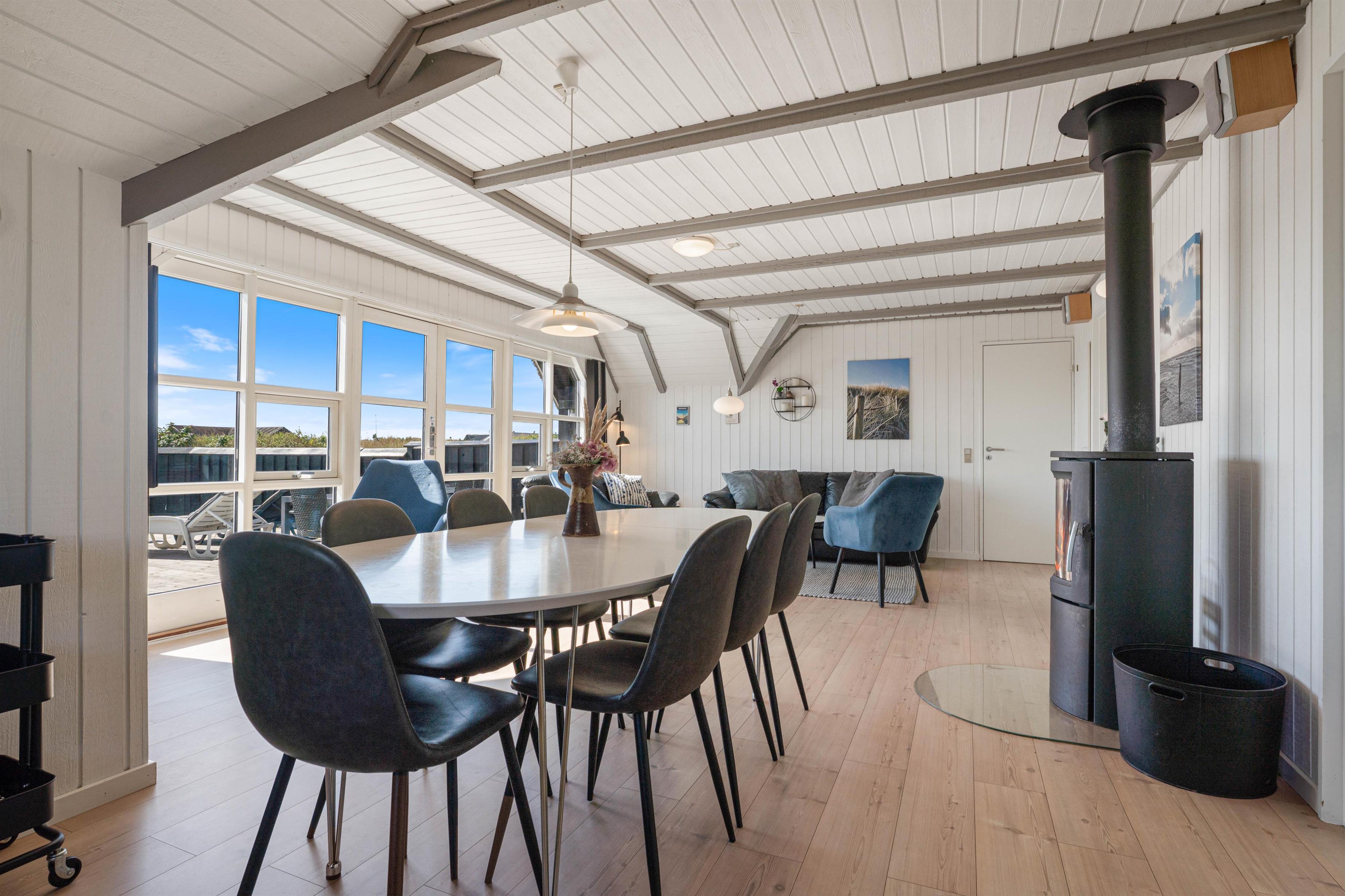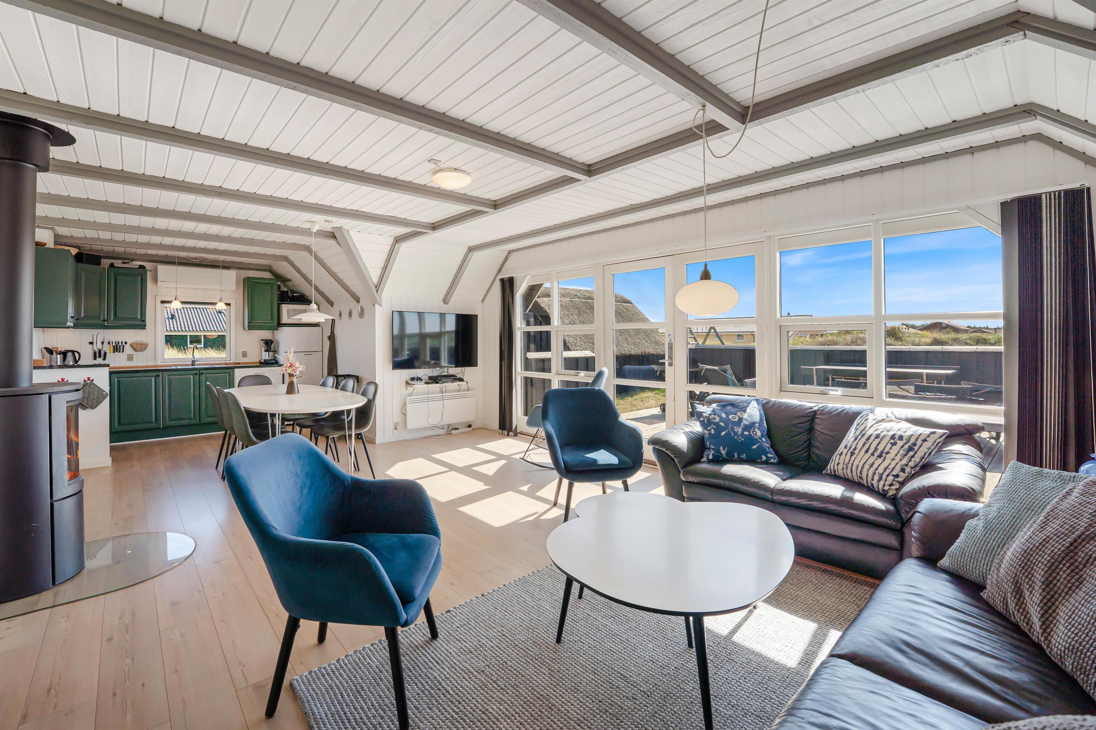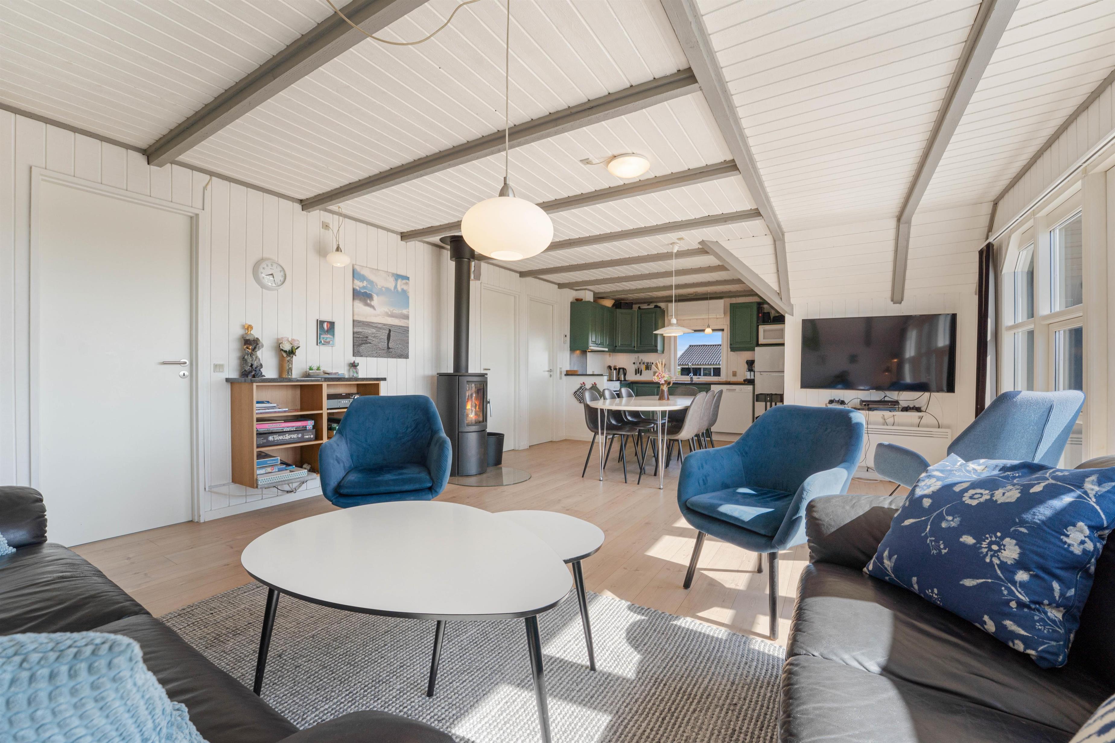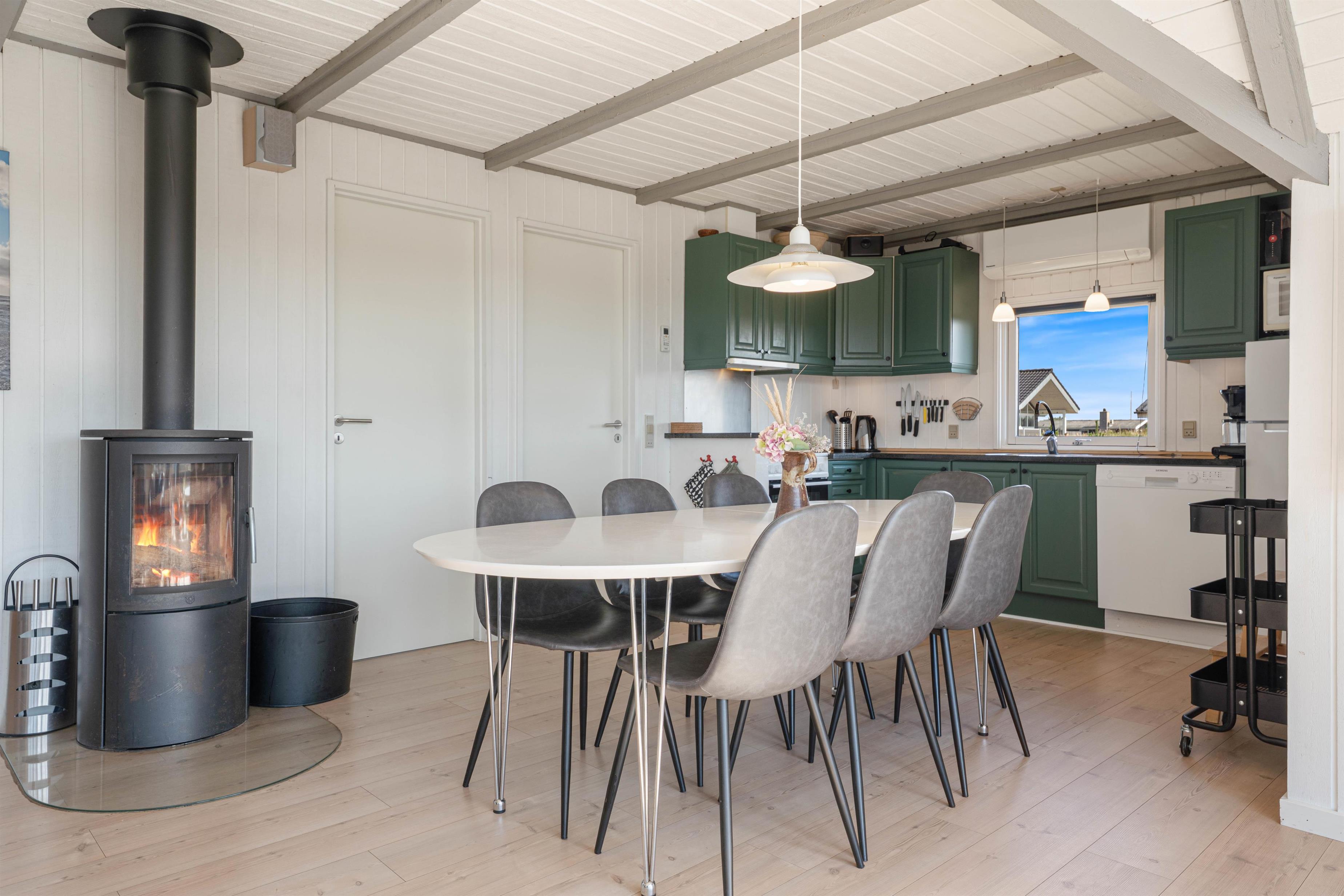 Dette hyggelige feriehus indeholder et funktionelt køkken, åbent til spise- og opholdsafdeling med TV, Chromecast, dvd, radio, trådløst internet og ikke mindst en god brændeovn. Køkkenet indeholder alt, hvad du skal bruge for at tilberede lækre måltider – og især lystfiskeren vil blive glad for den separate fryser på 40 liter. I opholdsstuen kan I samles omkring spisebordet, eller i sofagruppen ved brændeovnen.
