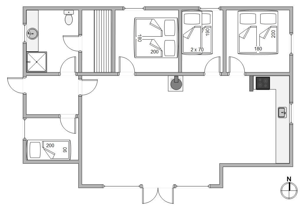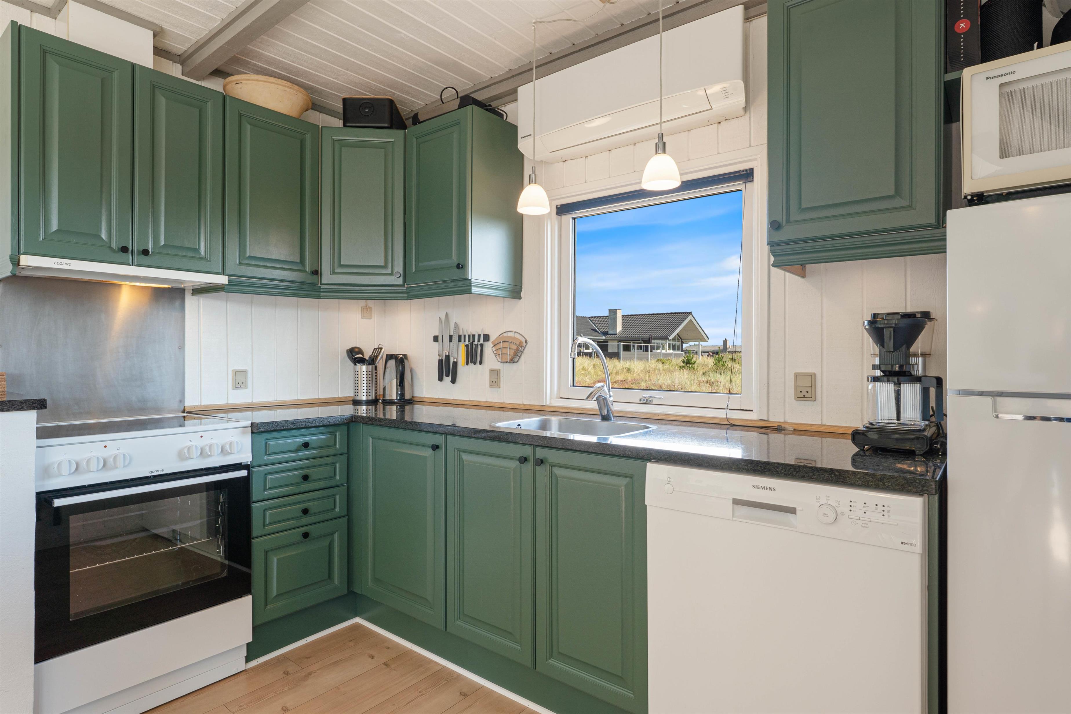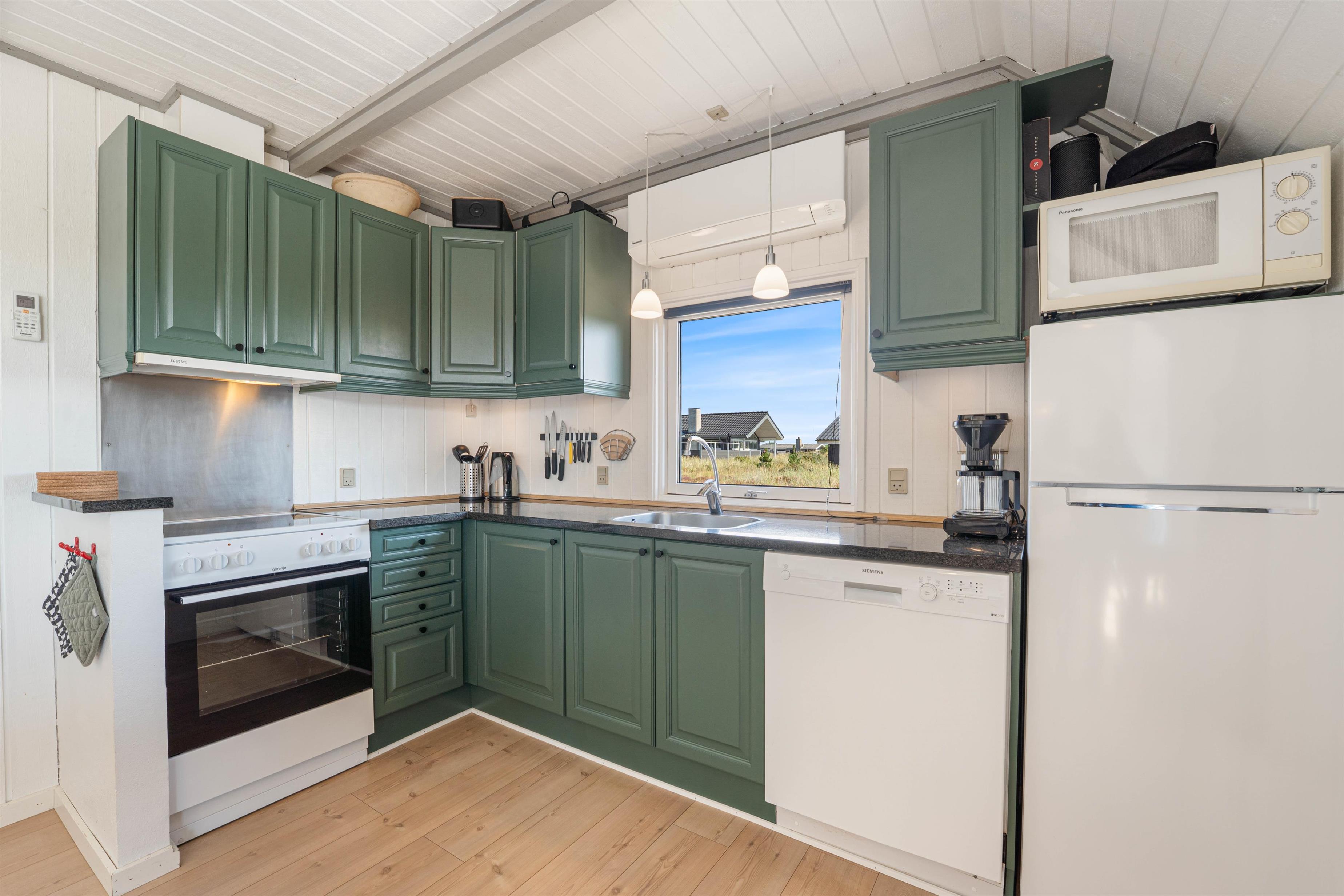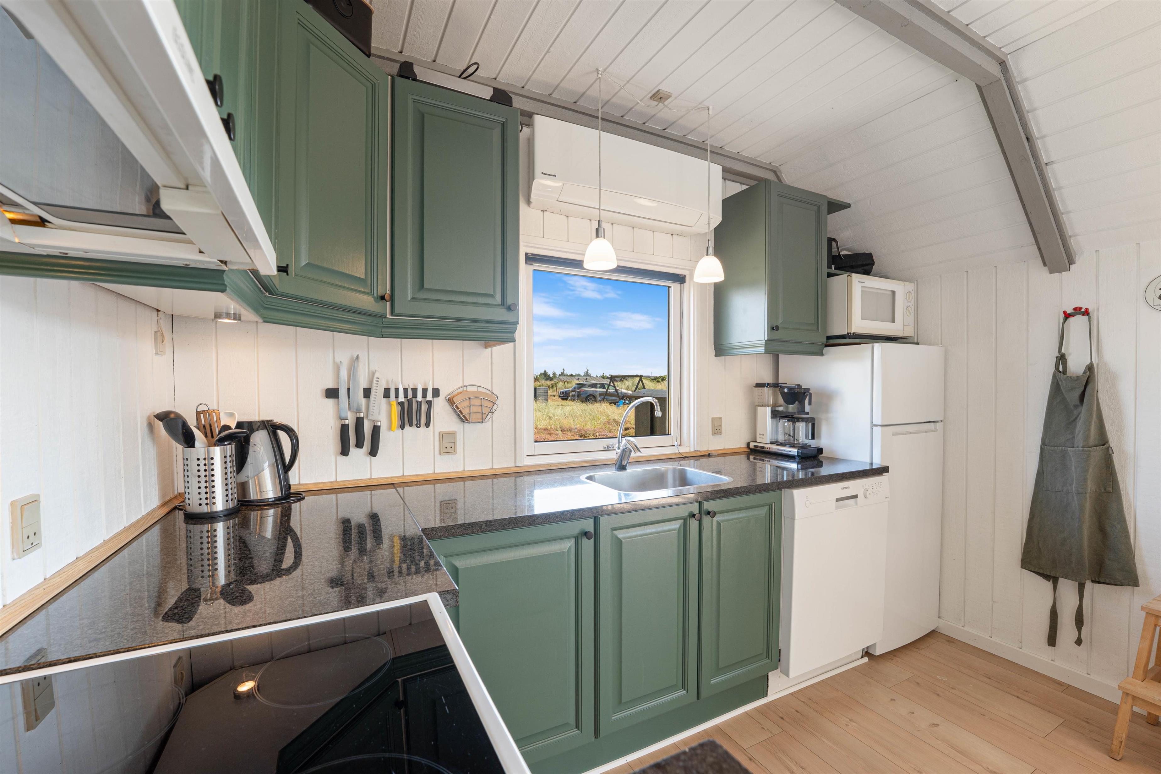 Dette hyggelige feriehus indeholder et funktionelt køkken, åbent til spise- og opholdsafdeling med TV, Chromecast, dvd, radio, trådløst internet og ikke mindst en god brændeovn. Køkkenet indeholder alt, hvad du skal bruge for at tilberede lækre måltider – og især lystfiskeren vil blive glad for den separate fryser på 40 liter. I opholdsstuen kan I samles omkring spisebordet, eller i sofagruppen ved brændeovnen.