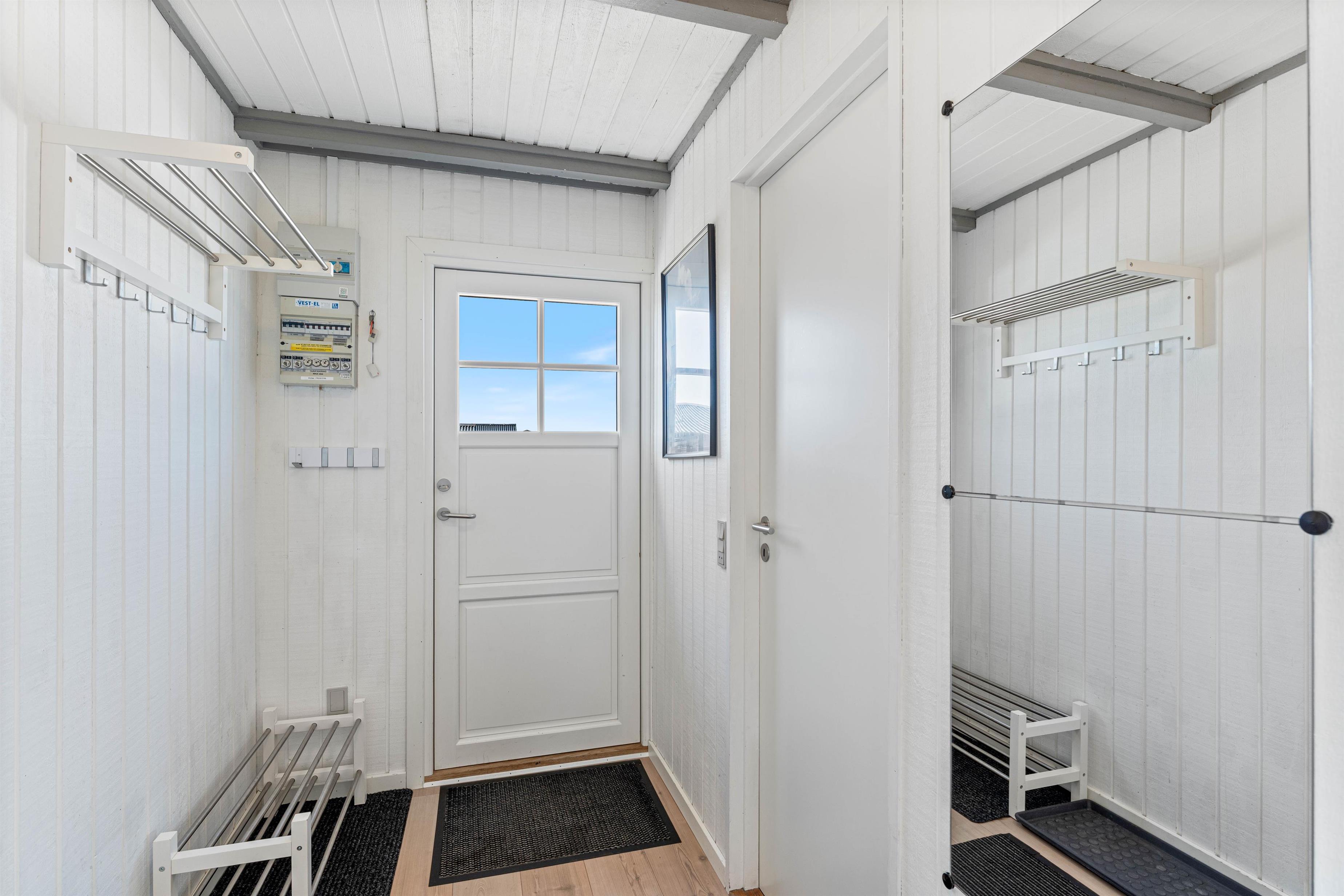 Alle opholdsrum er beklædt med hvidmalede paneler på vægge og loft samt synlige bjælker. Gulvene er belagt med lyst trælaminat, dog er badeværelset belagt med klinker og fliser. I forbindelse med badeværelset er en rummelig sauna samt vaskemaskine og tørretumbler. Til opvarmning er blandt andet en energibesparende varmepumpe.