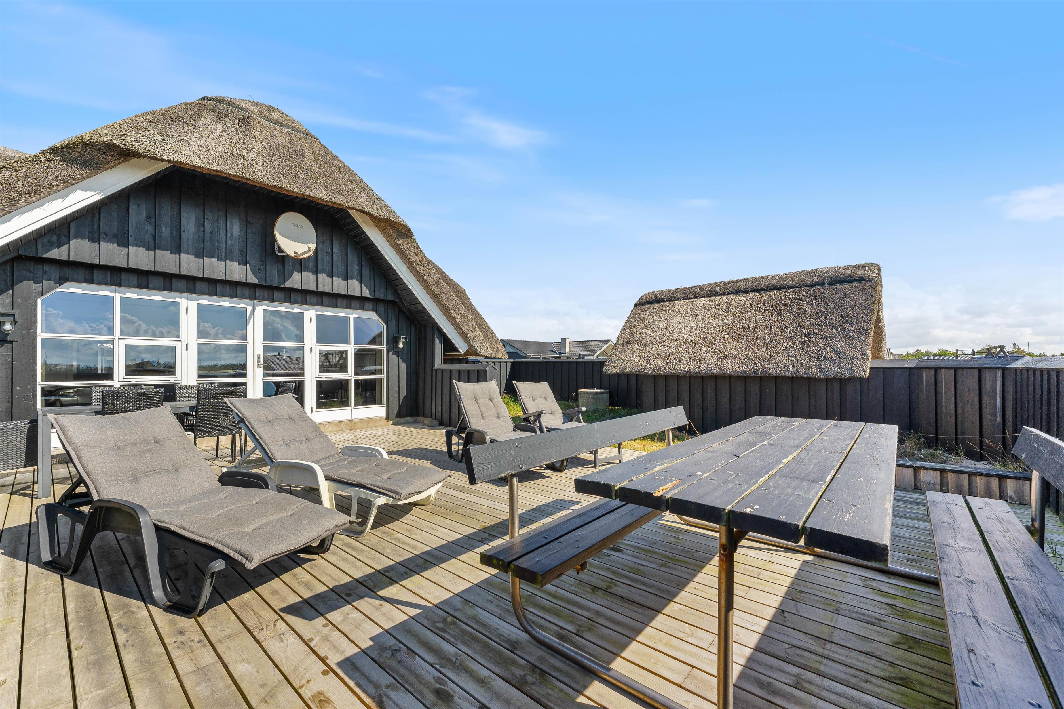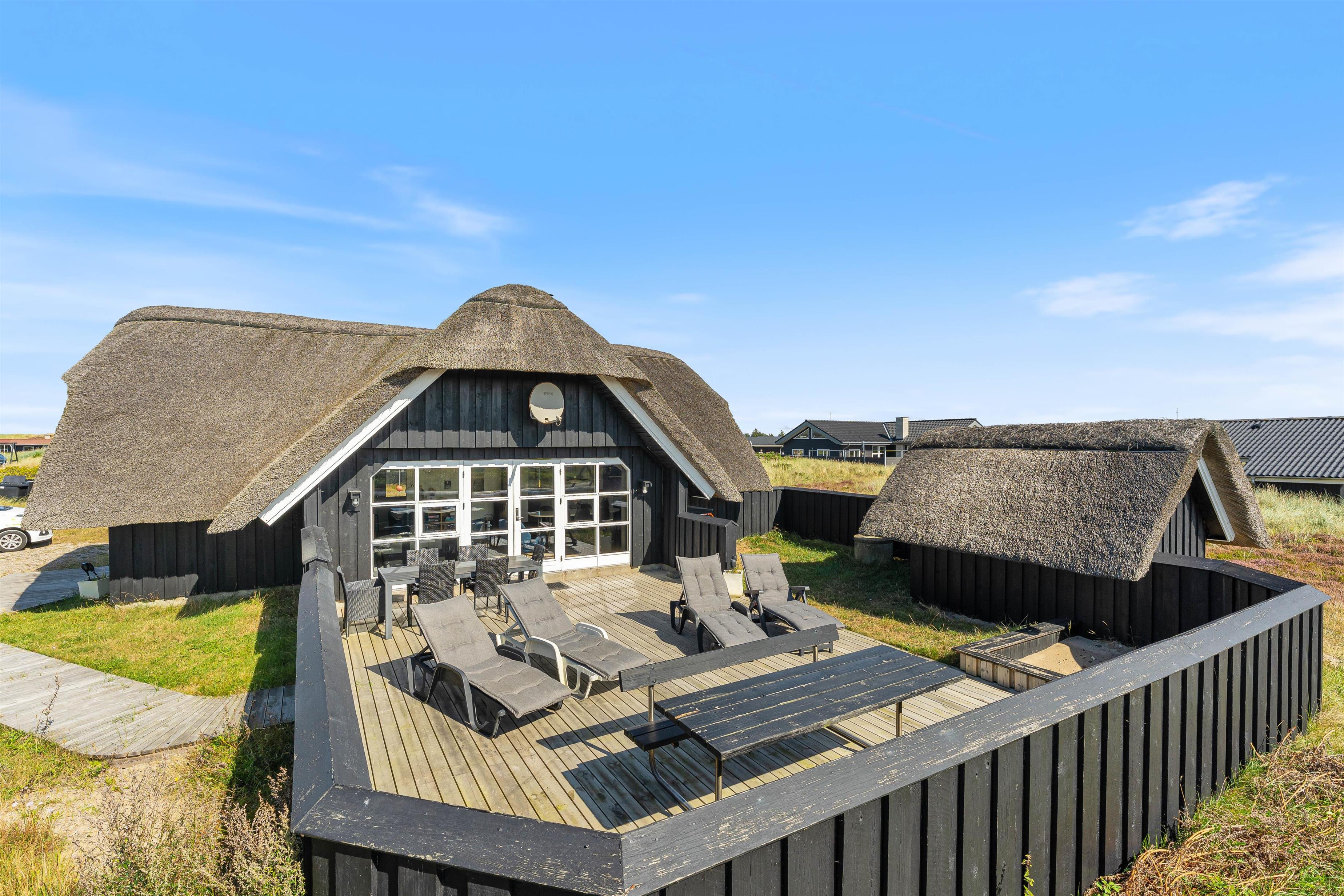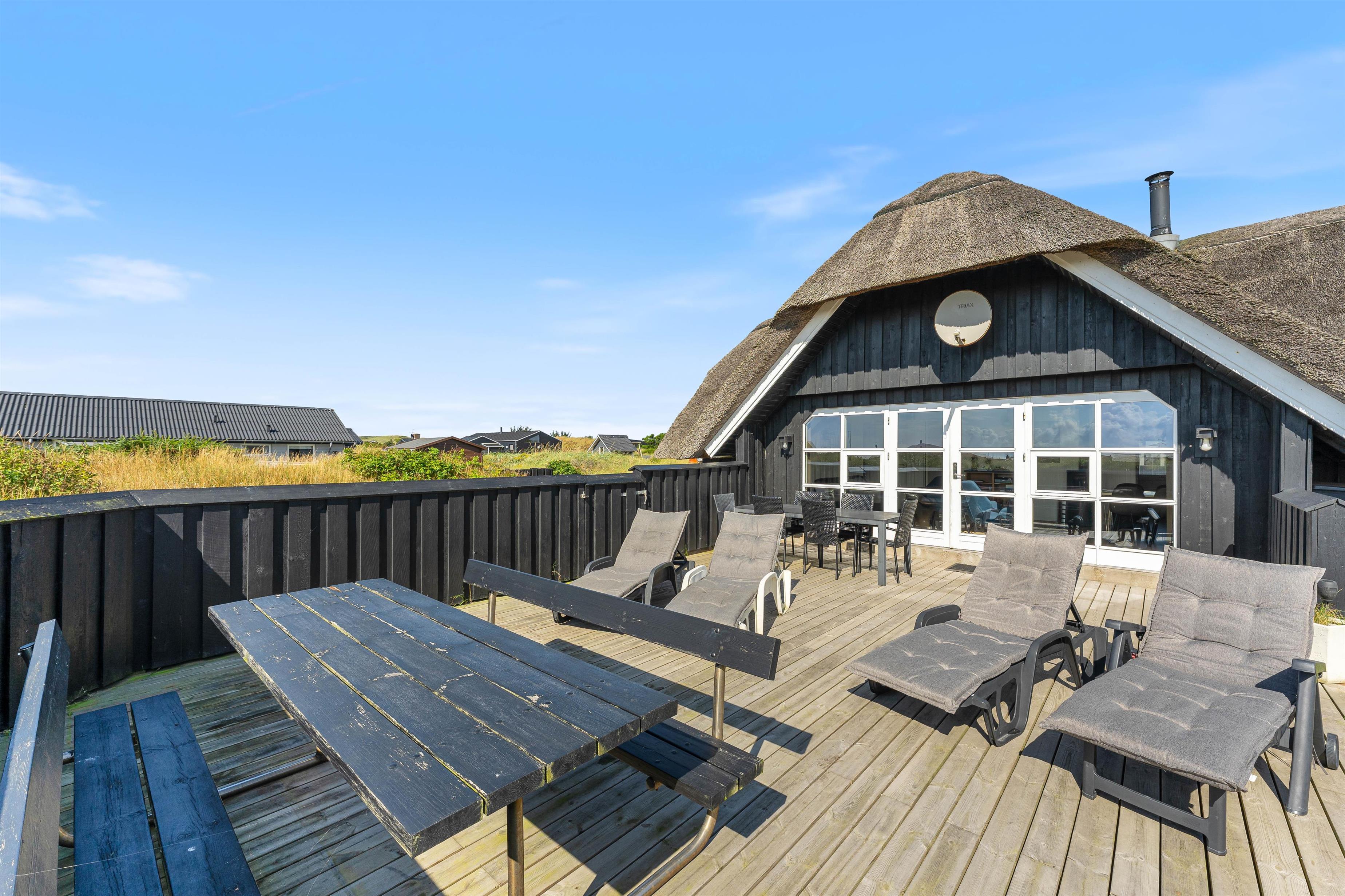 Op til 6 personer kan holde ferie i dette lyse og venligt indrettede feriehus med stråtag i Bjerregård. Sommerhuset omgives af en dejlig læfyldt og lukket terrasse, beliggende på en stor naturgrund. Kun ca. 500 m til stranden og ca. 700 m til dagligvarebutik. Din hund er også velkommen.