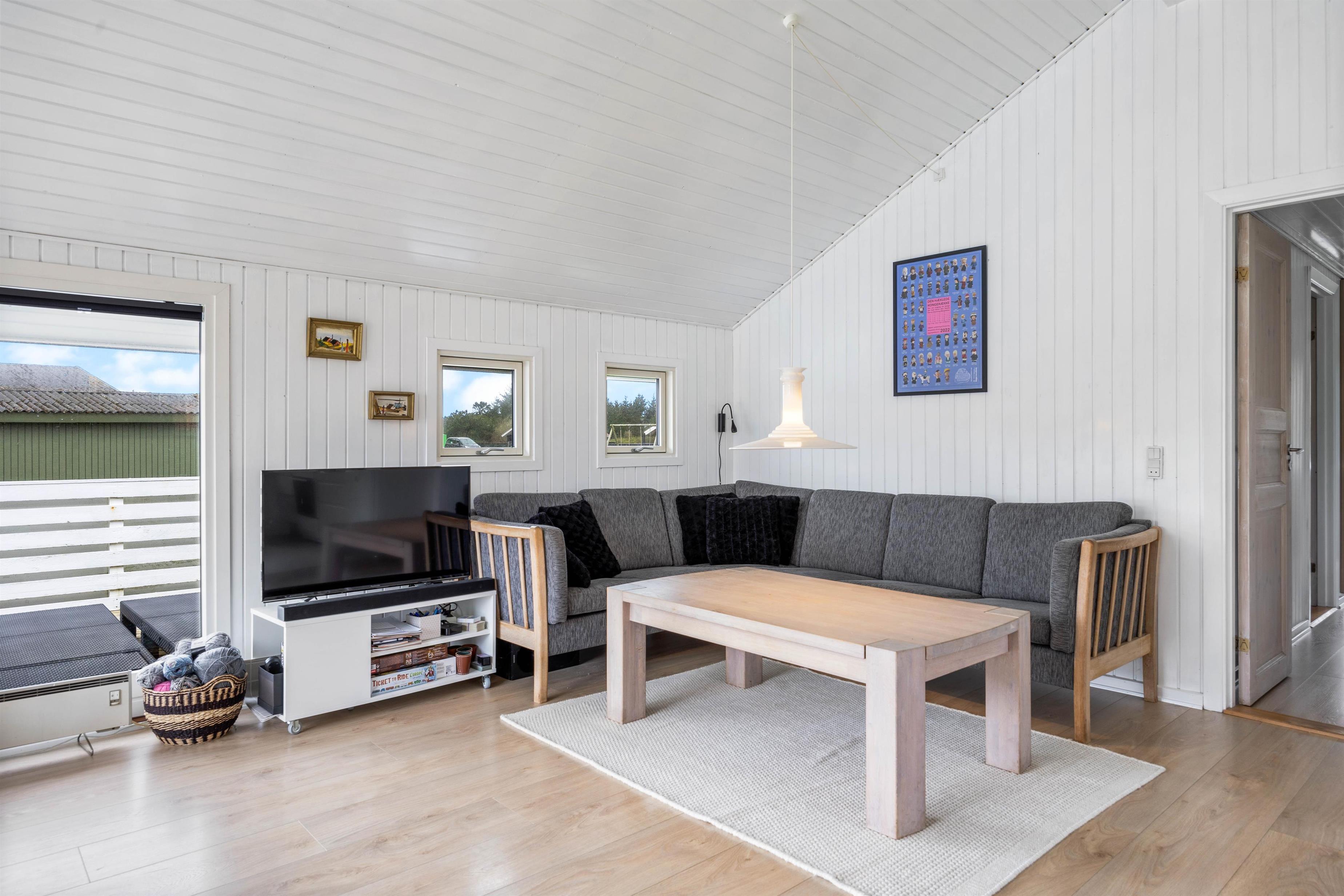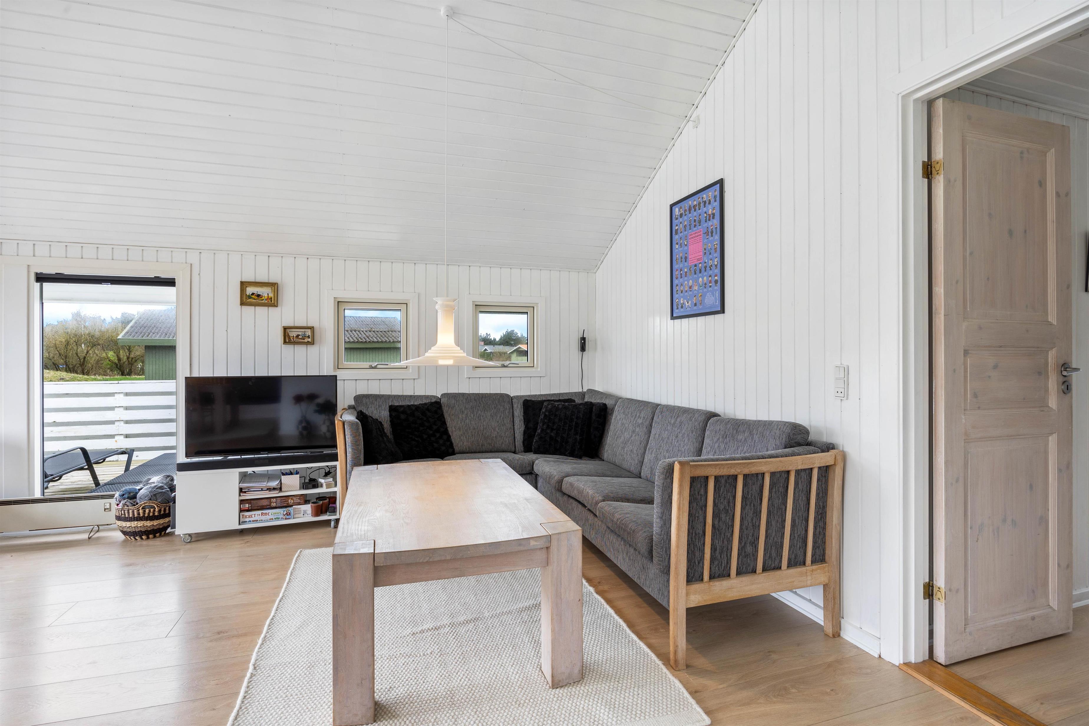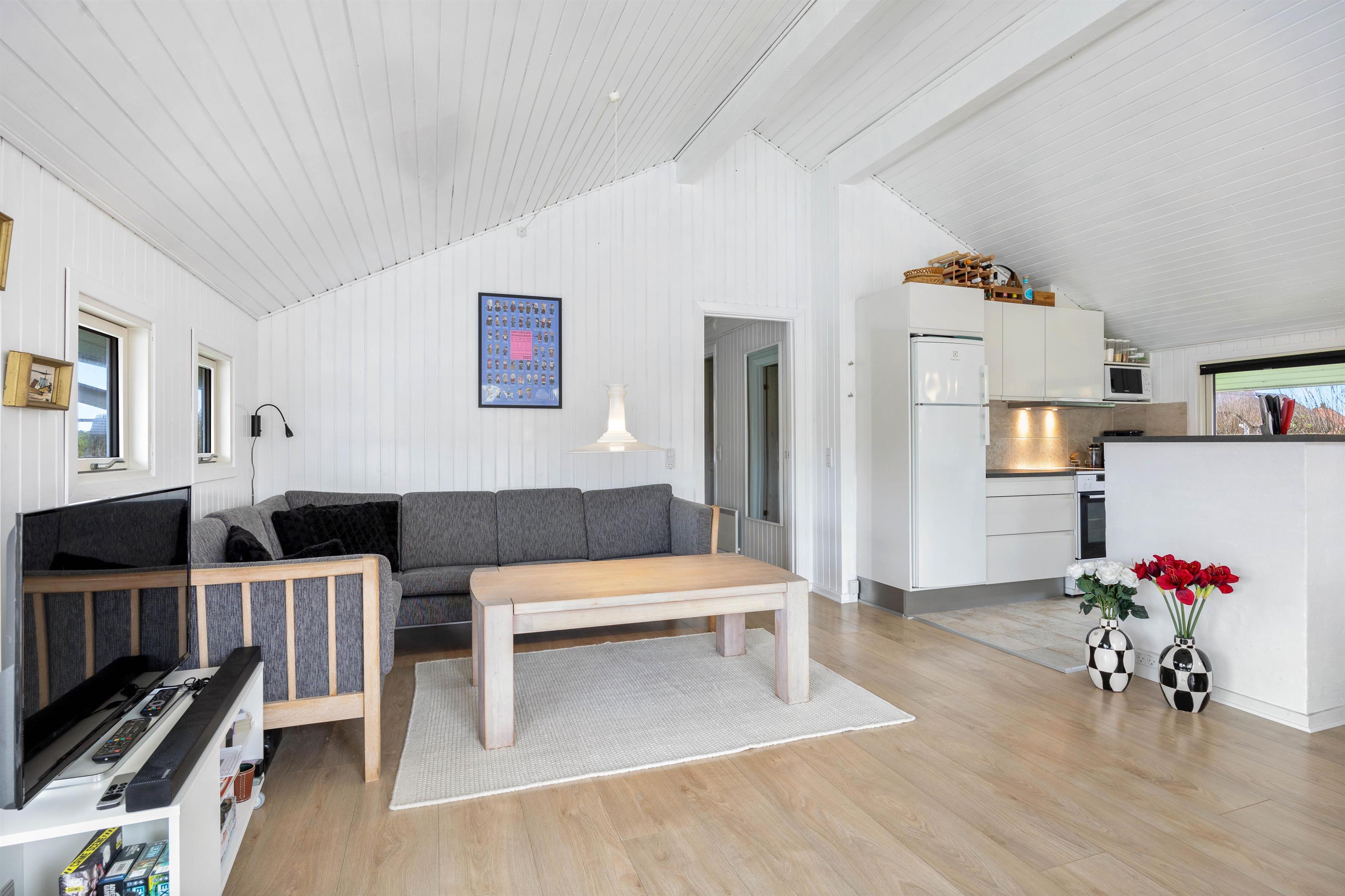 Sommerhuset fremstår lyst og indbydende, og der er trælofter til kip i stue og køkken. Køkkenet er godt indrettet med bl.a. opvaskemaskine, mikroovn og en fryser på 50 L. Stuen ligger i forbindelse med køkkenet, det er velmøbleret og med trælaminat på gulvene. Desuden er der en hyggelig alkove, brændeovn, en fladskærm, DVD og gratis fibernet.