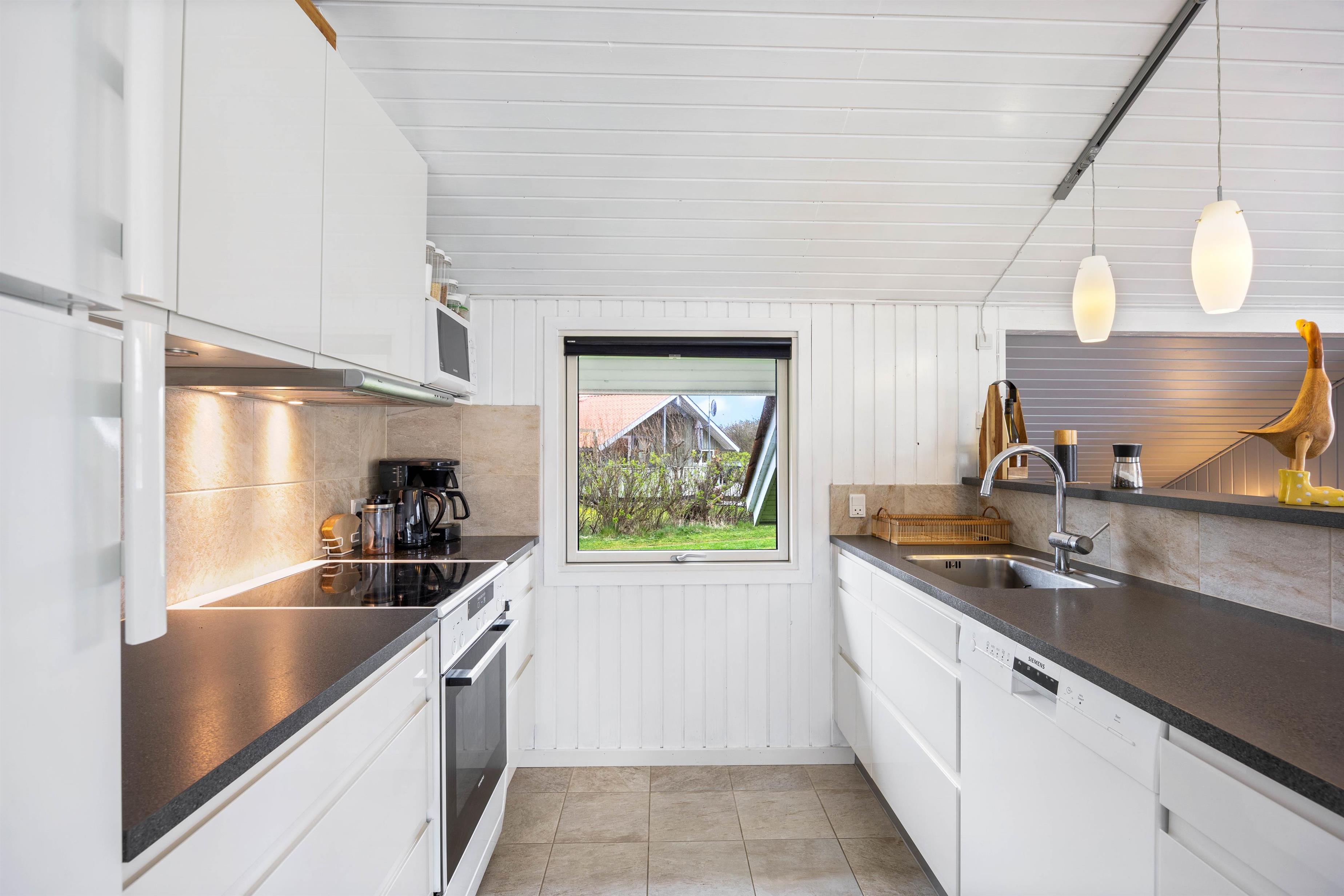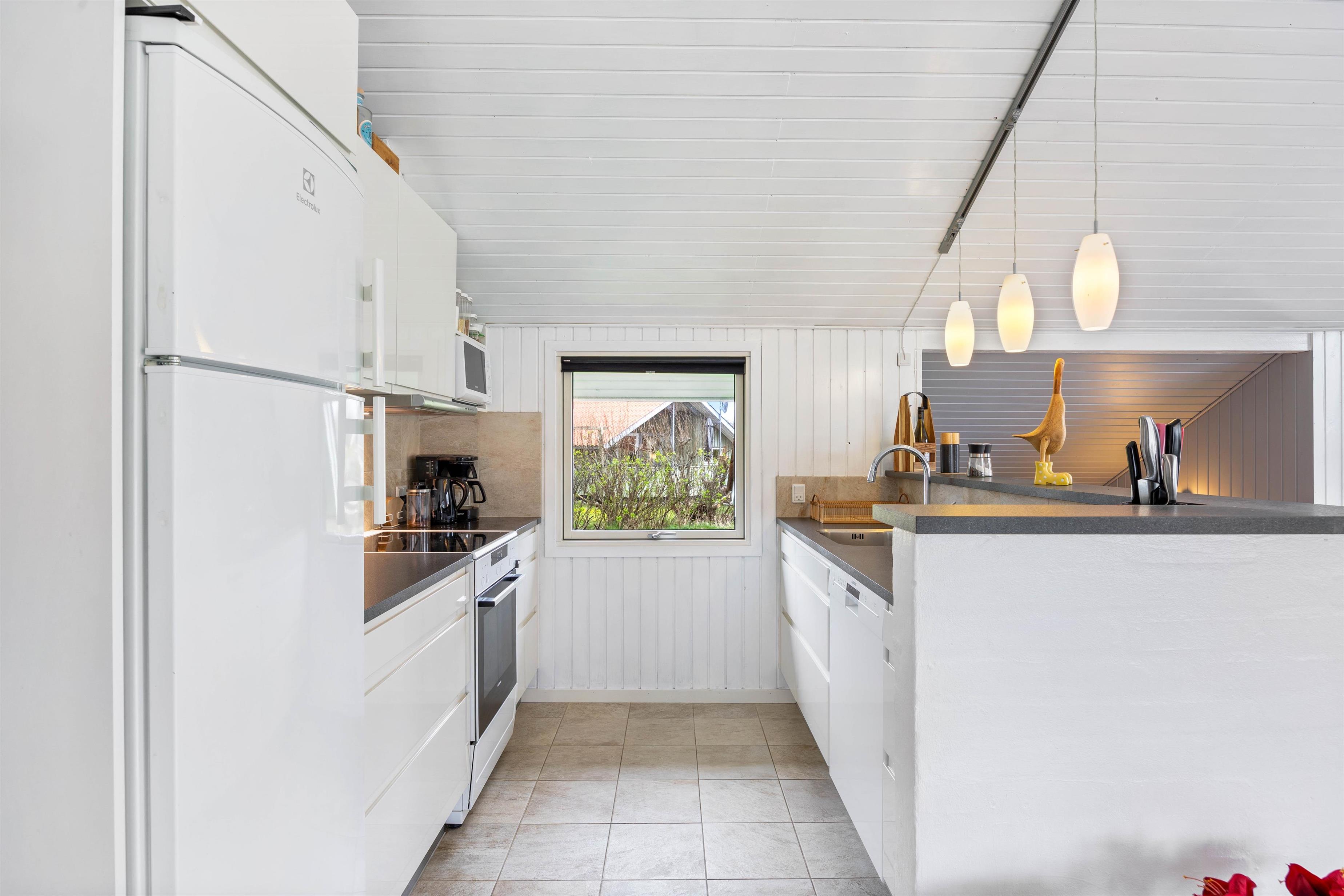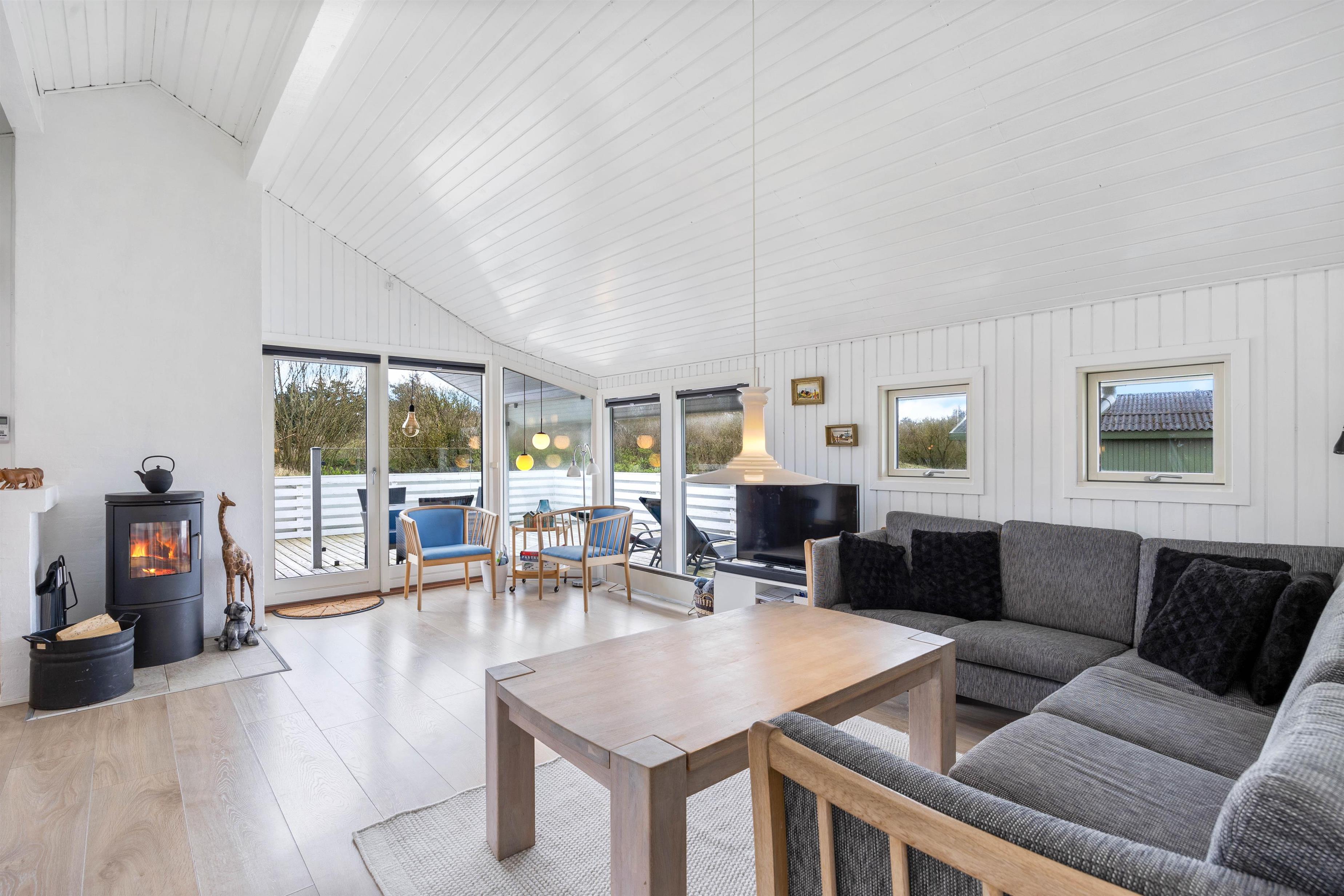 Sommerhuset fremstår lyst og indbydende, og der er trælofter til kip i stue og køkken. Køkkenet er godt indrettet med bl.a. opvaskemaskine, mikroovn og en fryser på 50 L. Stuen ligger i forbindelse med køkkenet, det er velmøbleret og med trælaminat på gulvene. Desuden er der en hyggelig alkove, brændeovn, en fladskærm, DVD og gratis fibernet.