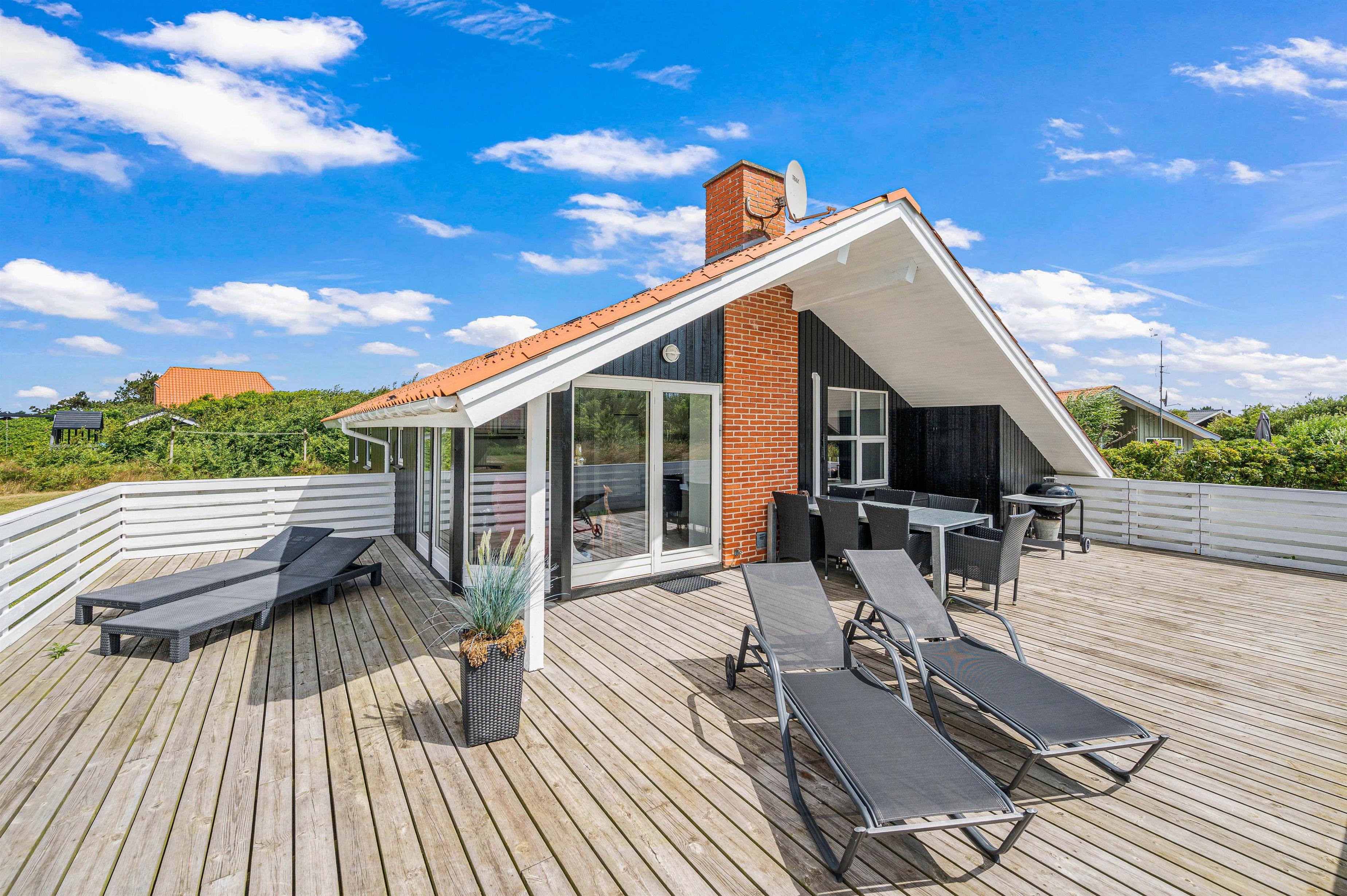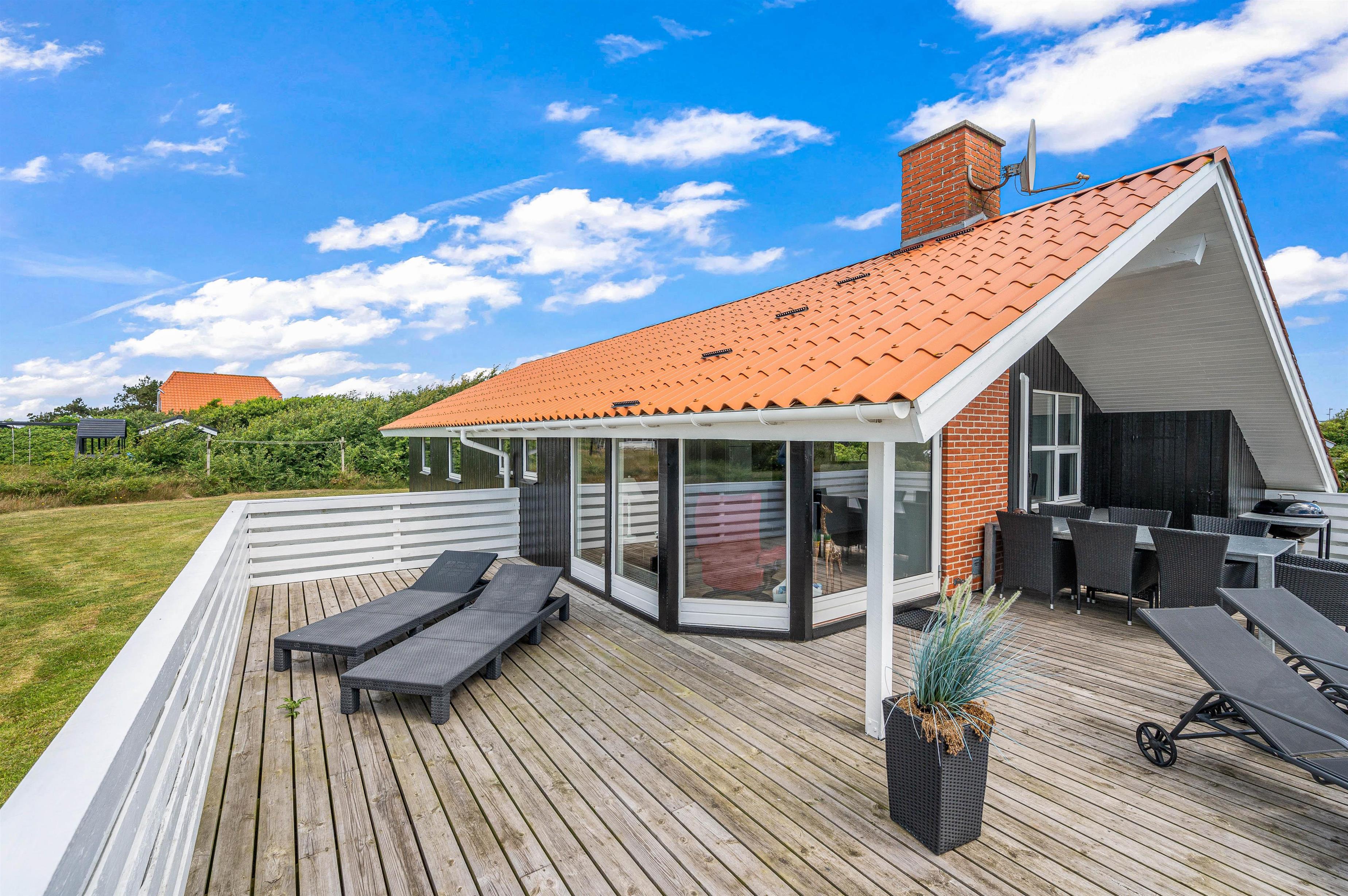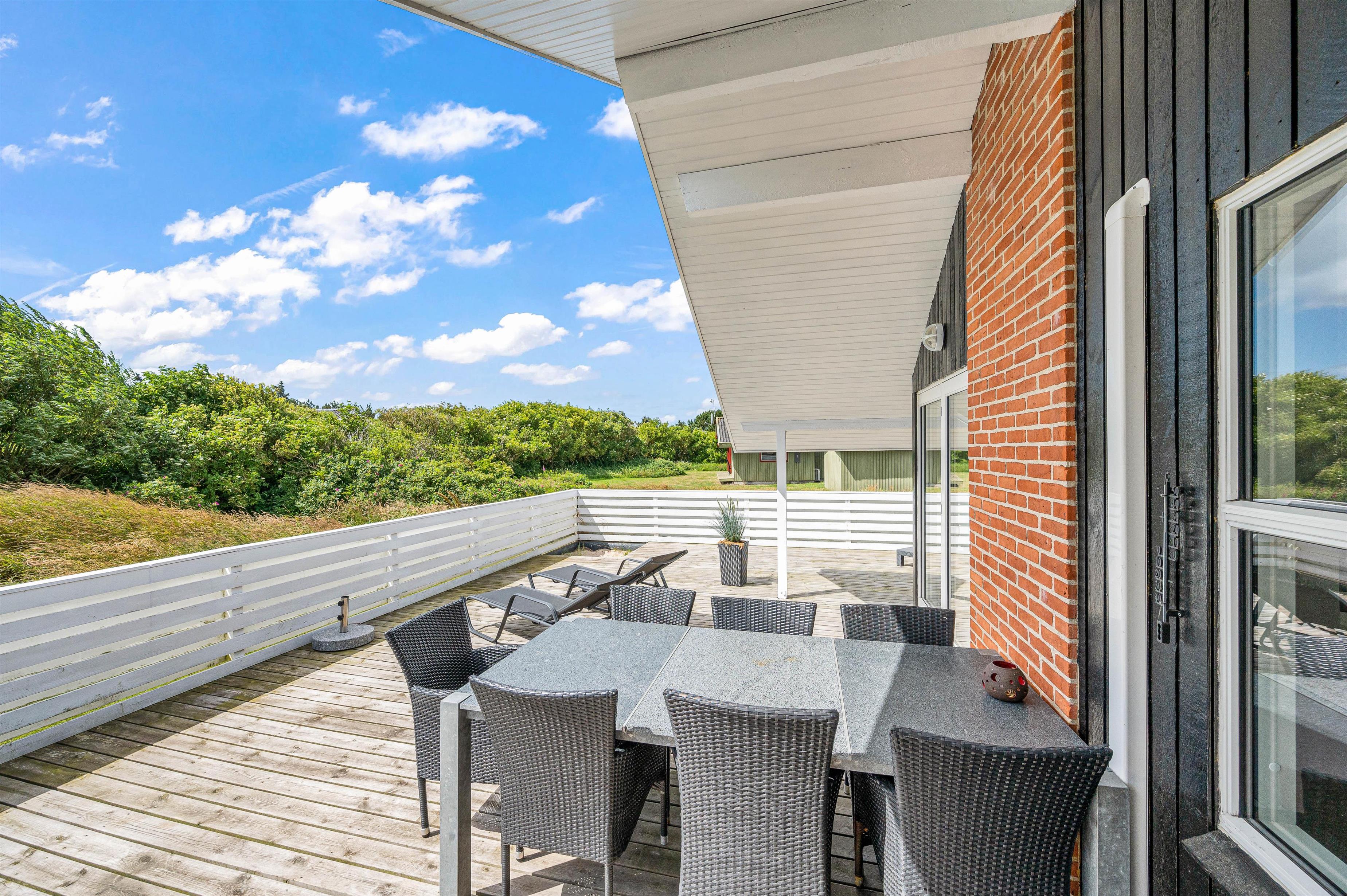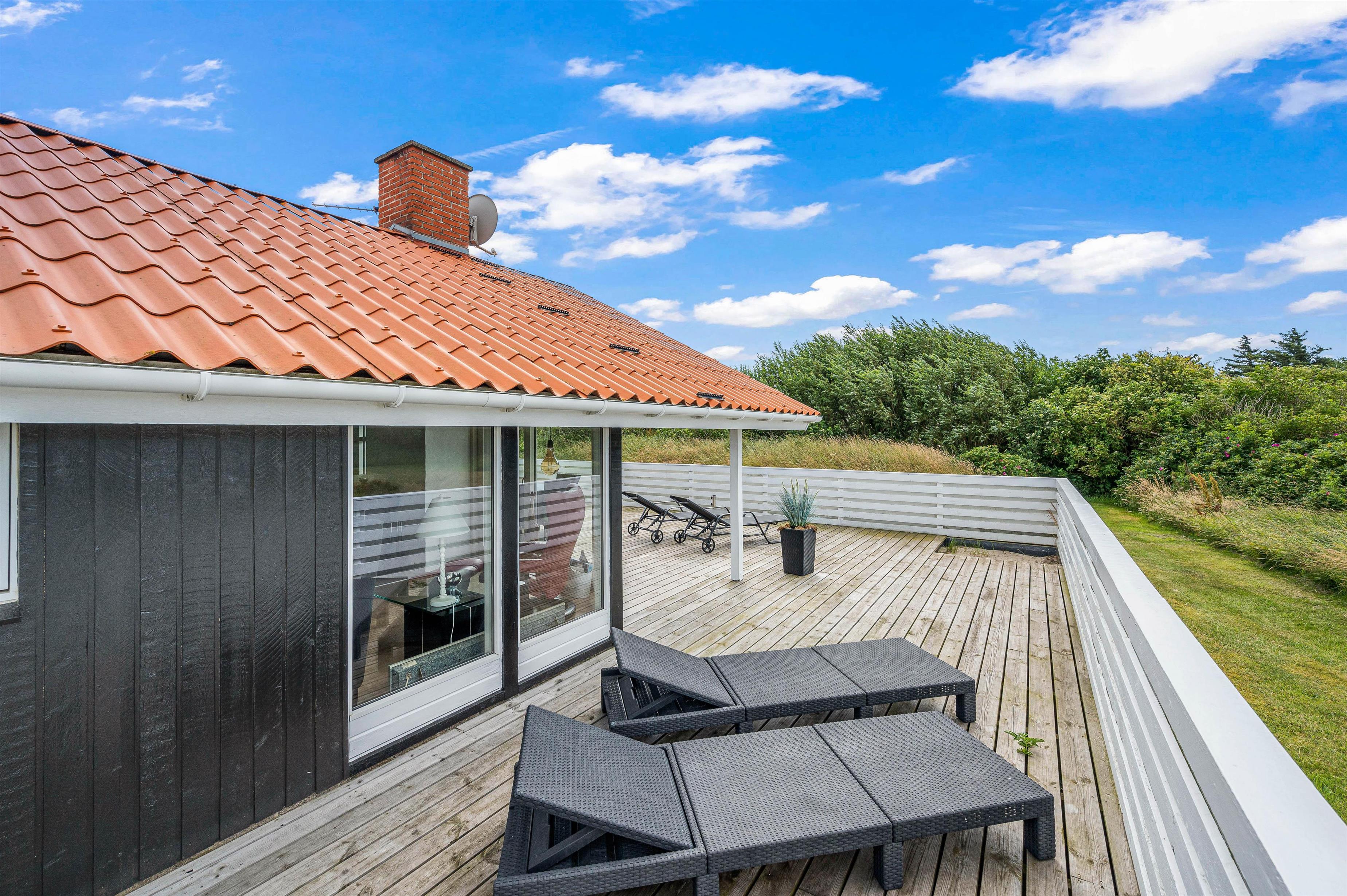 Den store lukkede terrasse er placeret mod syd og sydvest. Den er delvist overdækket og er ideel til hyggelige grillaftener. Terrassen er særdeles børnevenlig og derfor helt ideel, hvis I har mindre børn med. Mod nord er der også en skøn terrasse, der er velegnet til brug i formiddagstimerne. Der er 1 kilometer til hav og strand og kun 400 meter til nærmeste købmand.