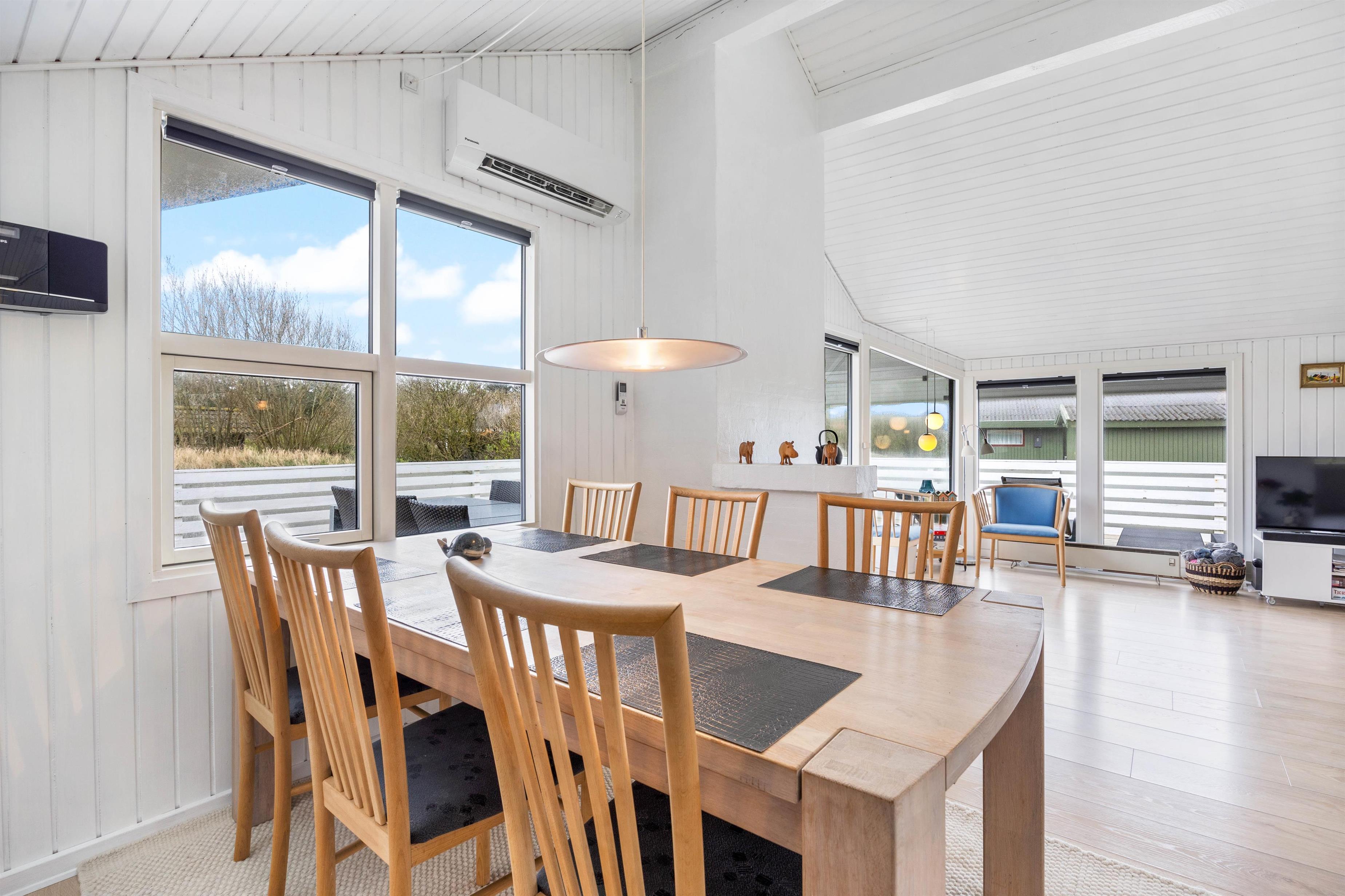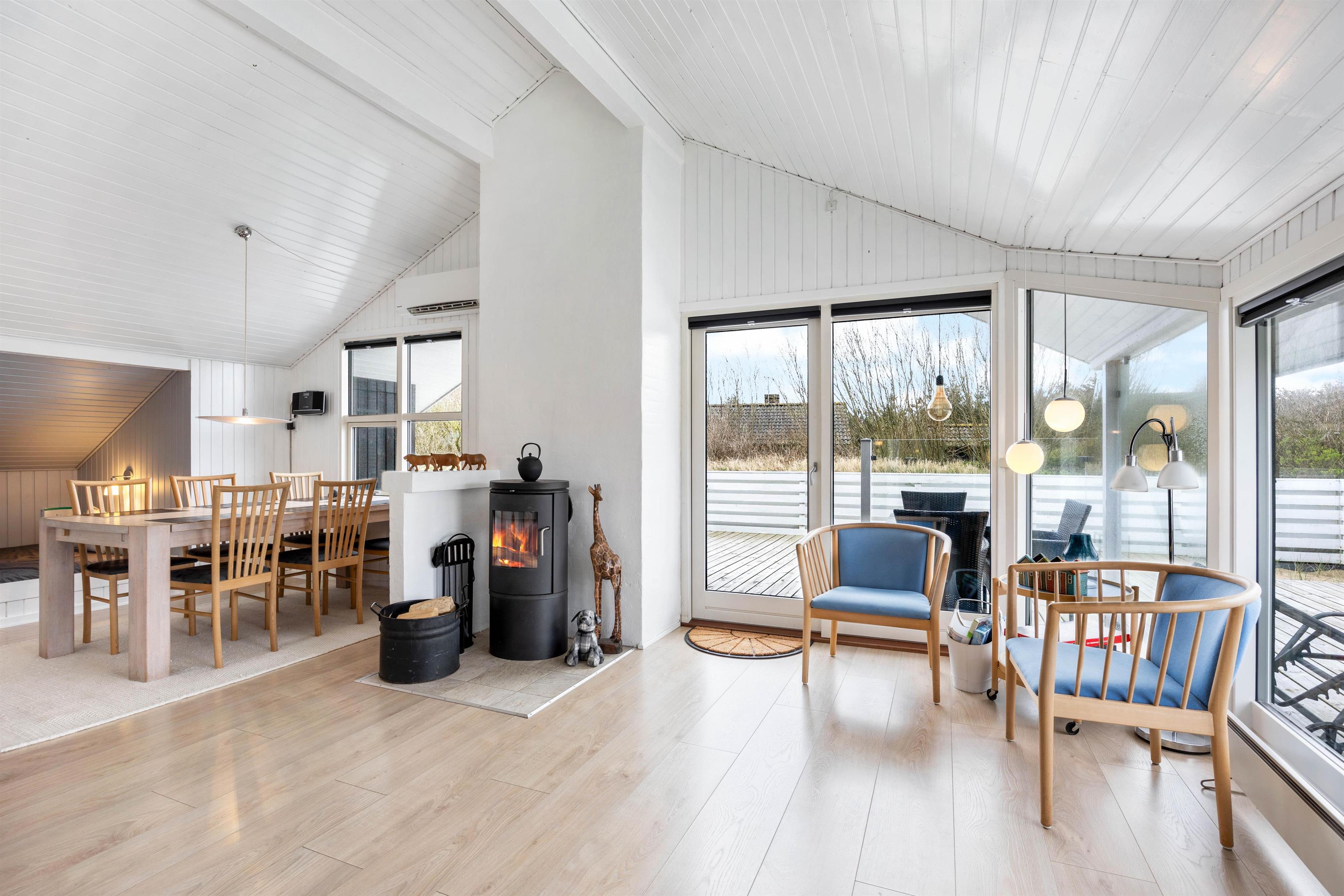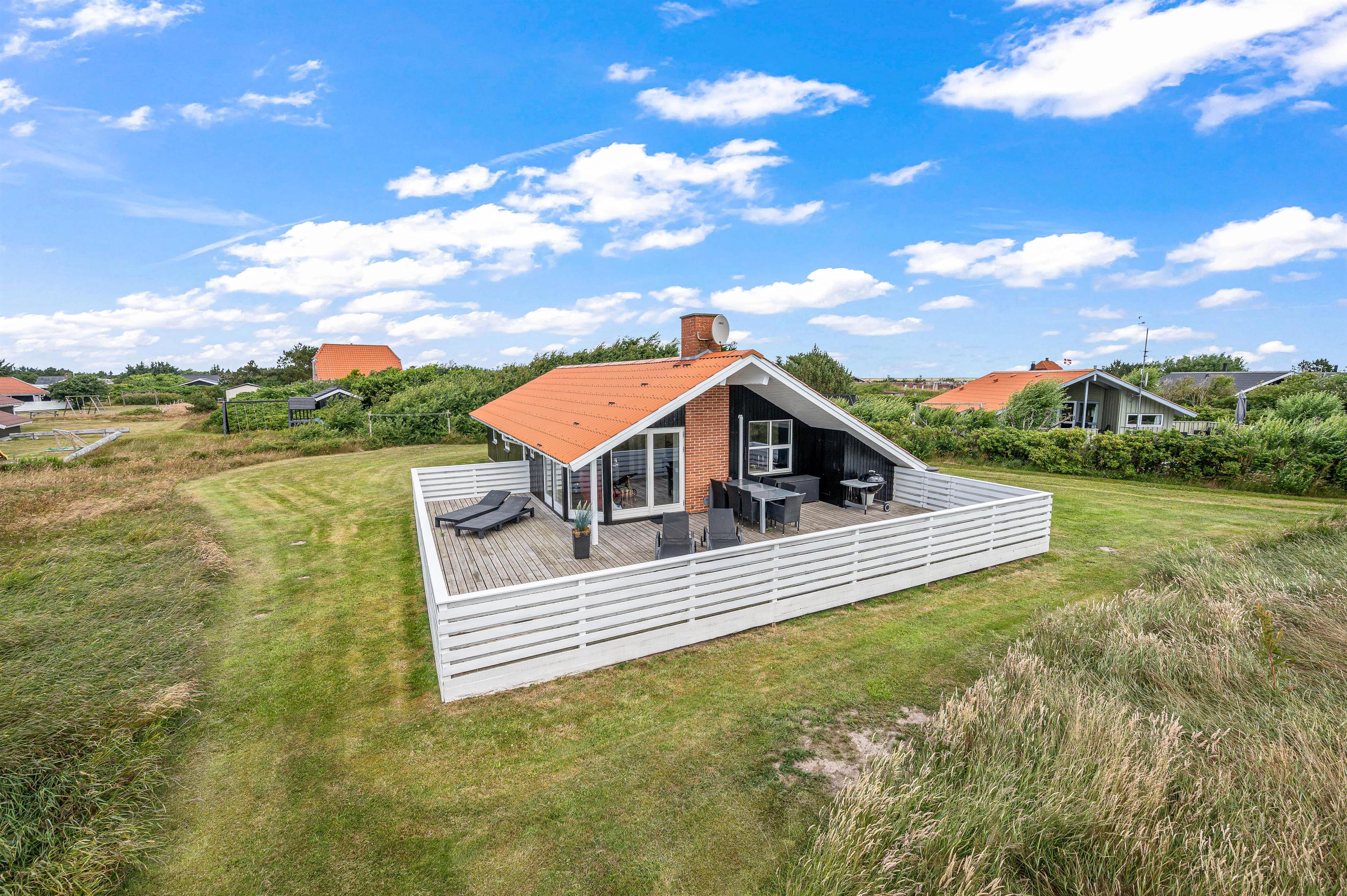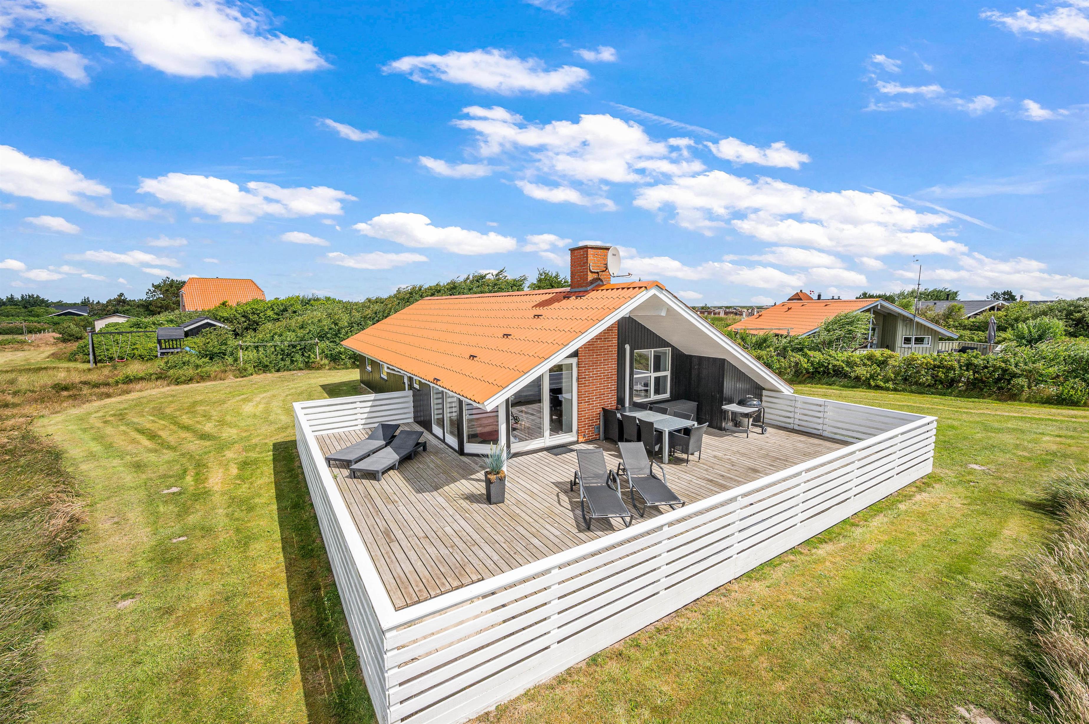 Den store lukkede terrasse er placeret mod syd og sydvest. Den er delvist overdækket og er ideel til hyggelige grillaftener. Terrassen er særdeles børnevenlig og derfor helt ideel, hvis I har mindre børn med. Mod nord er der også en skøn terrasse, der er velegnet til brug i formiddagstimerne. Der er 1 kilometer til hav og strand og kun 400 meter til nærmeste købmand.