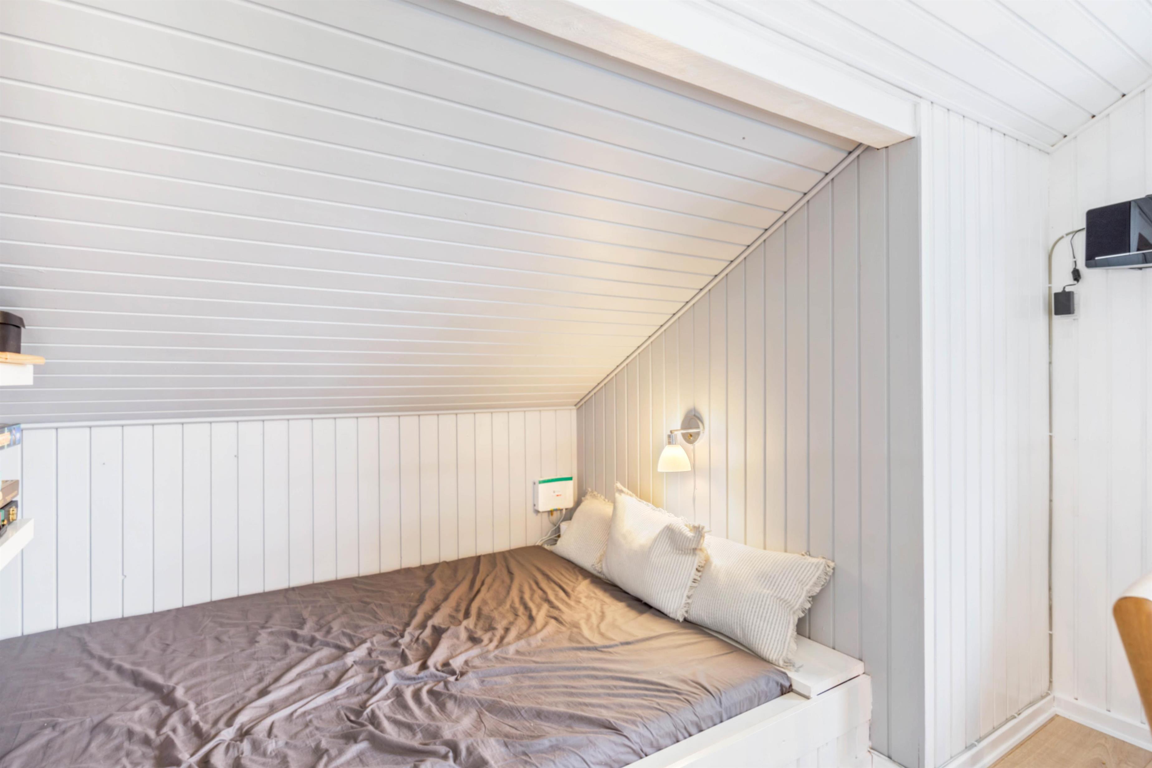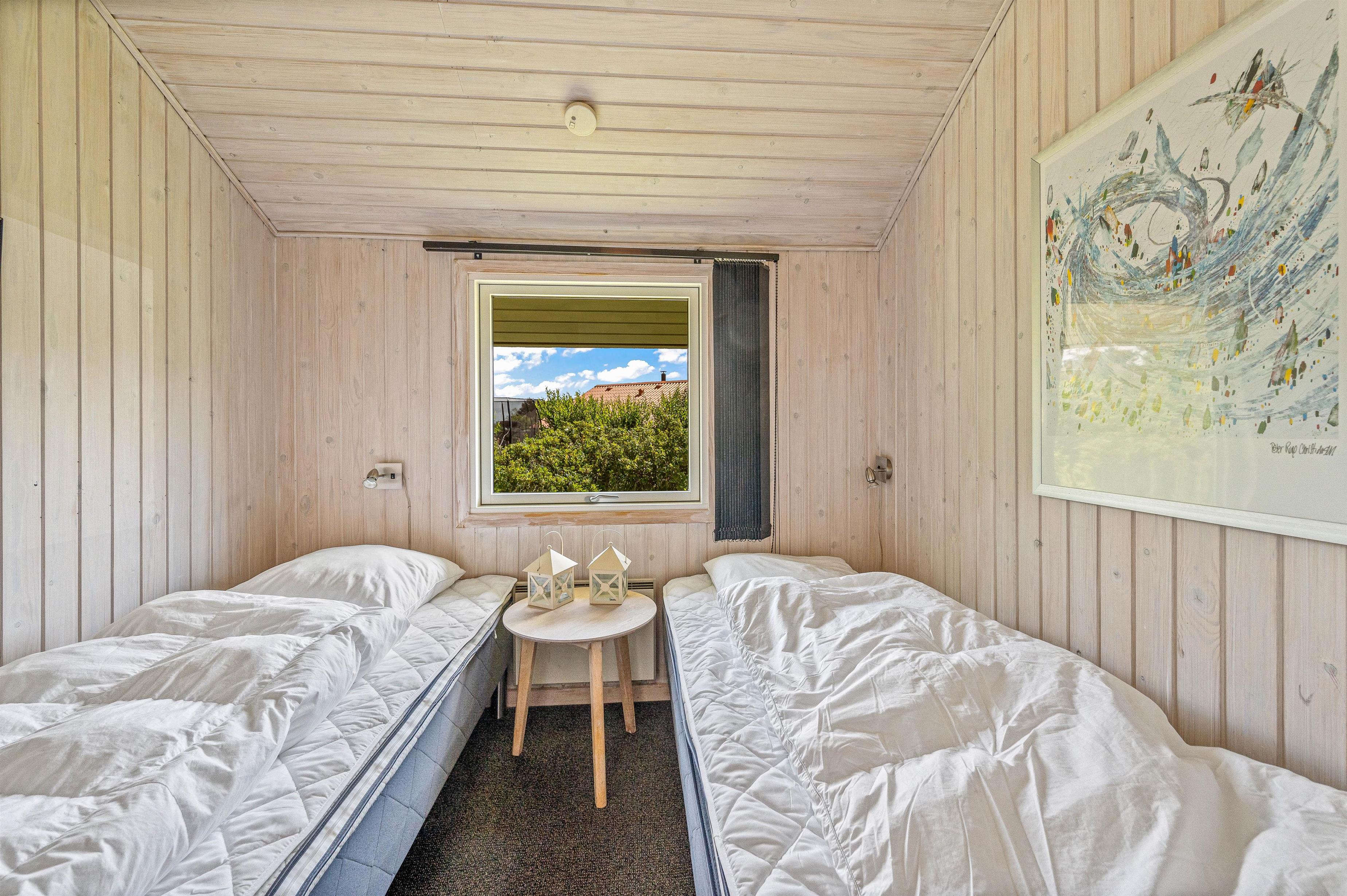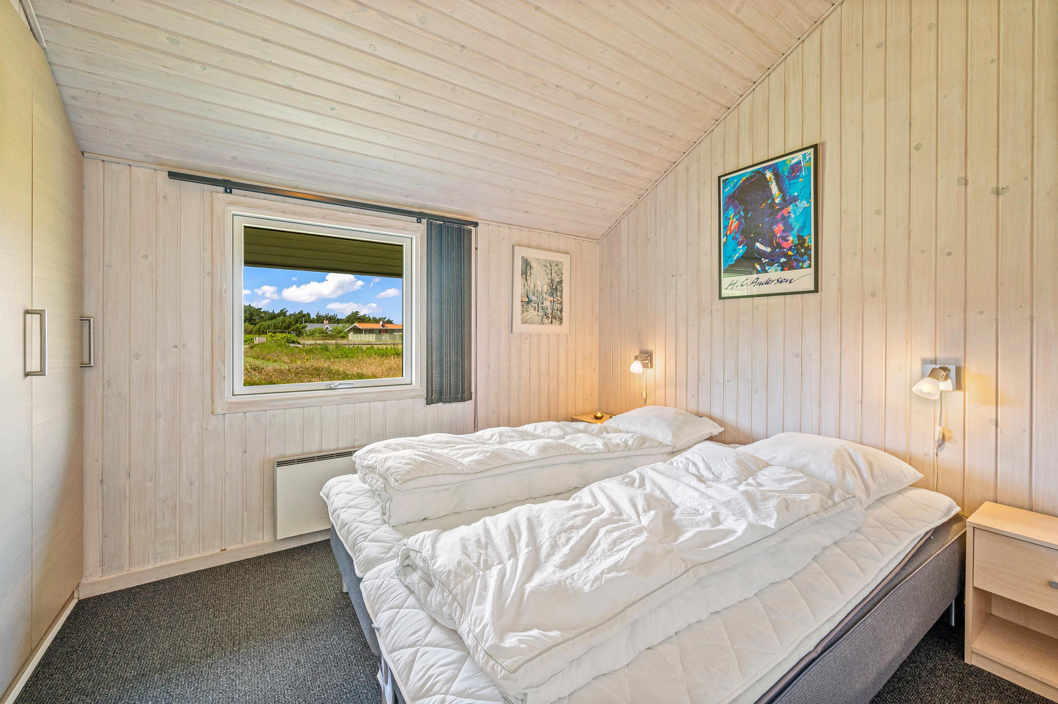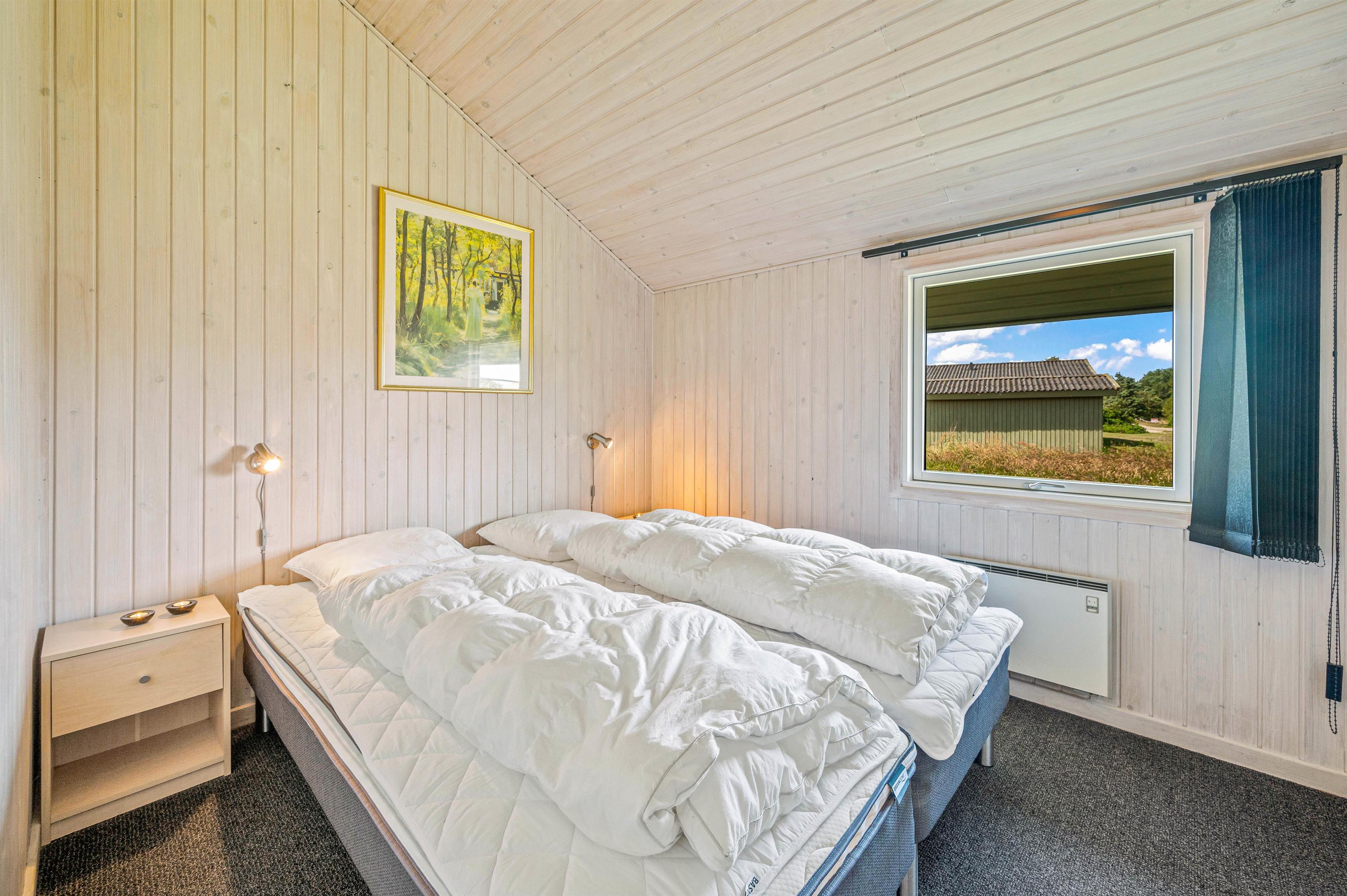 Der er 3 soveværelser, hvoraf de 2 værelser har dobbeltseng og det sidste 2 enkeltsenge. I badeværelset er der gulvvarme, bruseniche, hjørnespa og indgang til sauna. Derudover er der vaskemaskine i sommerhuset, så I kan vaske lidt tøj, hvis det skulle blive en nødvendighed.