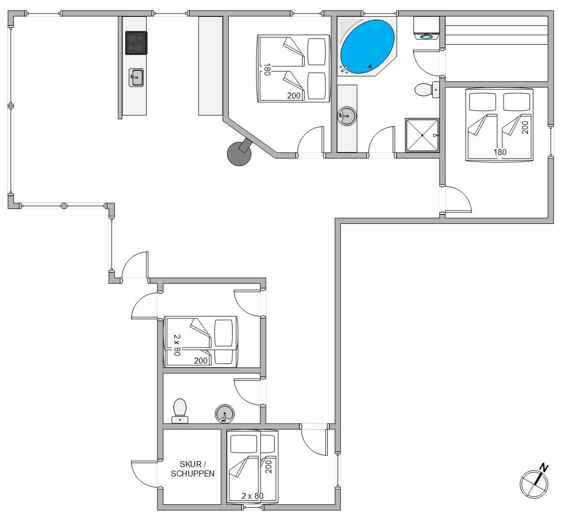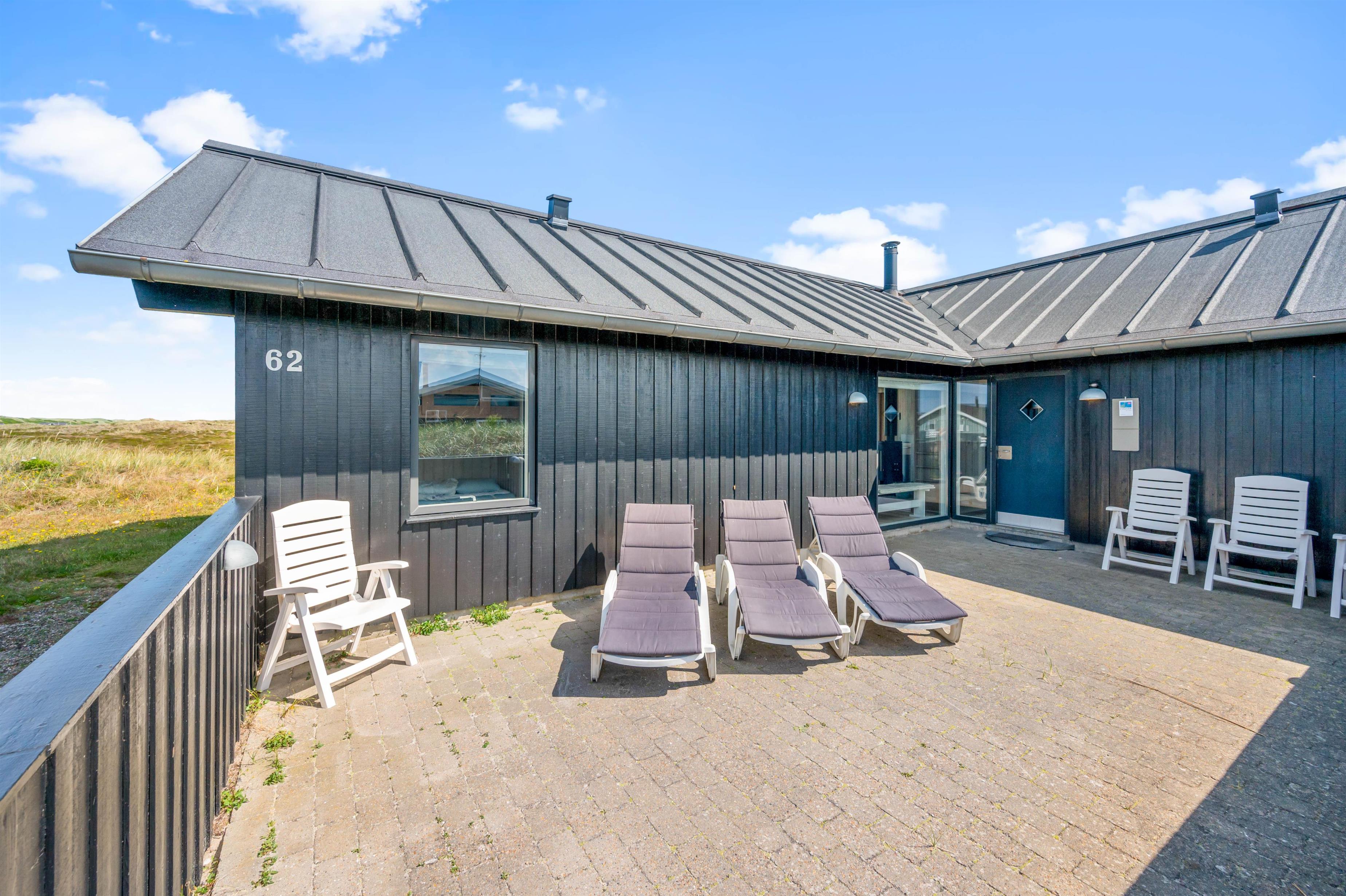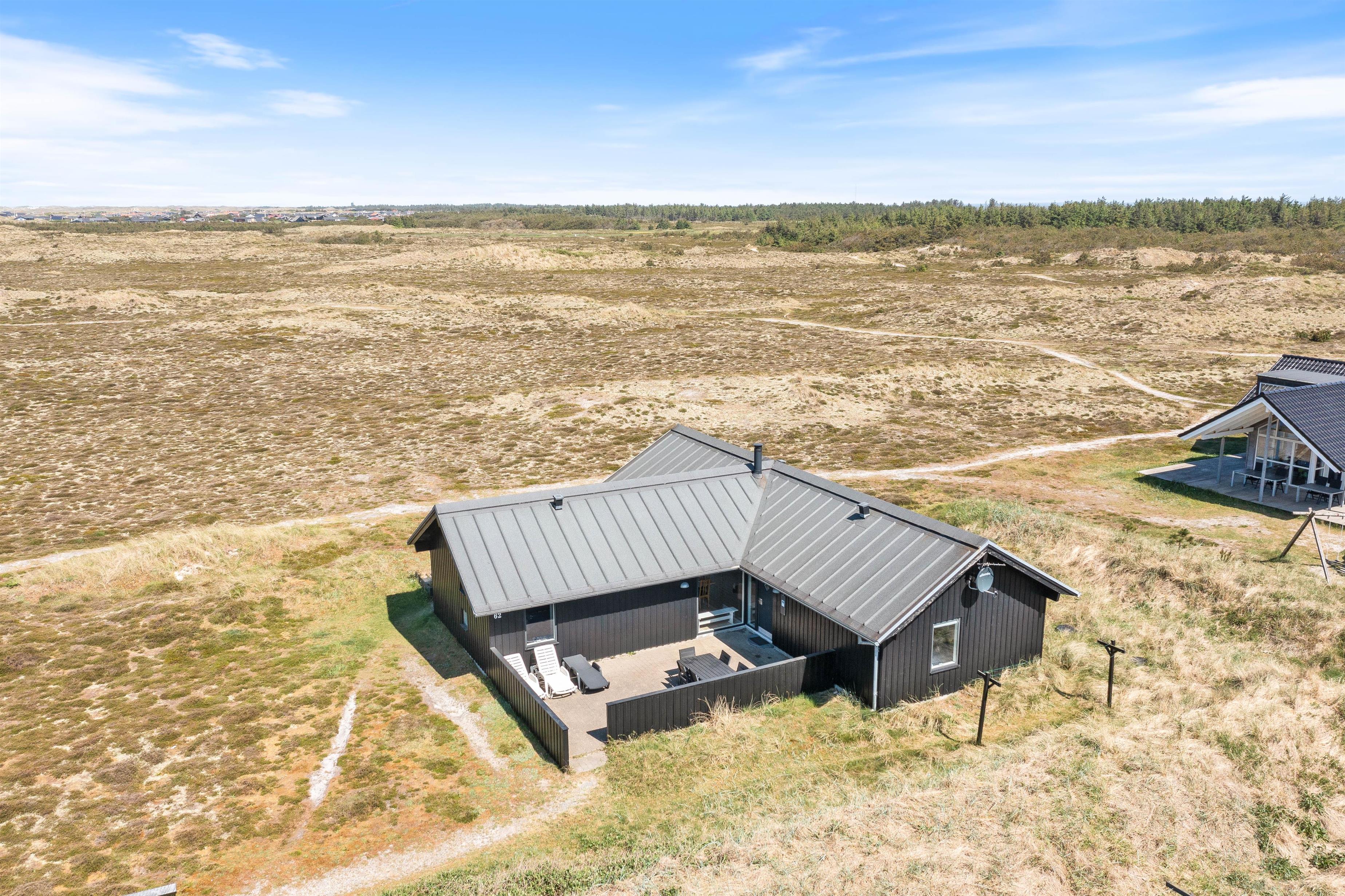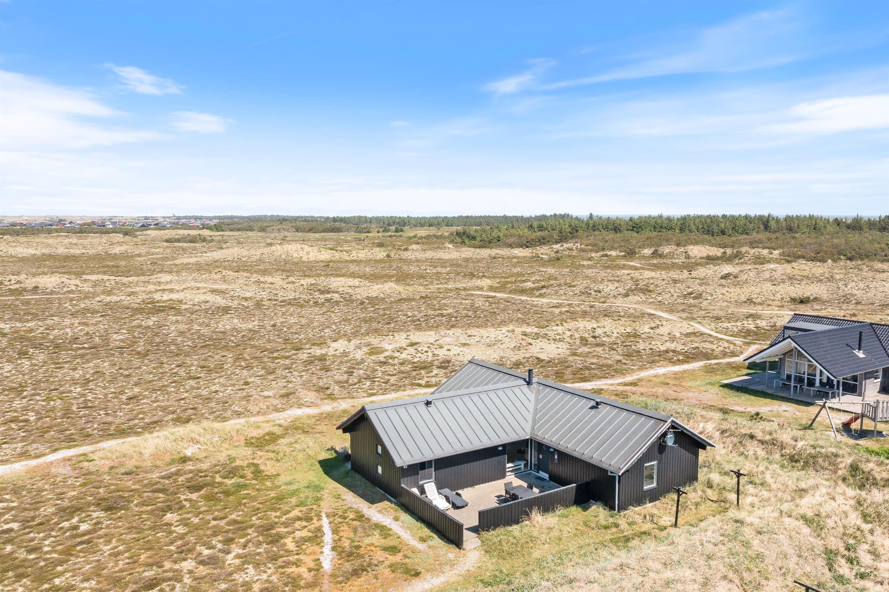 På en skøn naturgrund lige op ad det store fredede hedeareal i Bjerregaard ligger dette velindrettede feriehus, hvor de to herlige terrasser, hvoraf den ene er afskærmet, opfordrer til at opholde sig ude og nyde den uforstyrrede fred og ro i naturen. Begge terrasser er udstyret med kvalitetshavemøbler og liggestole samt grill.