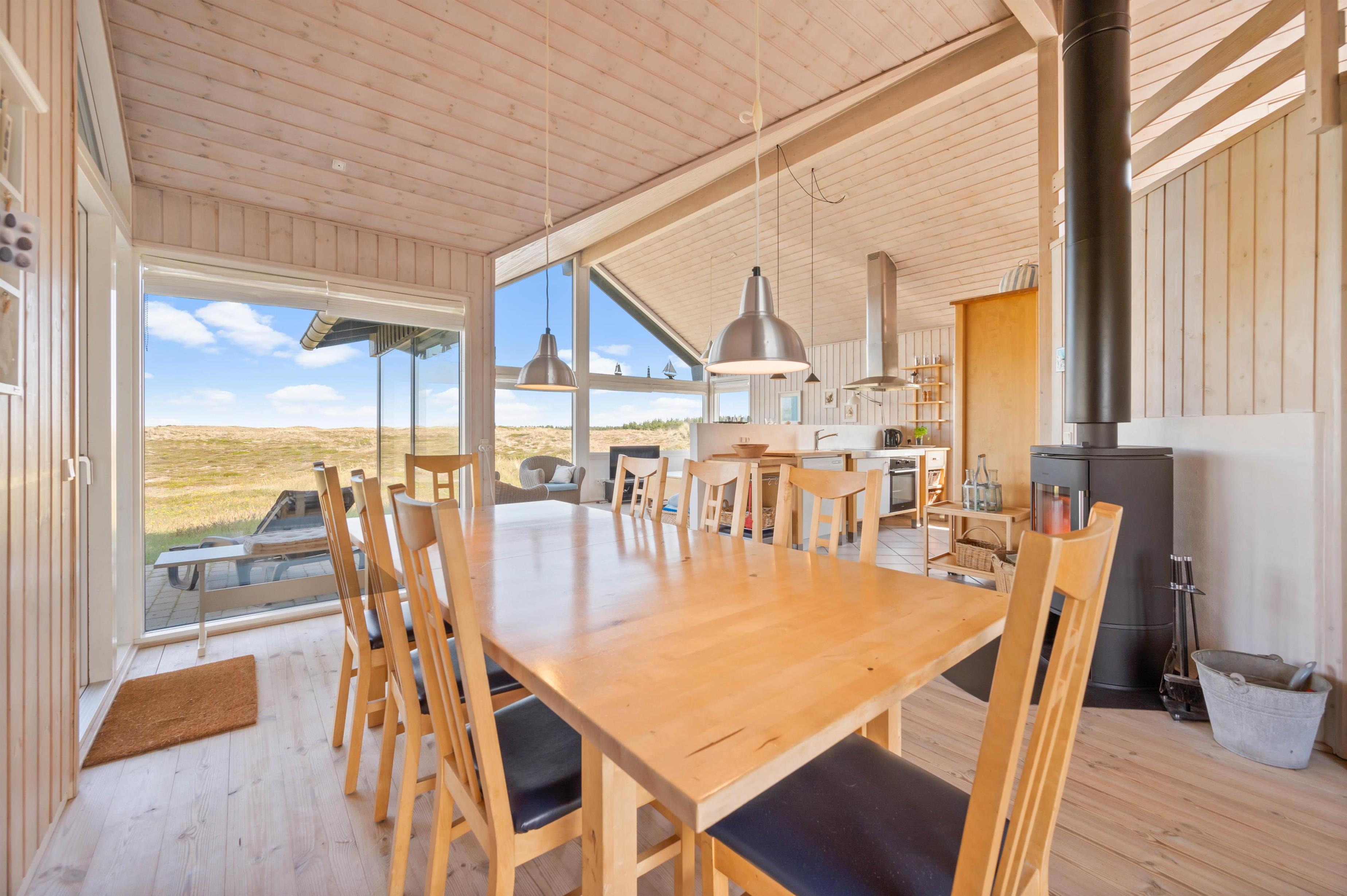 Fra dette feriehus midt i naturen er der kun et par minutters gang til Ringkøbing Fjord og Vesterhavet. Ellers har man eminente udflugtsmuligheder rundt om fjorden – både de små havne i bl.a. Bork, Stauning, Ringkøbing og ikke mindst den store fiskerihavn i Hvide Sande, hvor en slentretur på havnen og i gågaderne absolut hører sig til, når familien med både børn og hund skal have en vellykket ferie.