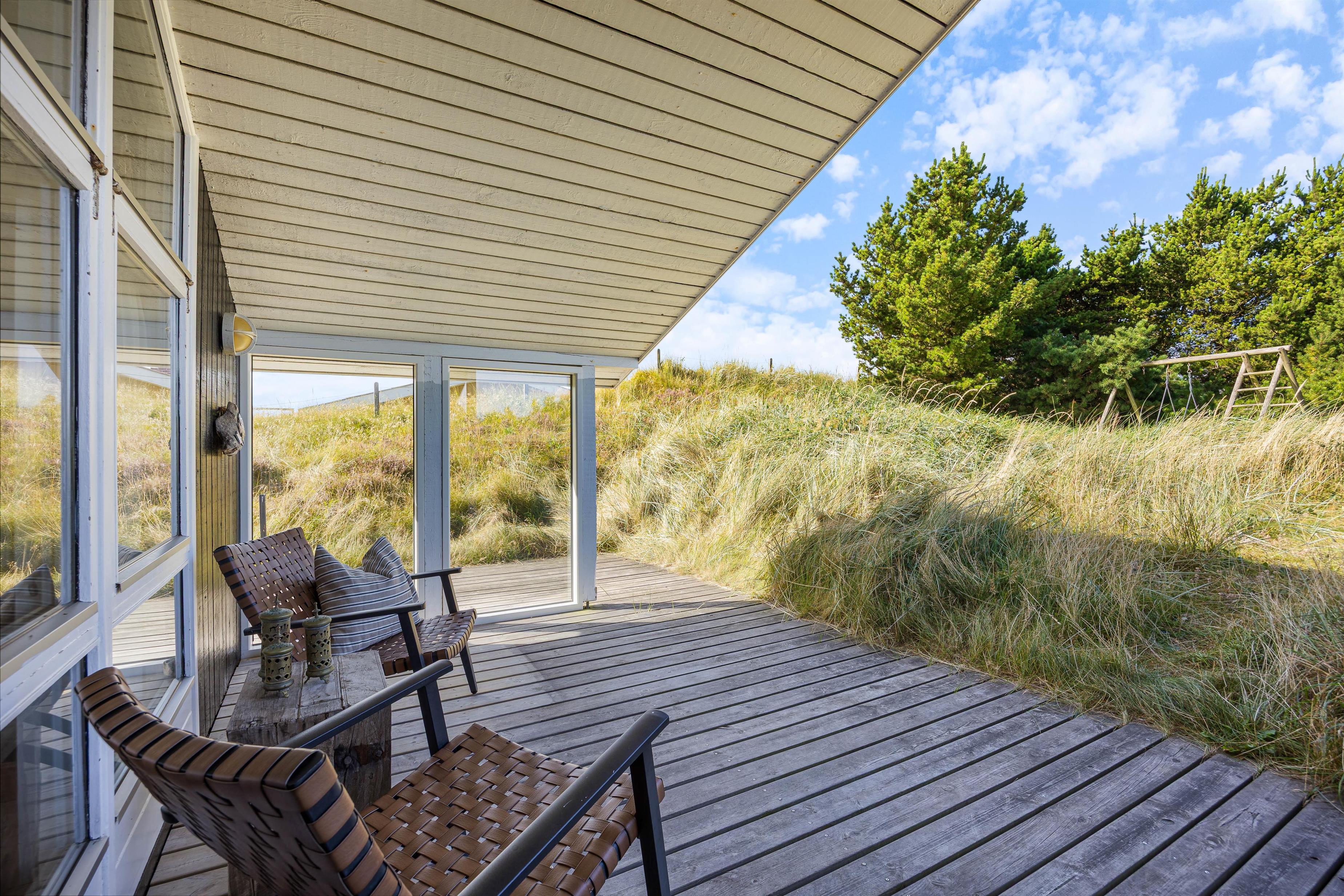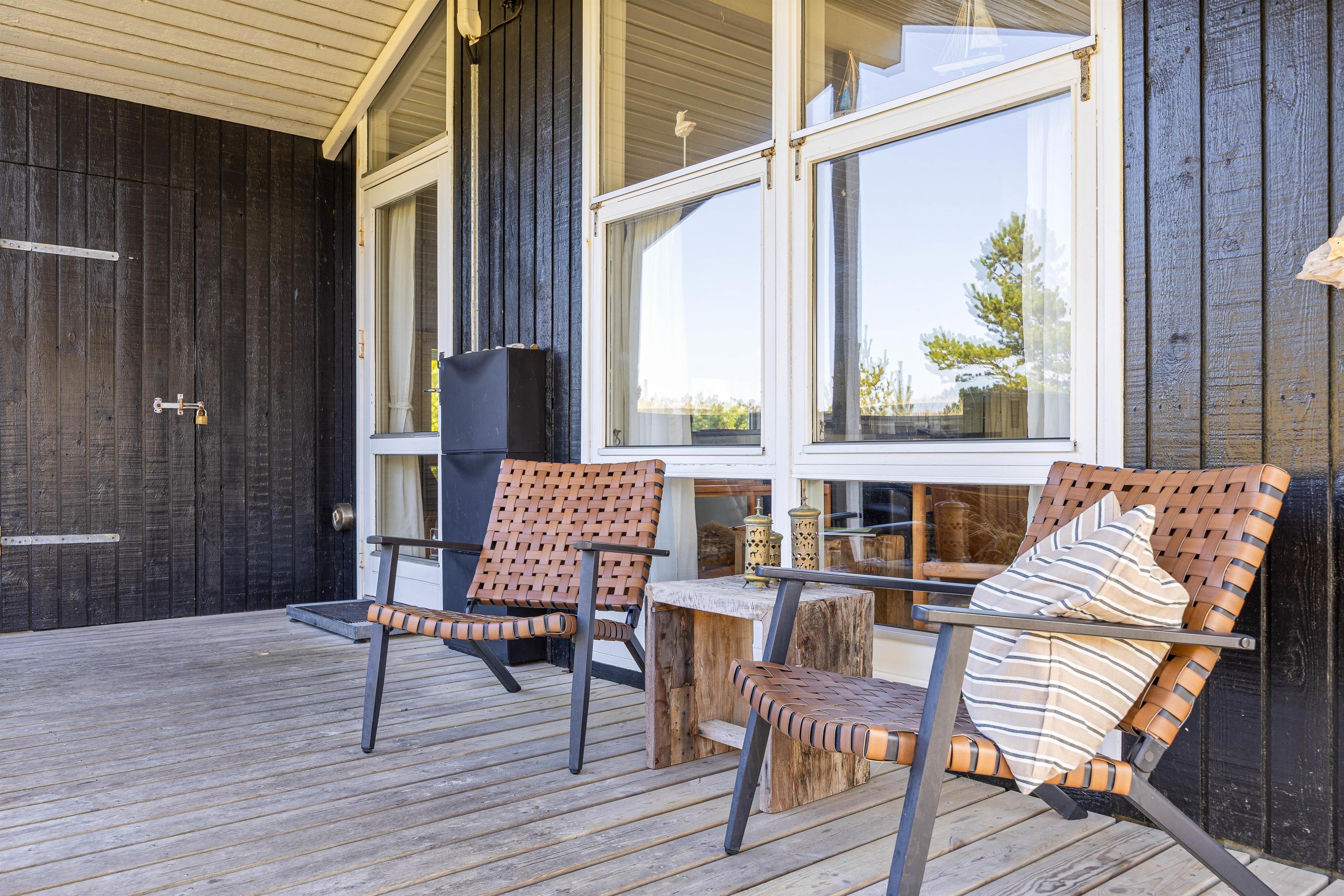 Rundt om sommerhuset er der flere store terrasseområder, hvor man kan nyde naturen – hvad enten det er i liggestolen, til måltider udendørs eller til hyggelige grillaftener. Da terrassen går næsten hele vejen rundt om feriehuset, er der altid et lækkert hjørne at finde læ i. Til familiens yngste er der også både gynge og sandkasse, hvor de kan få masser af tid til at gå.