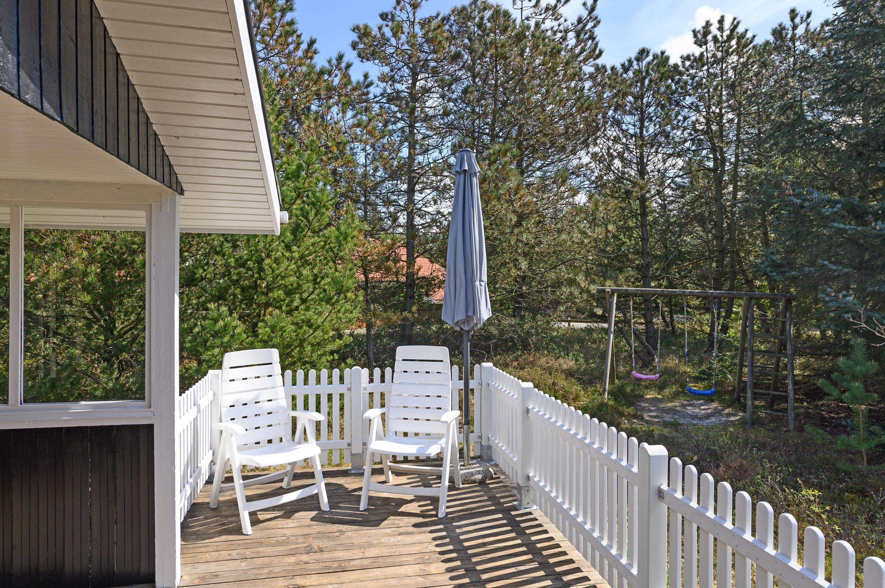Fra stuen har du adgang til en dejlig, stor træterrasse. En del af terrassen er overdækket, hvilket giver læ på tidligere forårsdage eller på lune sommeraftener, når duggen falder. Til uderummet hører også et gyngestativ og en sandkasse til familiens mindste.