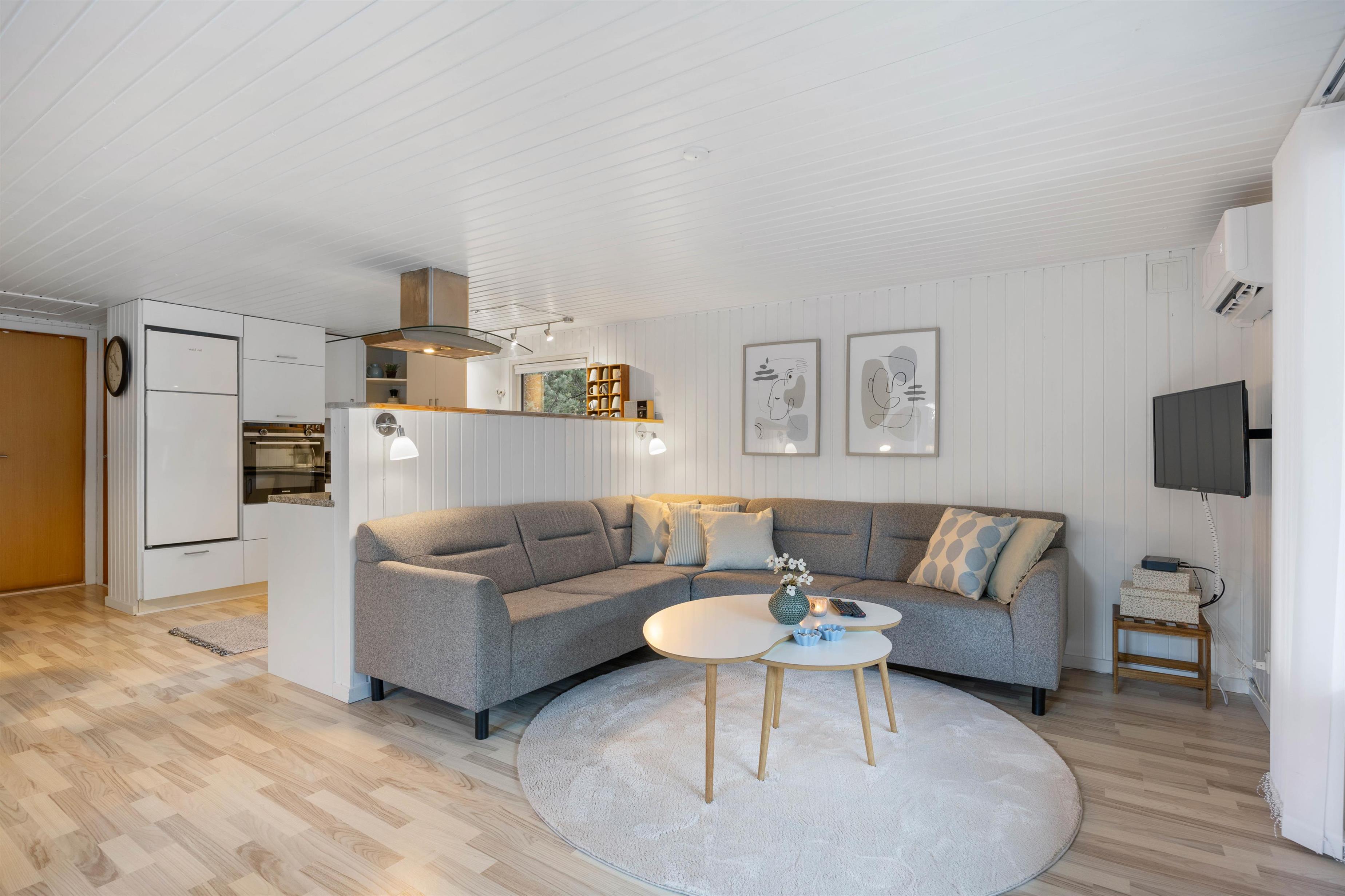 Det flotte sommerhus er smukt indrettet med gode, komfortable møbler. Vægge, lofter og gulve er holdt i lyse nuancer, og indretningen er enkel med et personligt strejf. Her er der en følelse af sol og sommer året rundt. De flotte sofaer og de blå detaljer på gardiner og nips giver en god og personlig kontrast til den ellers lyse indretning. Det skaber samtidig en god og hyggelig atmosfære. Rumtemperaturen kan tilpasses ved at gøre brug af den energibesparende varmepumpe.