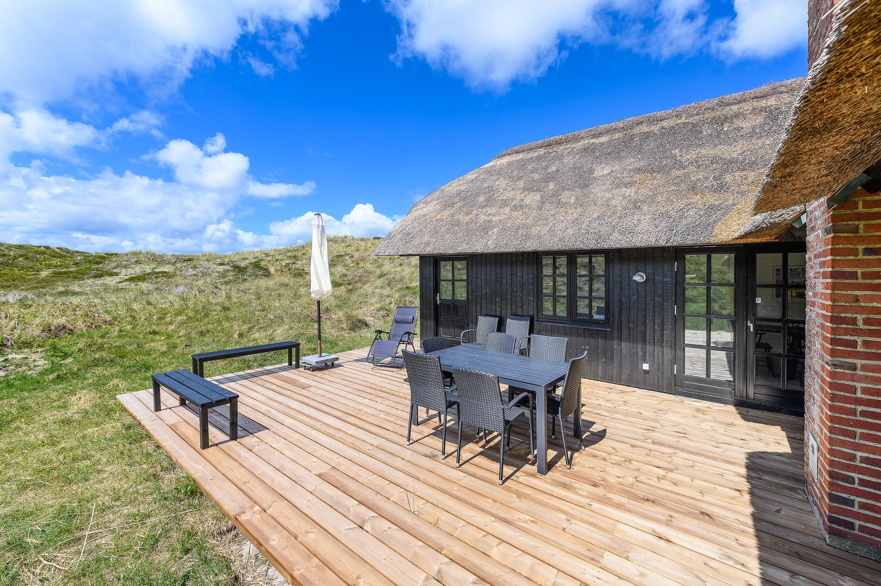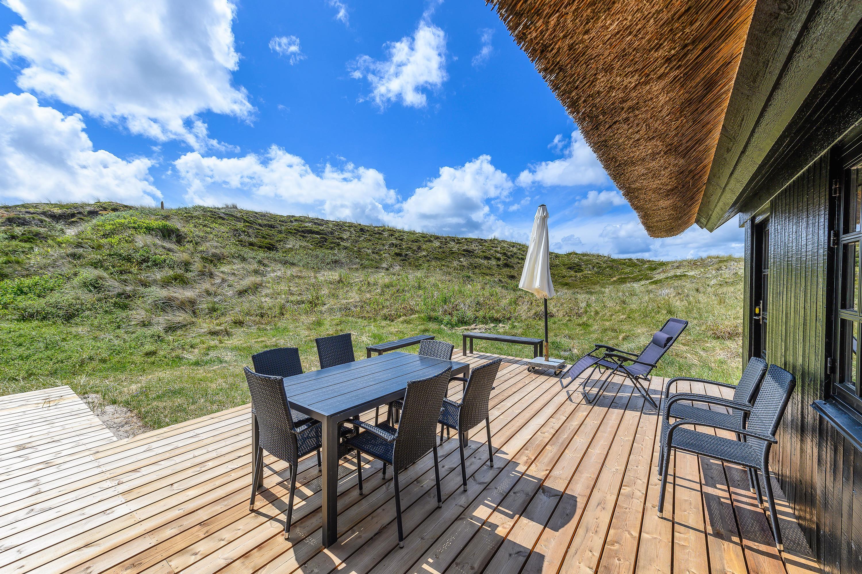 Der findes få feriehuse med en beliggenhed som dette. Hele vejen rundt om denne perle på Bilbergsvej 87 finder I skønne træterrasser, hvor I hele tiden på ugeneret vis har mulighed for at nyde solens stråler og panoramaudsigten til det smukke klitlandskab.
