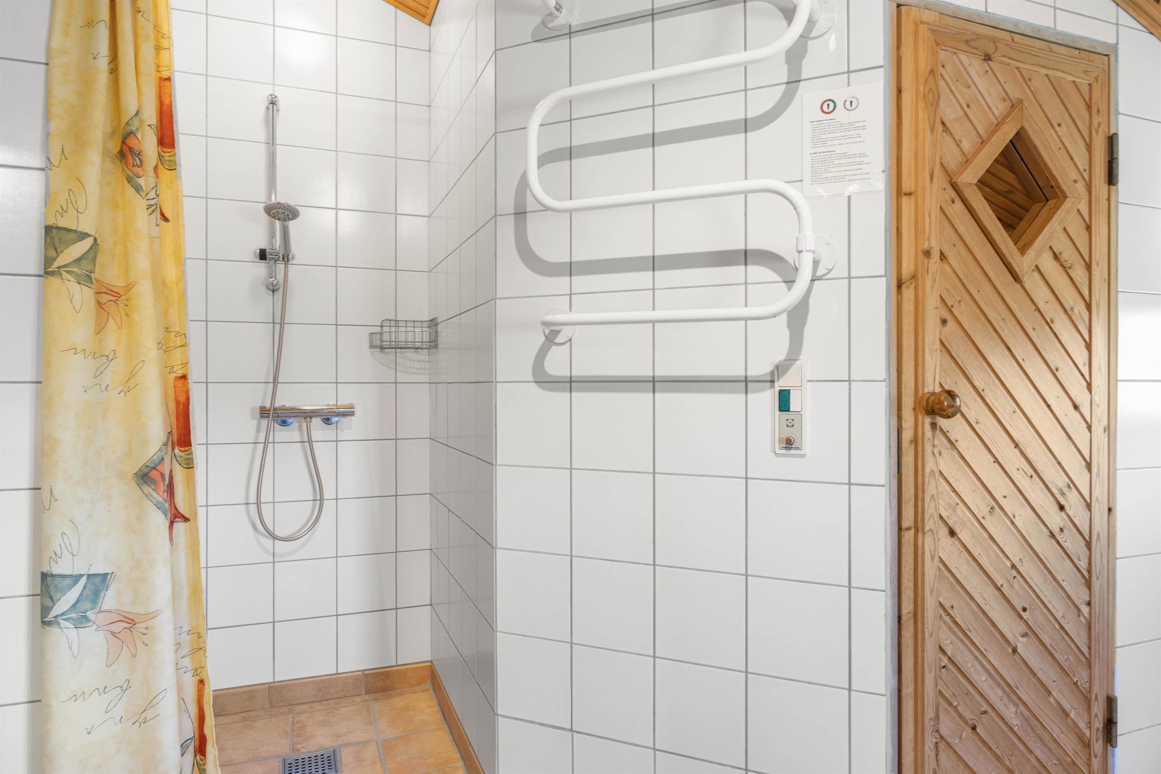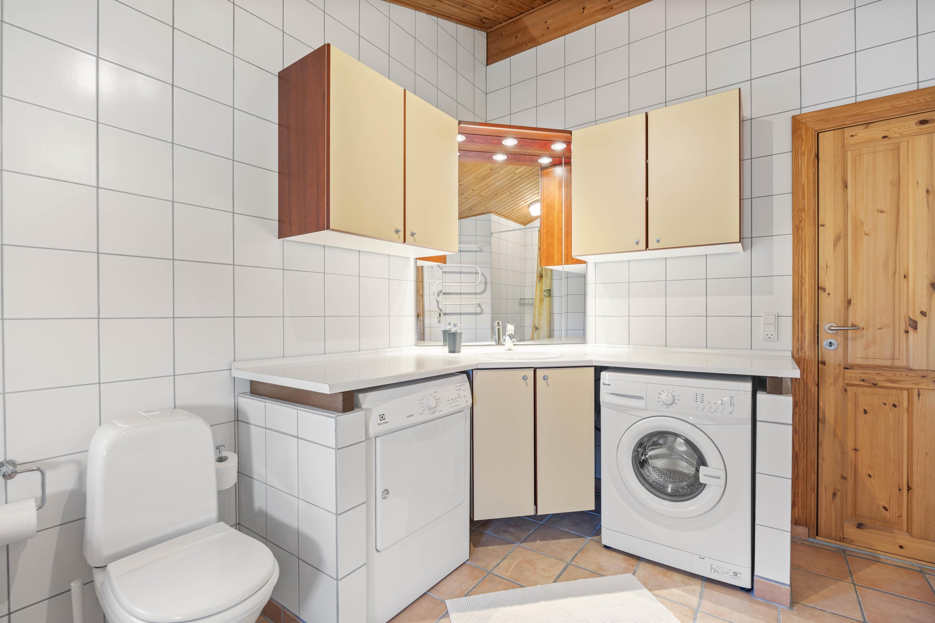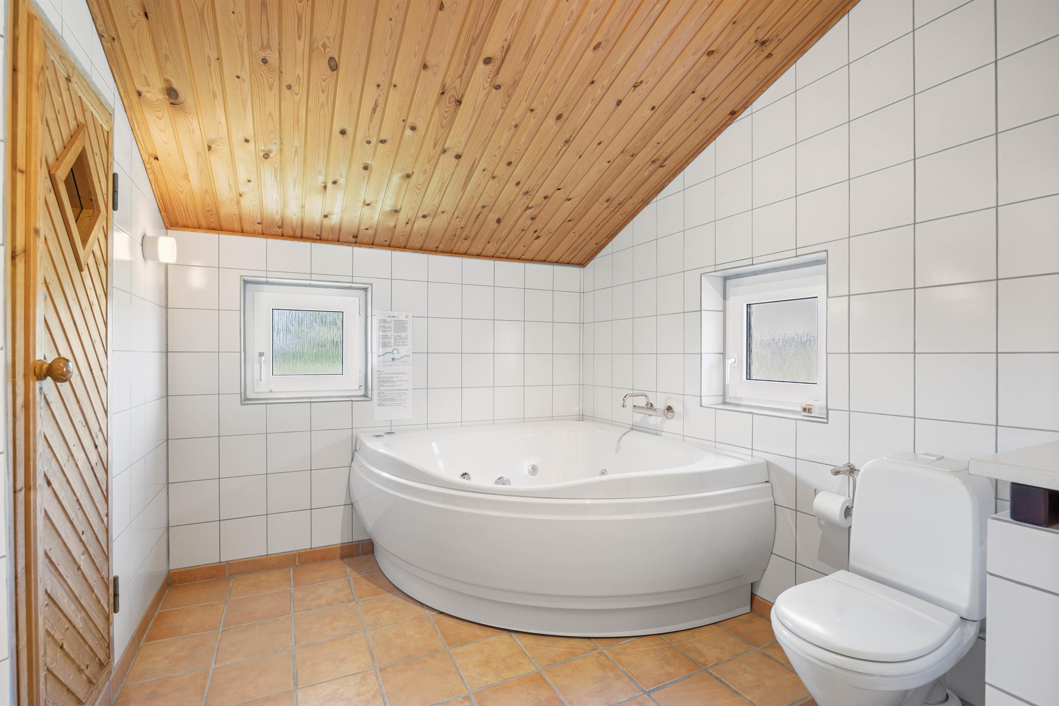 Både badeværelset samt gæstetoilettet er udstyret med gulvvarme. På badeværelset er der god mulighed for afslappende stunder, da I her finder sommerhusets sauna og spabad. En vaskemaskine og en tørretumbler står til jeres rådighed, så I kan friske jeres tøj og håndklæder op i løbet af ferien.