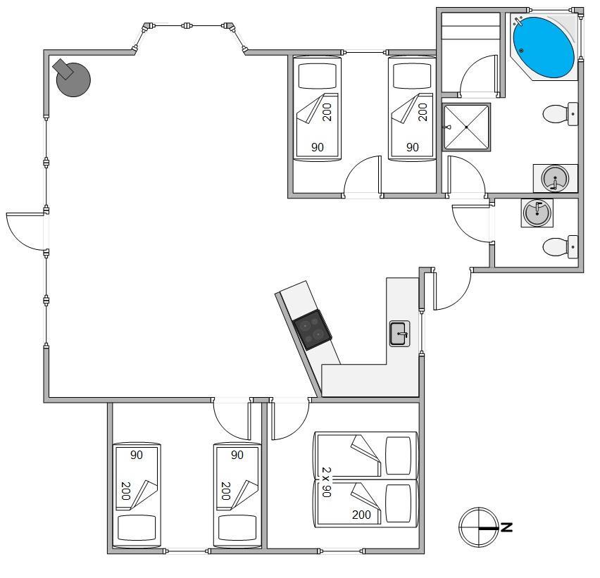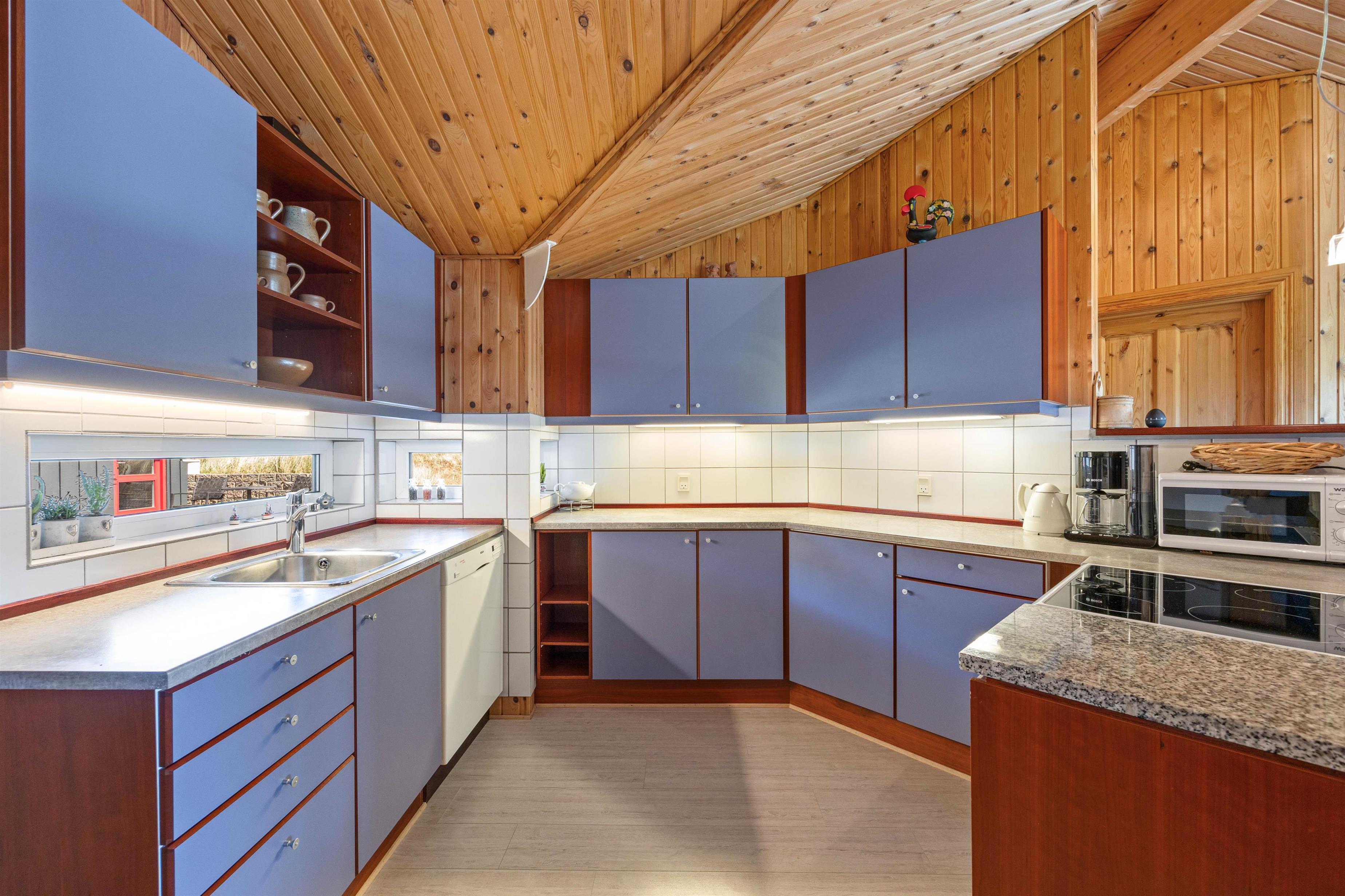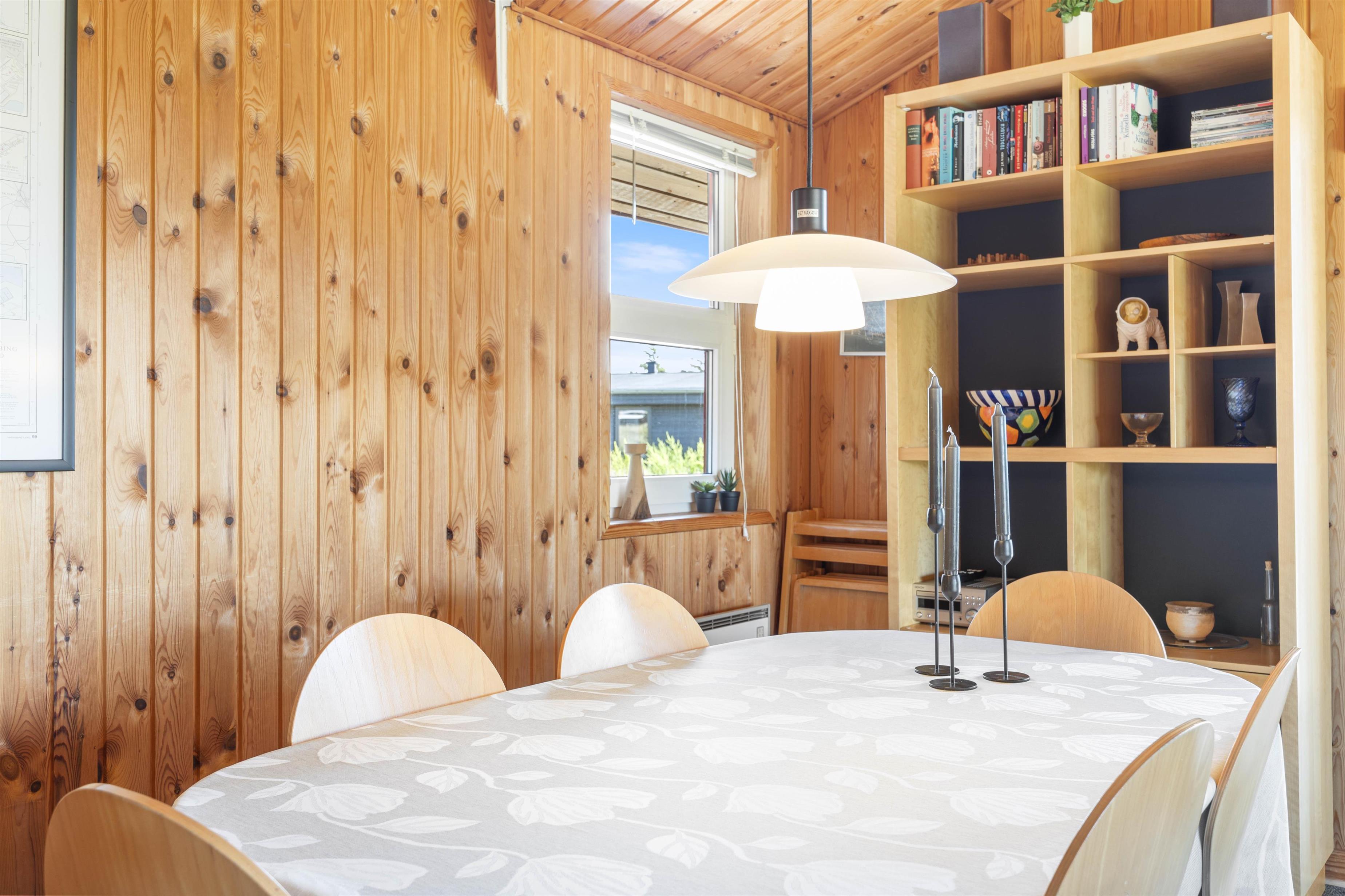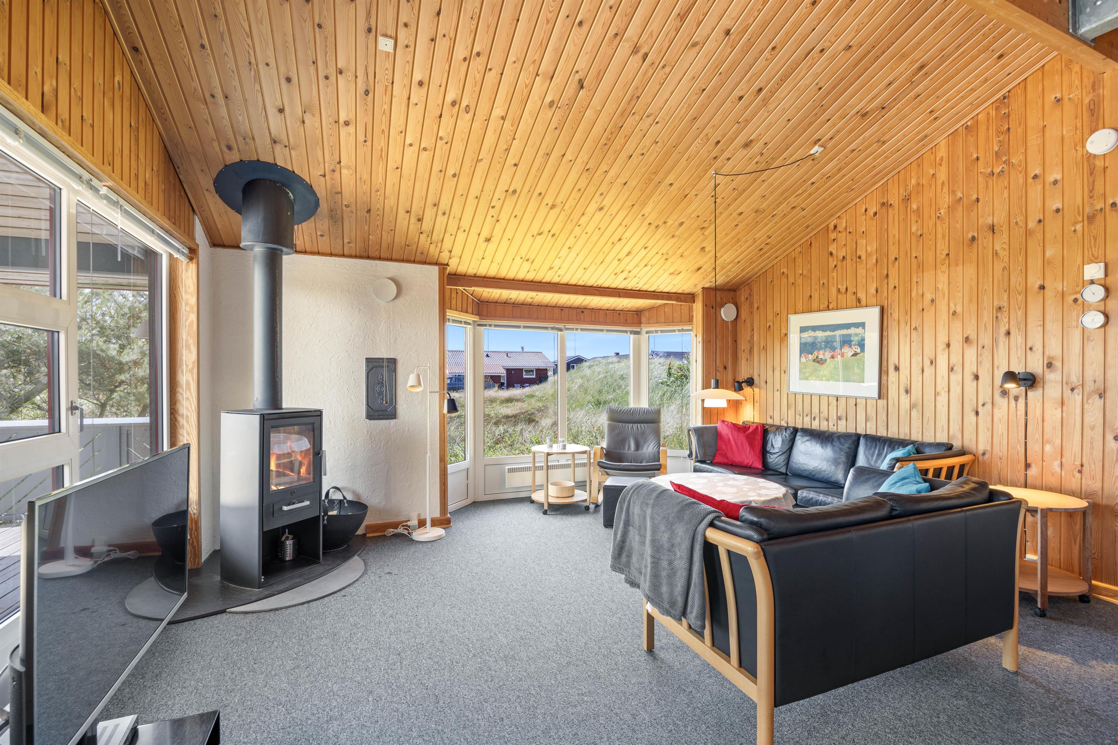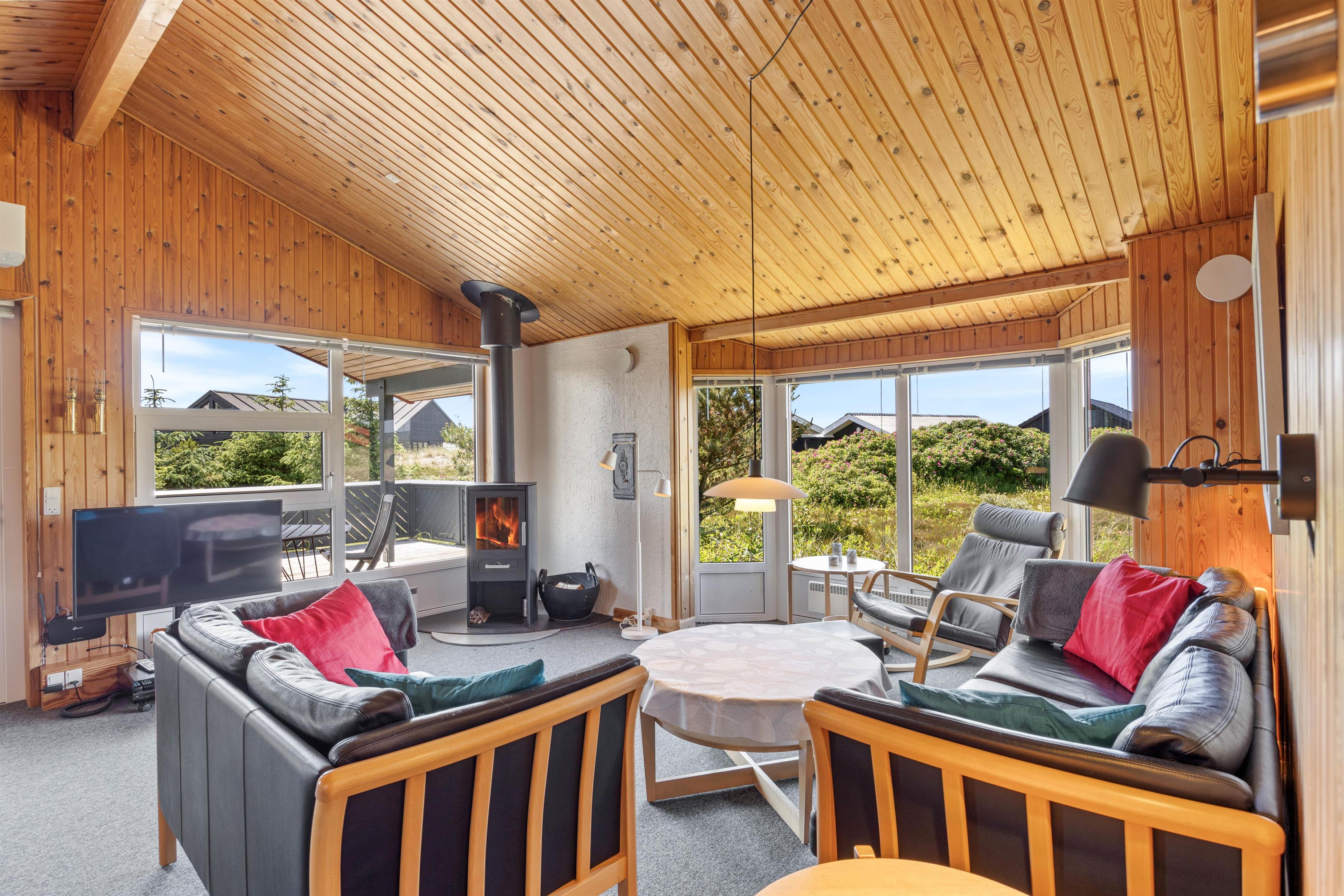 Sommerhusets samlingssted er alrummet, der, med store vinduespartier, rustik træbeklædning til kip og hyggelige møbler, indbyder til afslapning for hele familien. Fjernsynet med Chromecast og et Bluetooth-højttalersystem sørger for underholdning for både store og små, mens brændeovnen og den energibesparende luft-til-luft varmepumpe giver behagelig varme på køligere aftener.