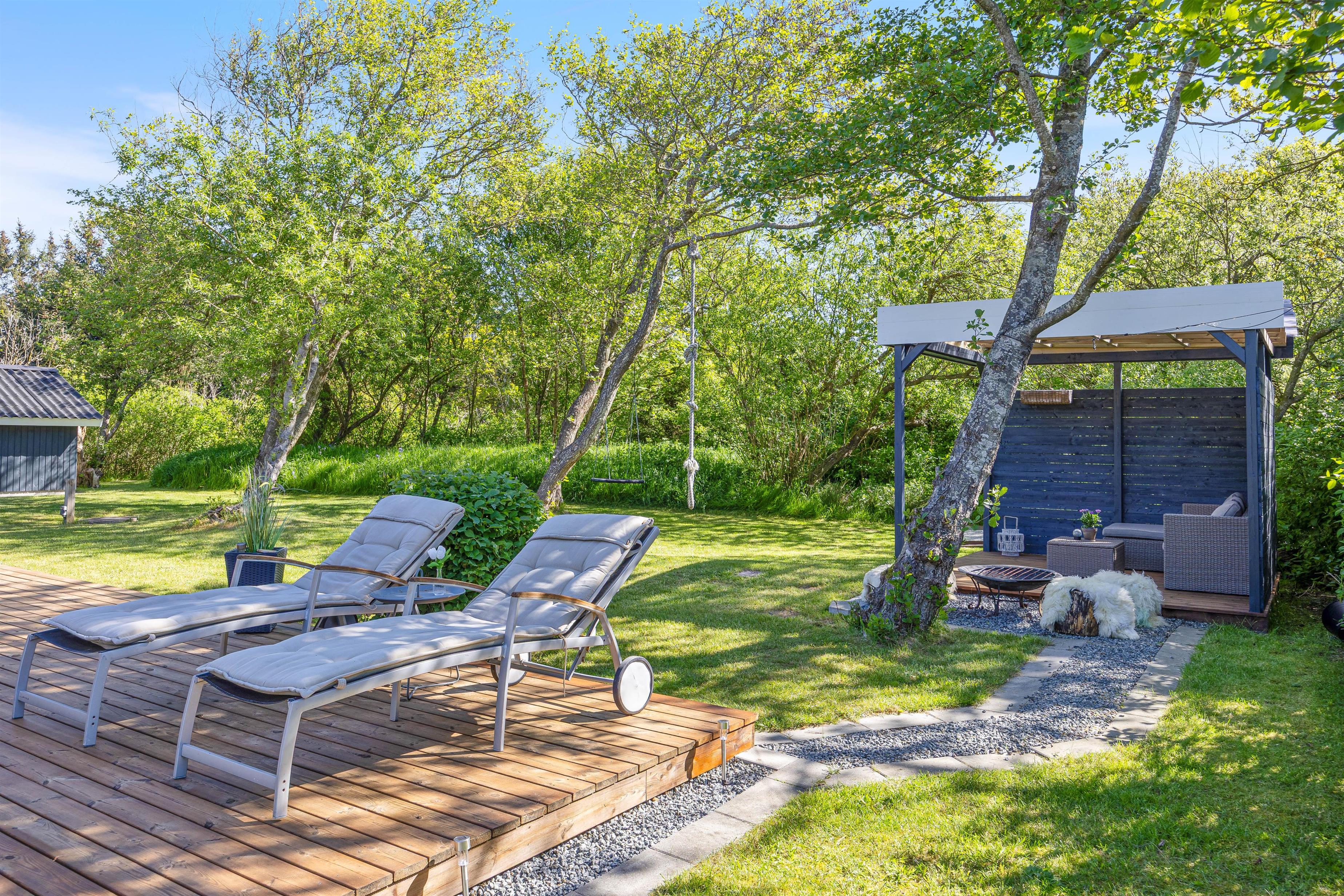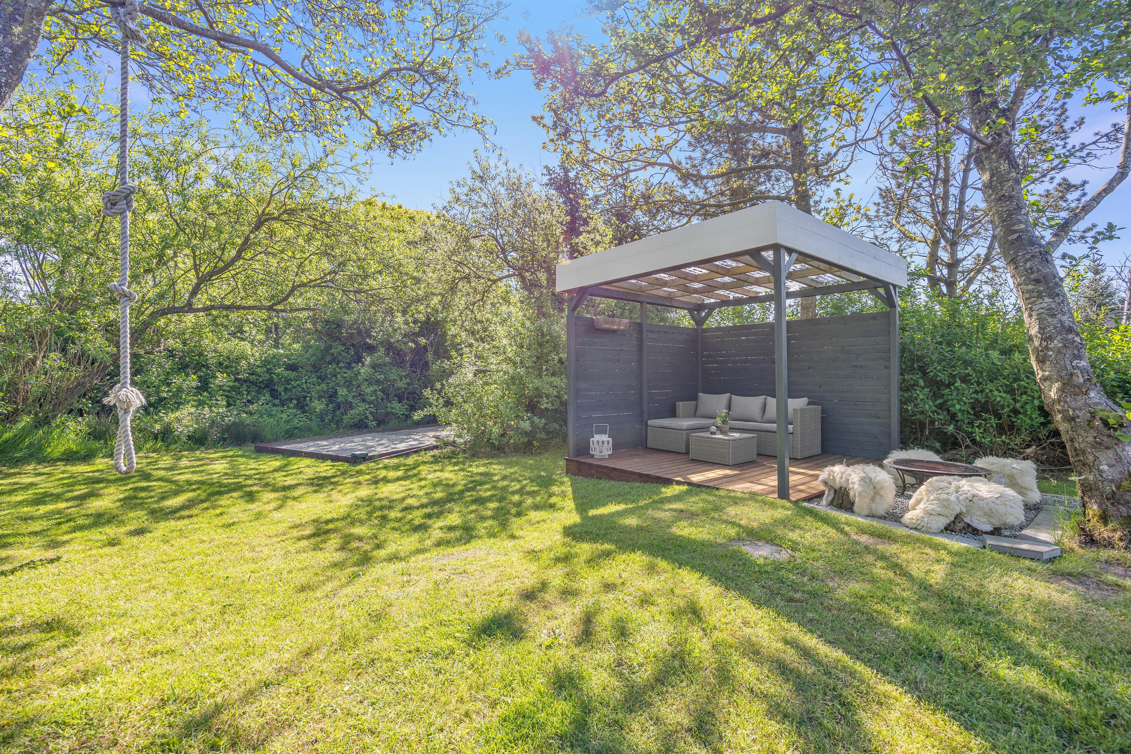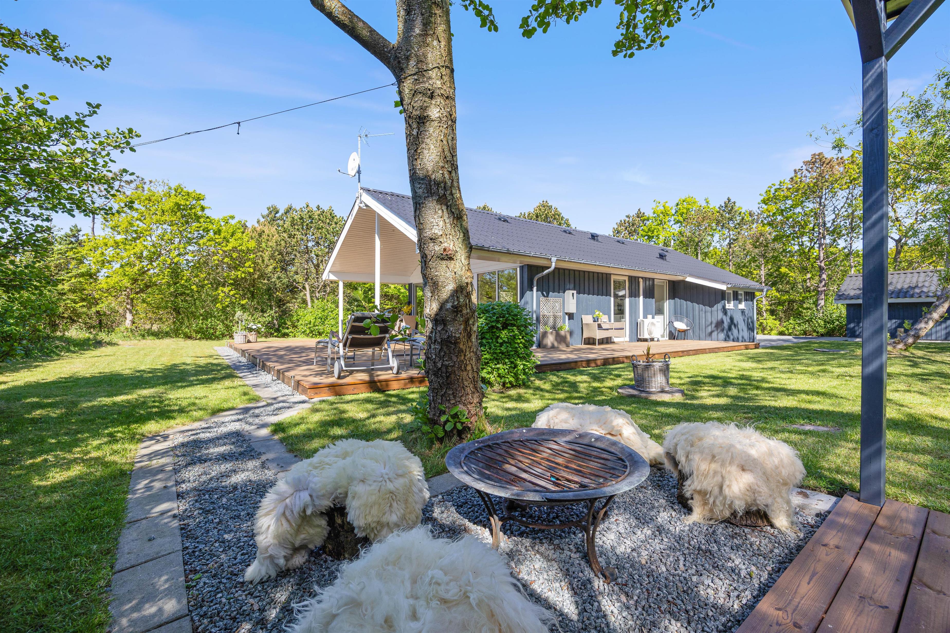 Fra stuen har I direkte udgang til den sydvendte terrasse, som er afskærmet og overdækket. Her kan I nyde middagssolen og slutte dagen af med et lækkert grillmåltid, imens solen går ned i vest. Grunden ligger på en stikvej og er omringet af træer, så I ugeneret kan sidde på terrassen. Aftenen kan sluttes af ved det hyggelige bålsted med snobrød og skumfiduser.