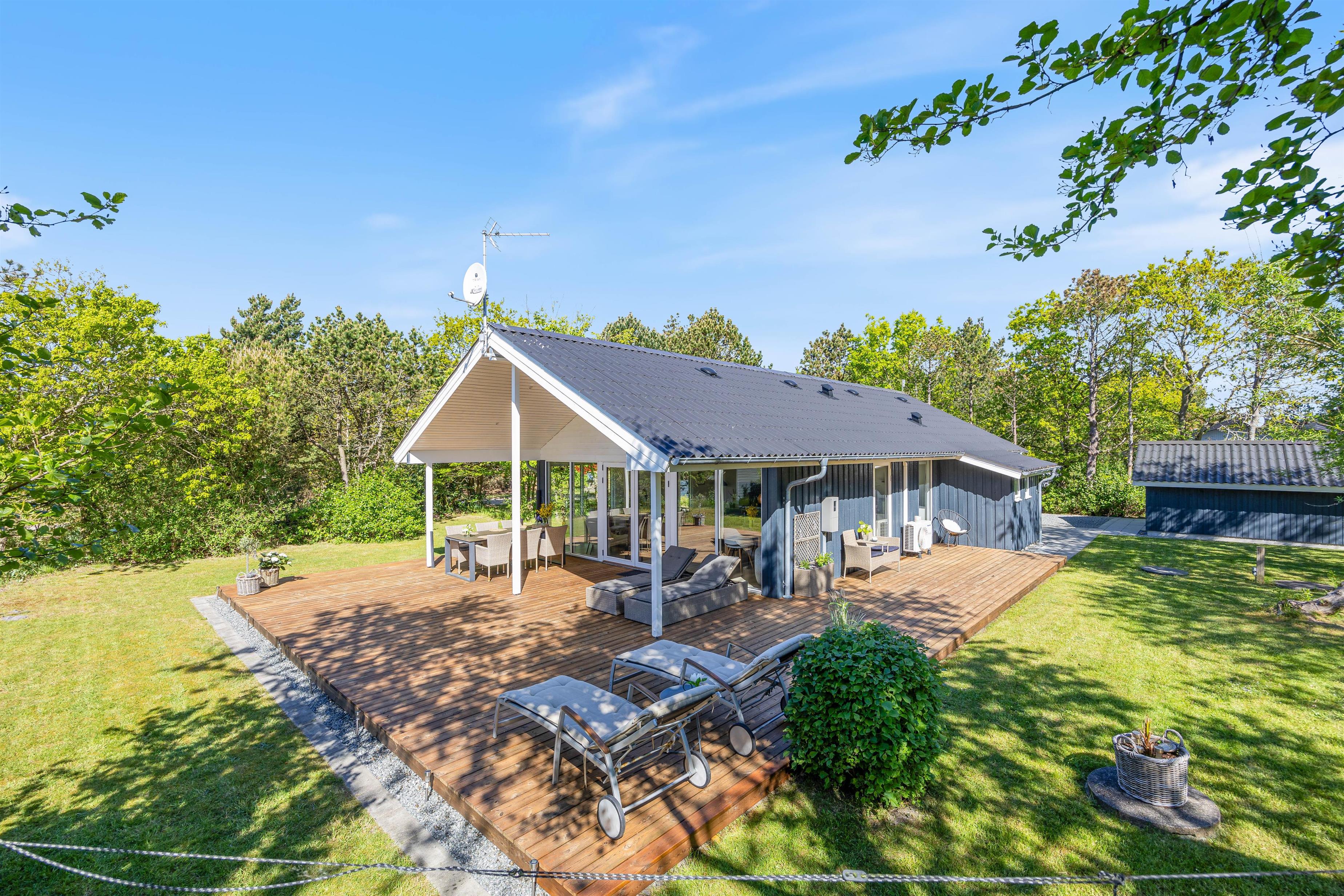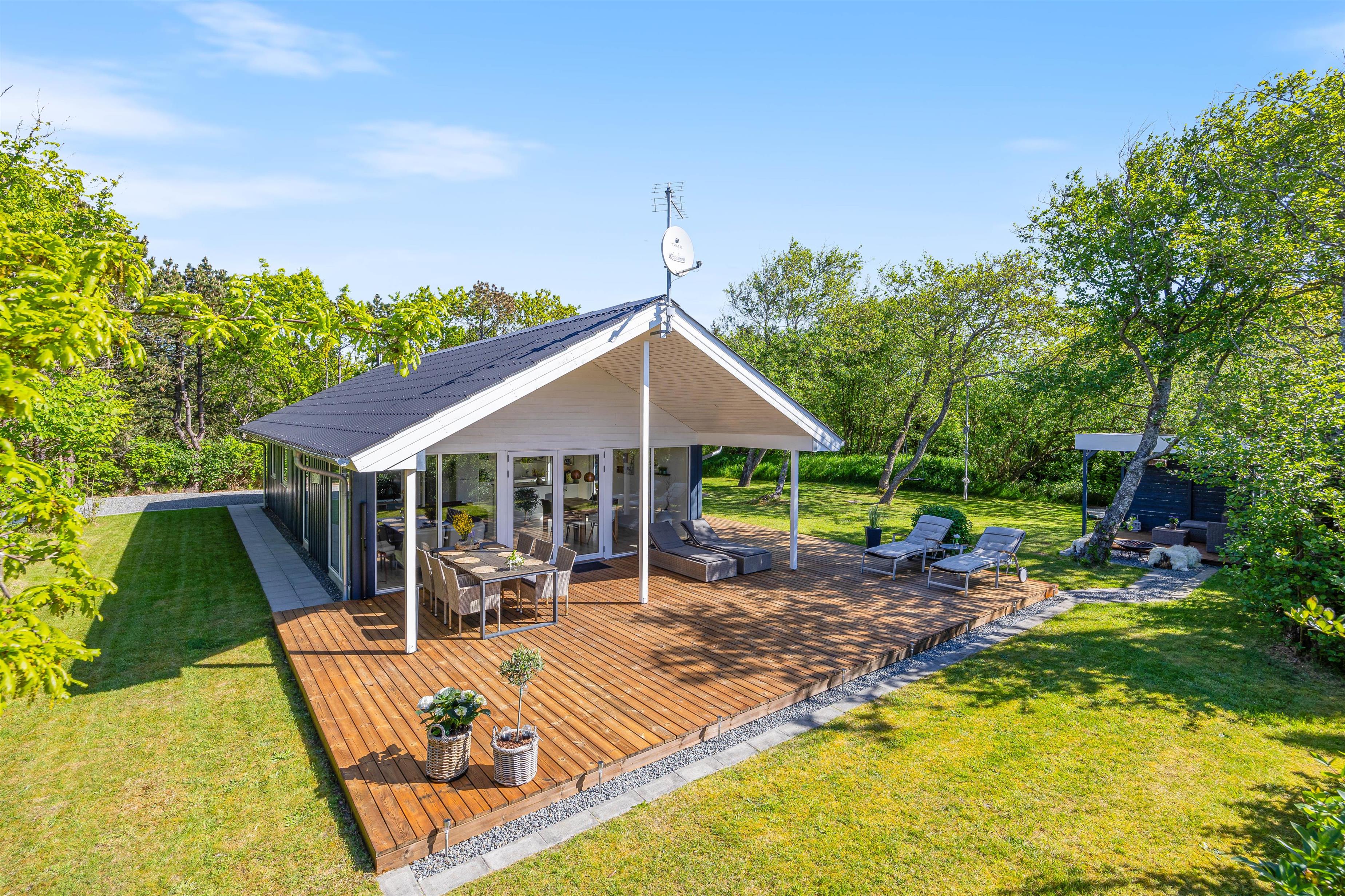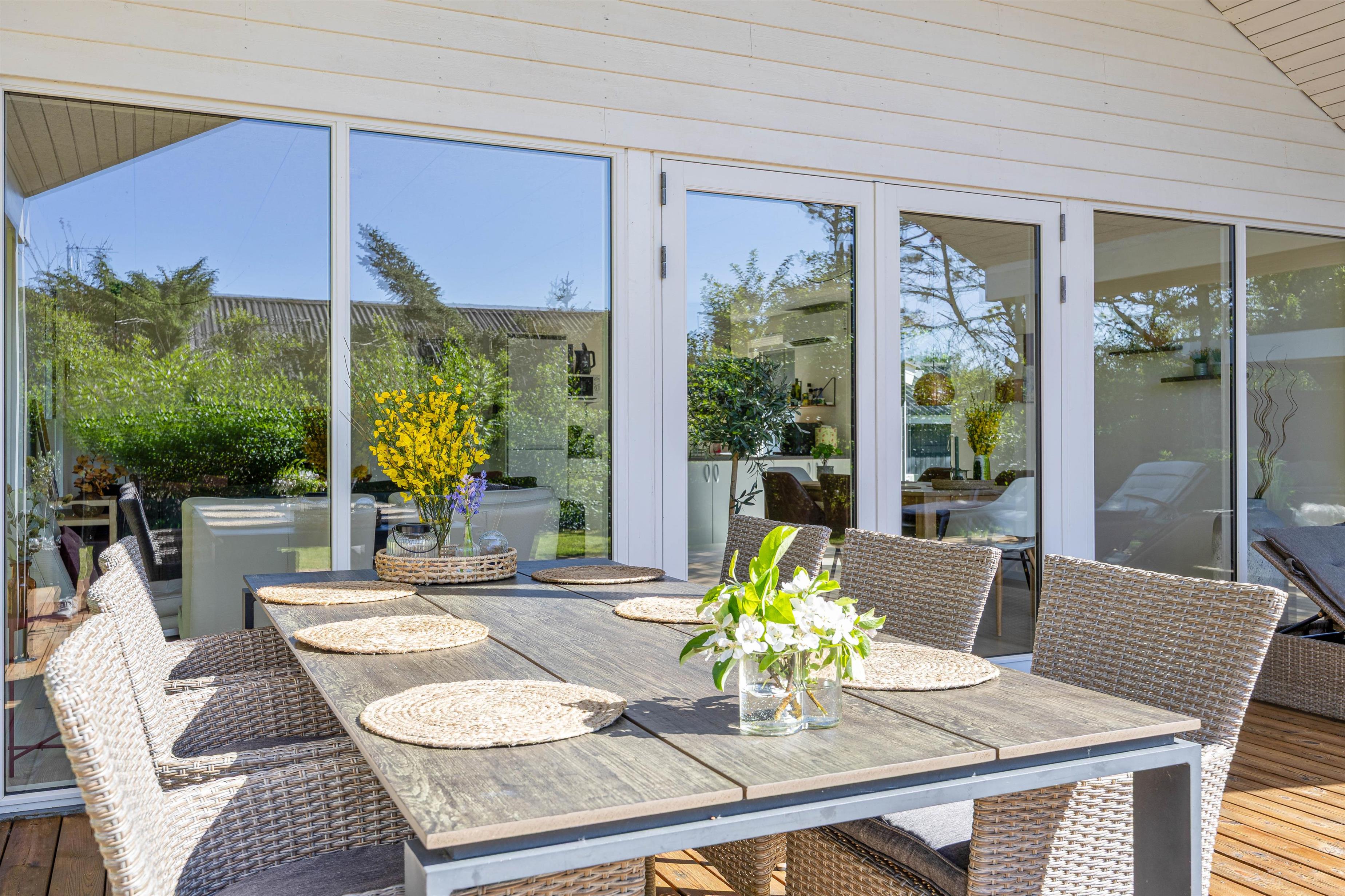 Fra stuen har I direkte udgang til den sydvendte terrasse, som er afskærmet og overdækket. Her kan I nyde middagssolen og slutte dagen af med et lækkert grillmåltid, imens solen går ned i vest. Grunden ligger på en stikvej og er omringet af træer, så I ugeneret kan sidde på terrassen. Aftenen kan sluttes af ved det hyggelige bålsted med snobrød og skumfiduser.