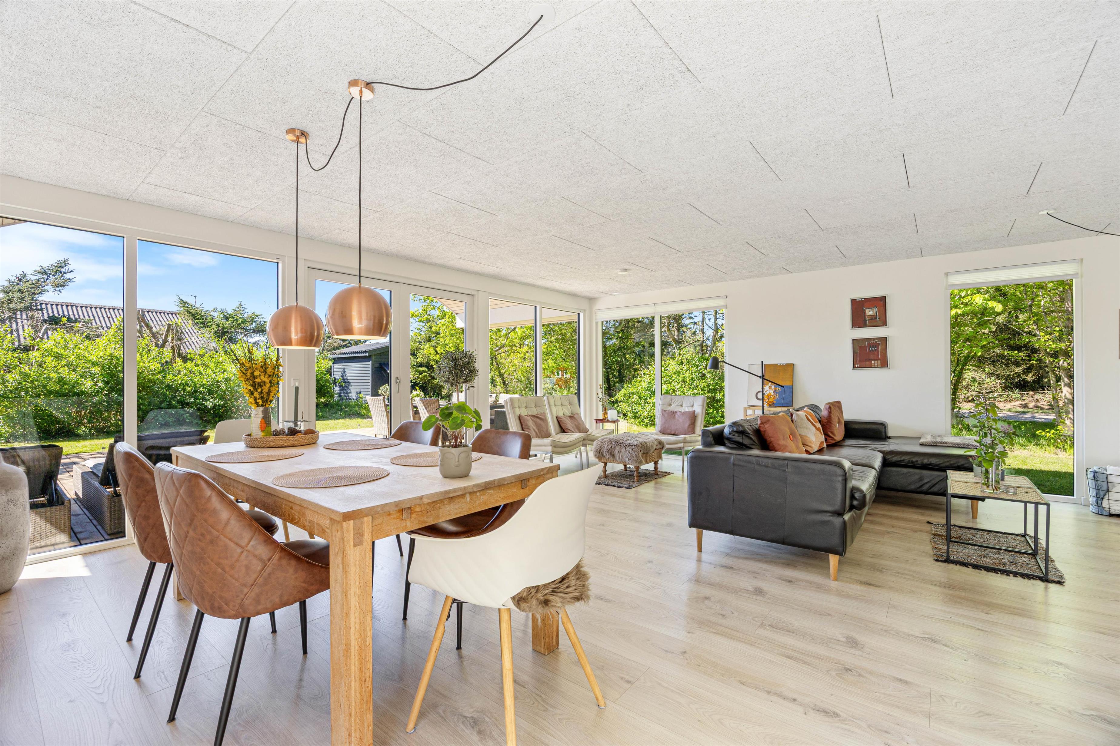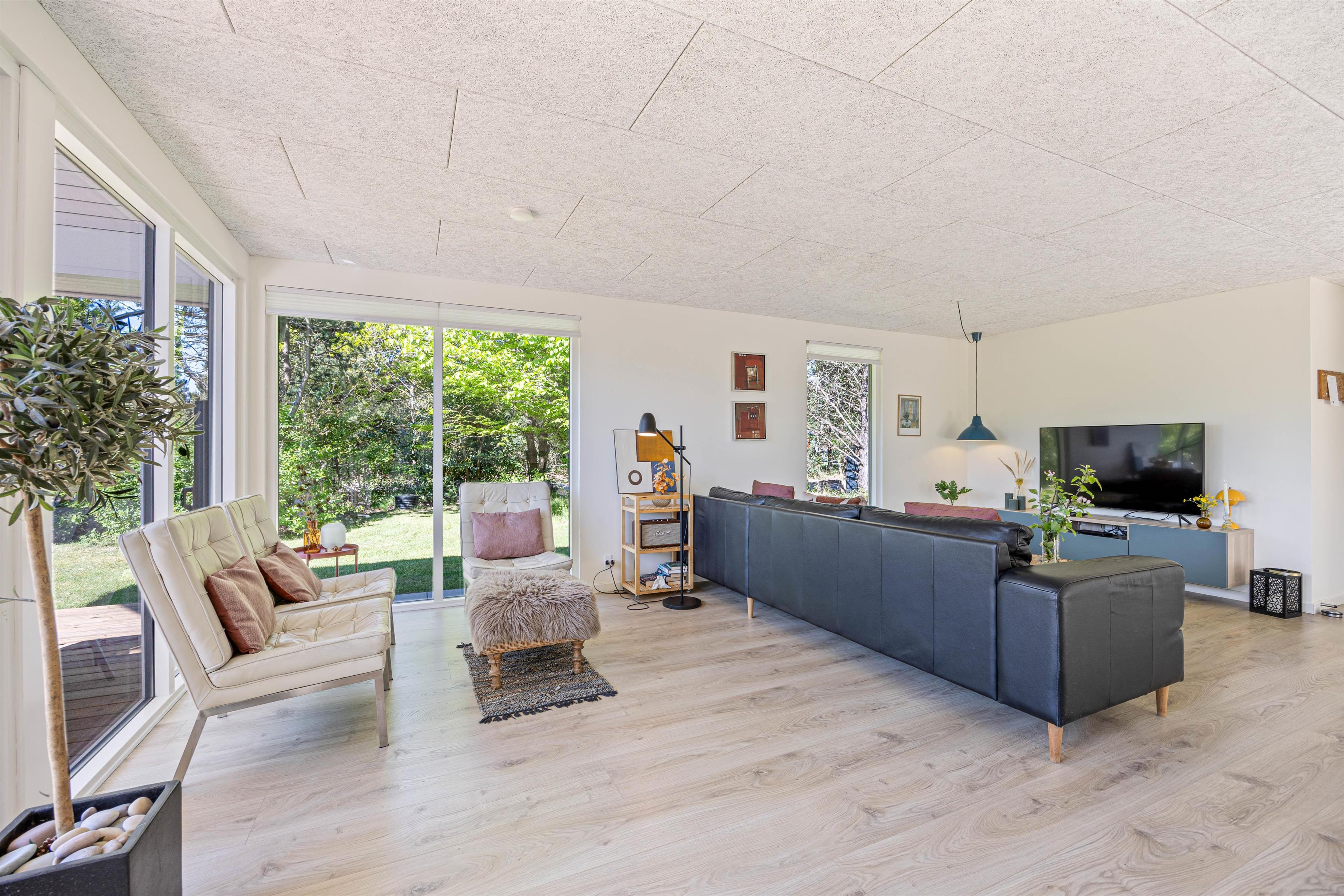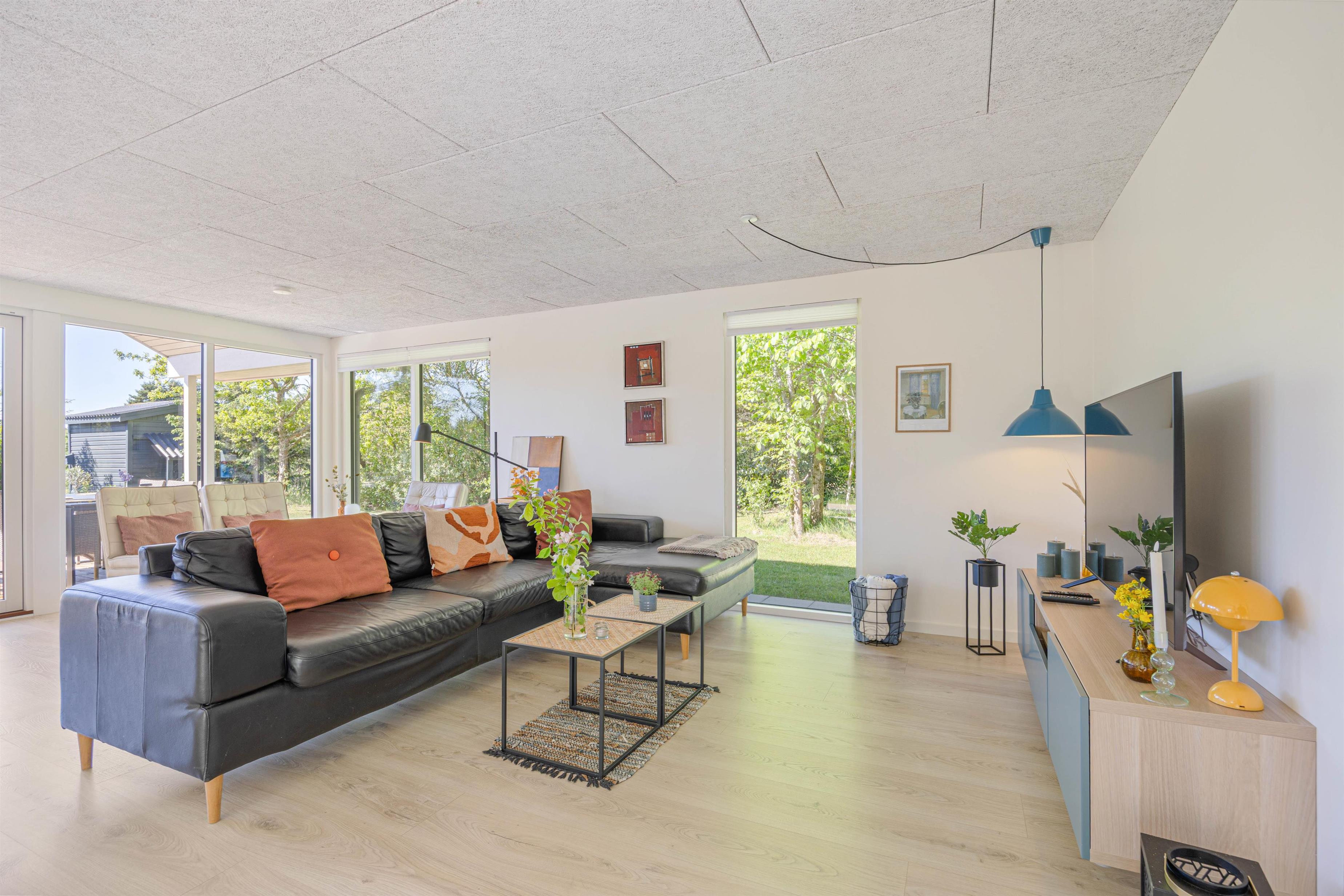 De store vinduer i opholdsrummet skaber et godt lysindfald, som gør rummet lyst og indbydende. Herfra har I også en fin udsigt til den skønne naturgrund, hvor børnene kan lege, imens I laver et lækkert aftensmåltid. I feriehuset er der desuden 3 gode soveværelser, hvor I kan slappe af og få en god nats søvn, inden morgendagens aktiviteter skal begynde. Derudover har badeværelset gulvvarme, og her finder I også vaskemaskine samt tørretumbler, så I har mulighed for at vaske tøj under ferien.
