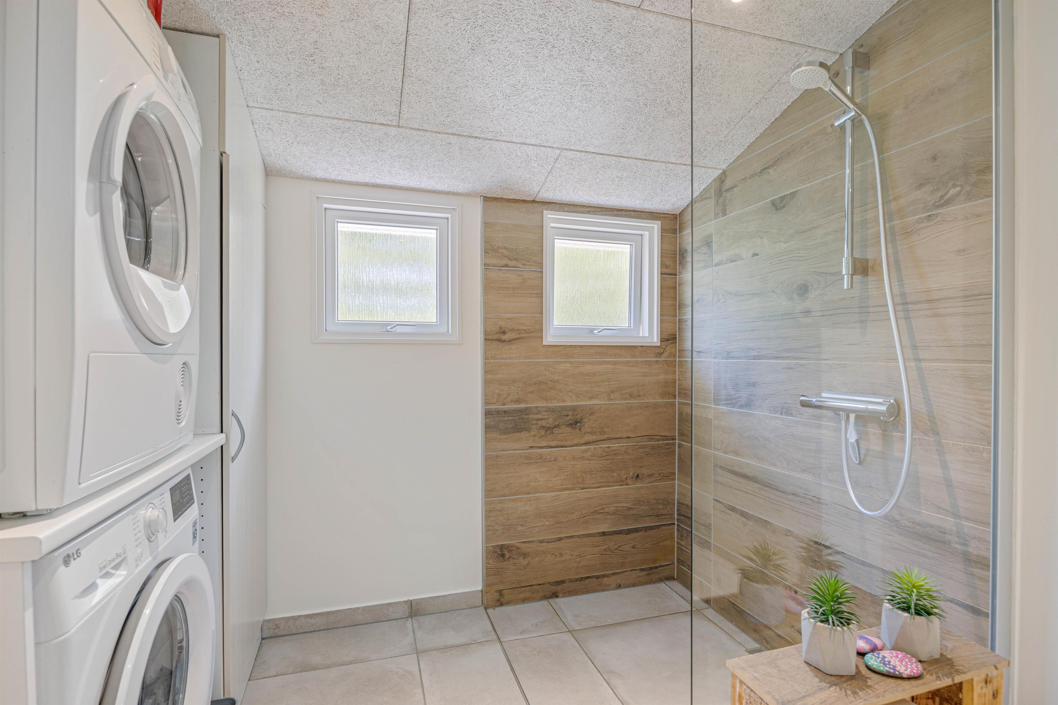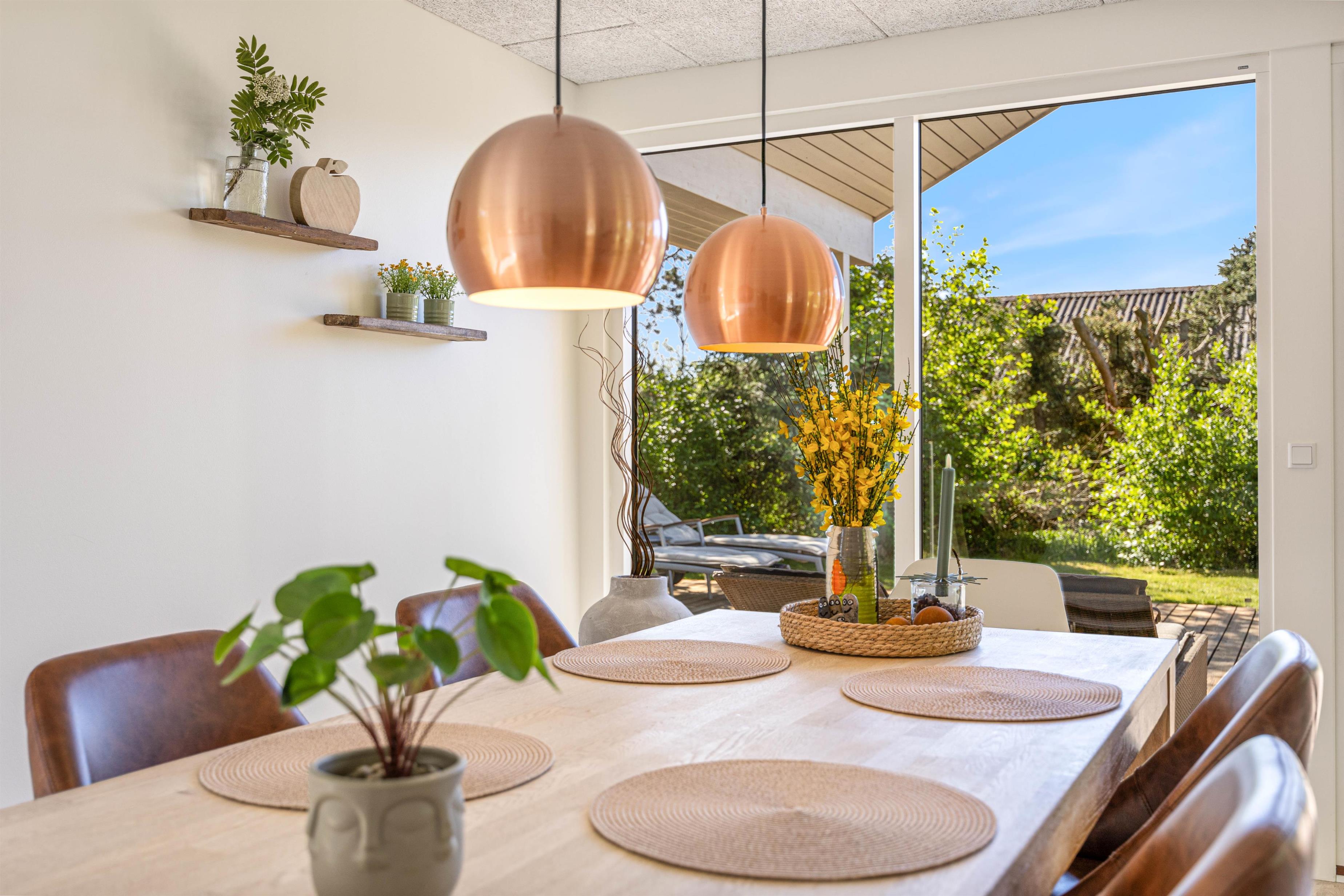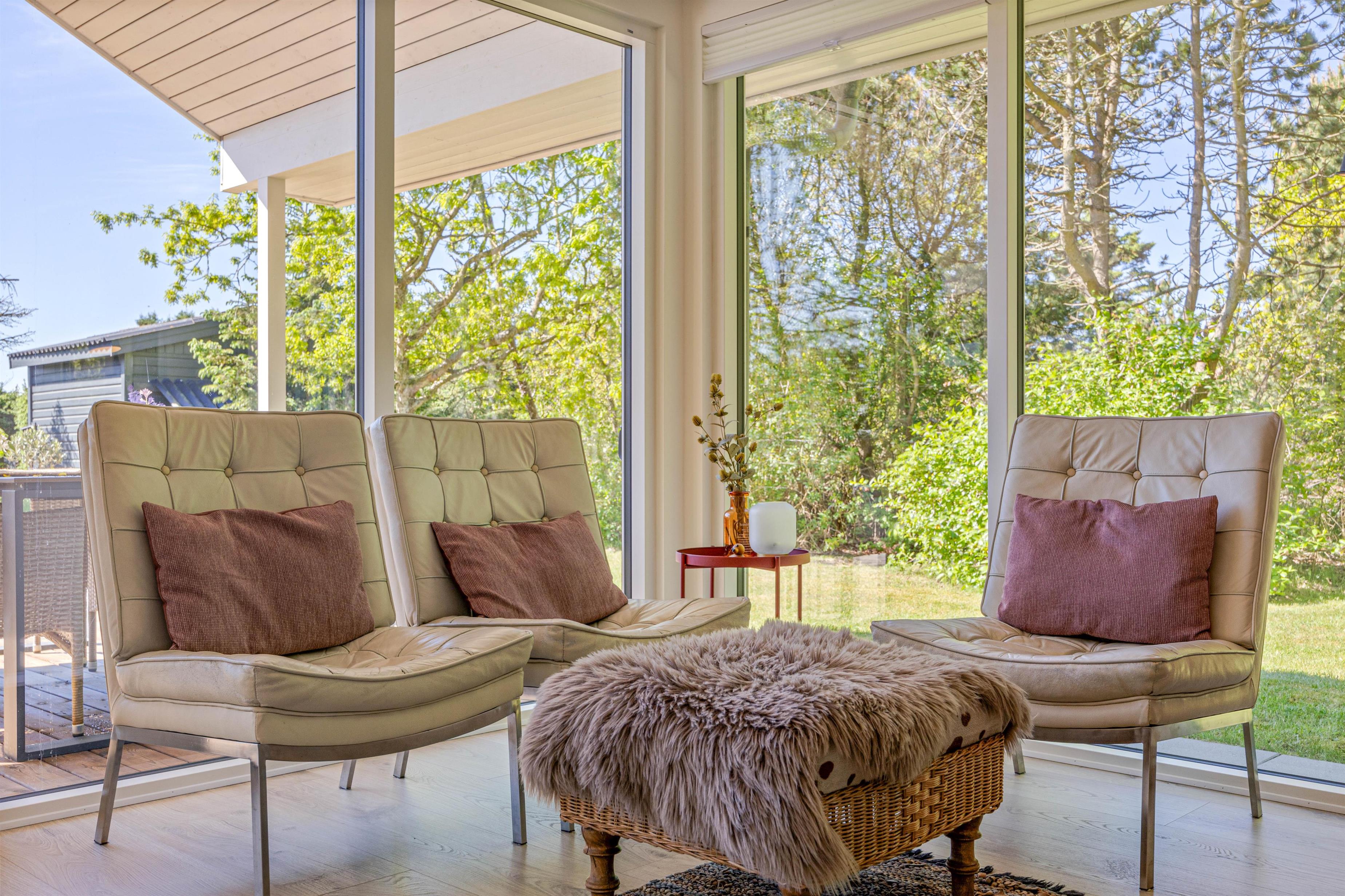 De store vinduer i opholdsrummet skaber et godt lysindfald, som gør rummet lyst og indbydende. Herfra har I også en fin udsigt til den skønne naturgrund, hvor børnene kan lege, imens I laver et lækkert aftensmåltid. I feriehuset er der desuden 3 gode soveværelser, hvor I kan slappe af og få en god nats søvn, inden morgendagens aktiviteter skal begynde. Derudover har badeværelset gulvvarme, og her finder I også vaskemaskine samt tørretumbler, så I har mulighed for at vaske tøj under ferien.