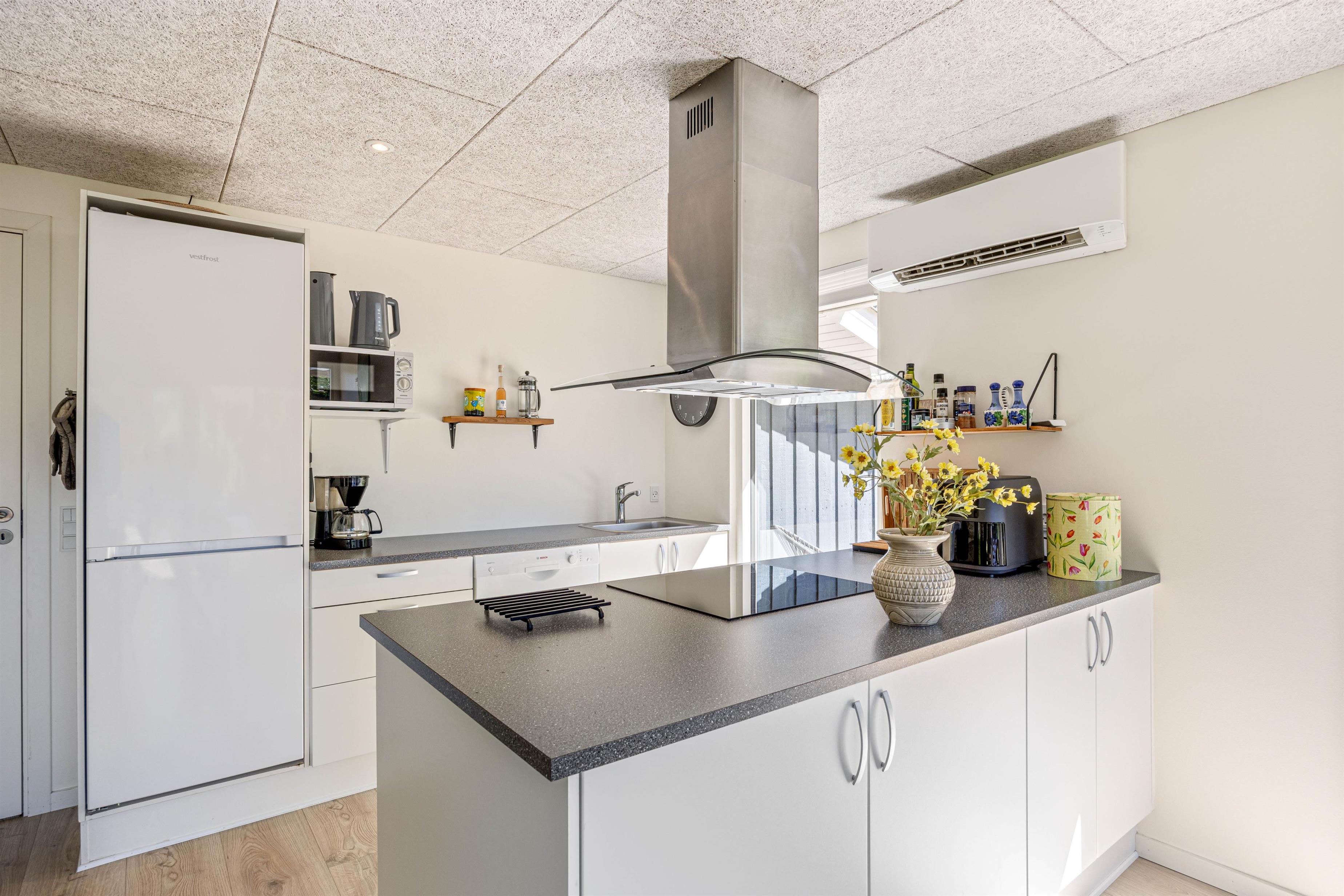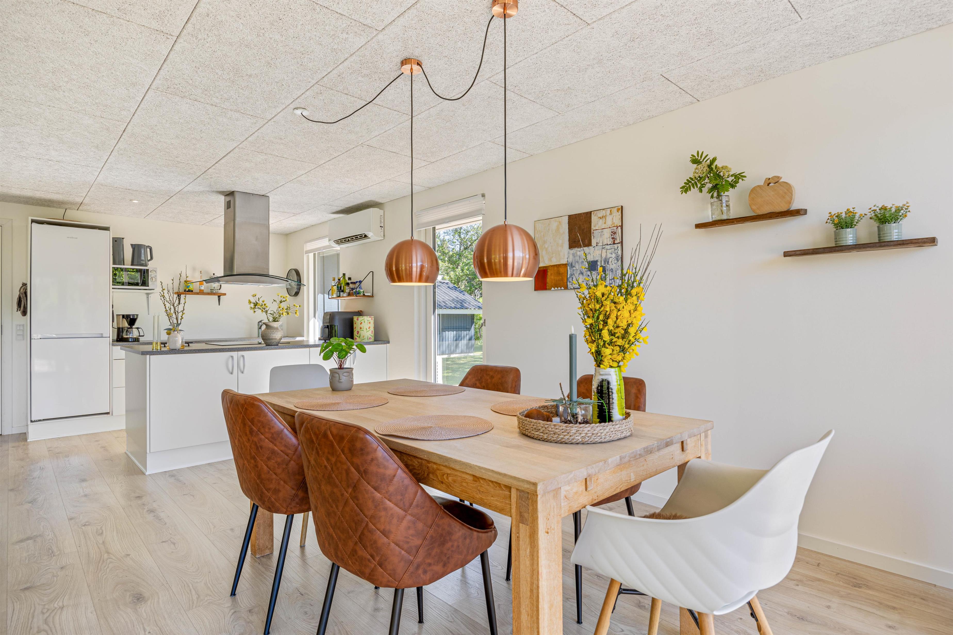 Sommerhuset til 6 personer har et fantastisk opholdsrum, hvor stuen ligger i åben forbindelse med køkkenet. Her er der plads til, at hele familien kan samles til hyggelige stunder. Her er mulighed for at se danske tv-kanaler, men der er også en chromecast til rådighed, så I kan streame jeres yndlingsfilm direkte fra telefonen.