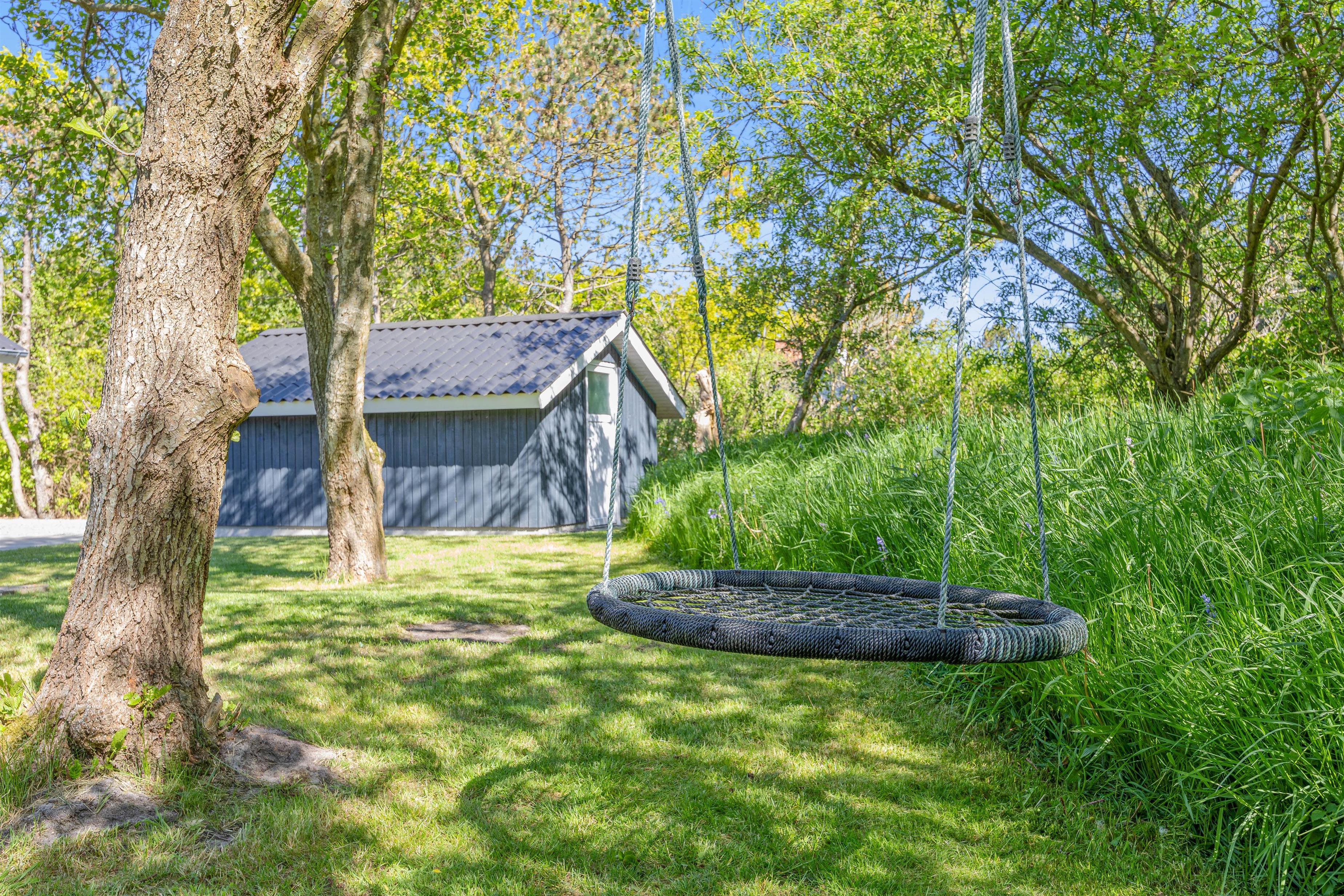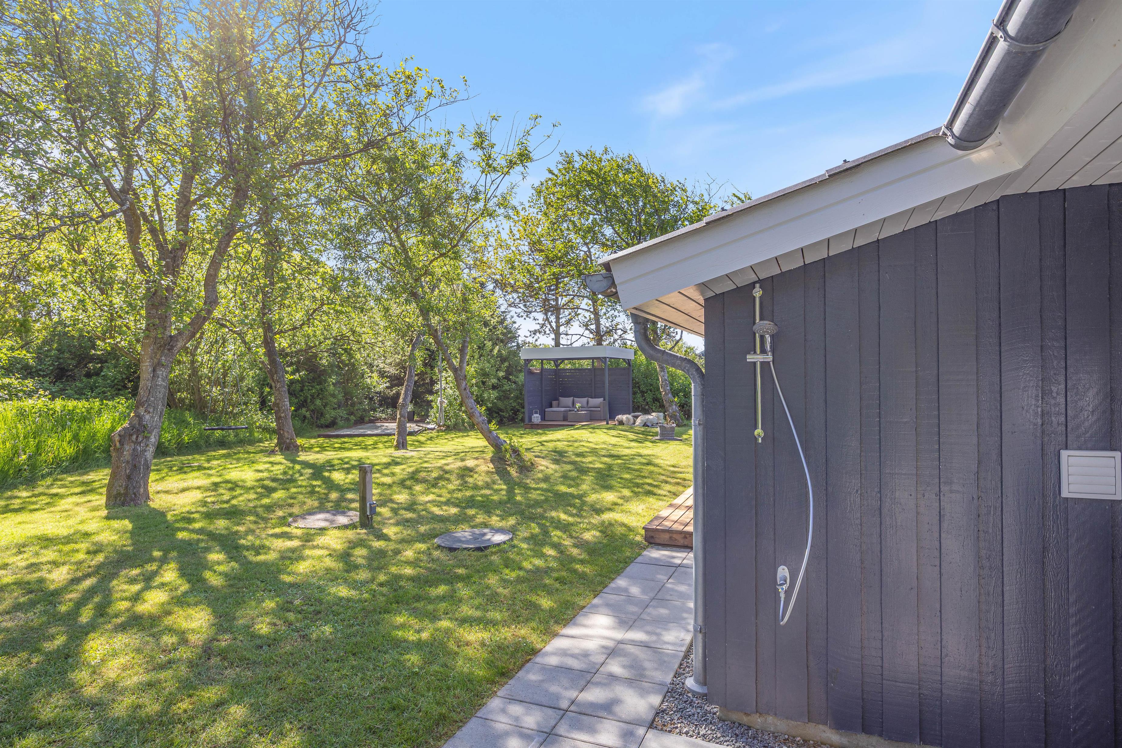 Naturgrunden er udstyret med en gynge til de yngste samt en udebruser (kan benyttes fra april til november). Her kan I skylle jer efter en god dag på stranden, som ligger 850 meter fra sommerhuset – måske I har været en tur i bølgen blå? Og som et ekstra plus er der en petanquebane på grunden, hvor I kan få mange timer til at gå med en spændende turnering.
