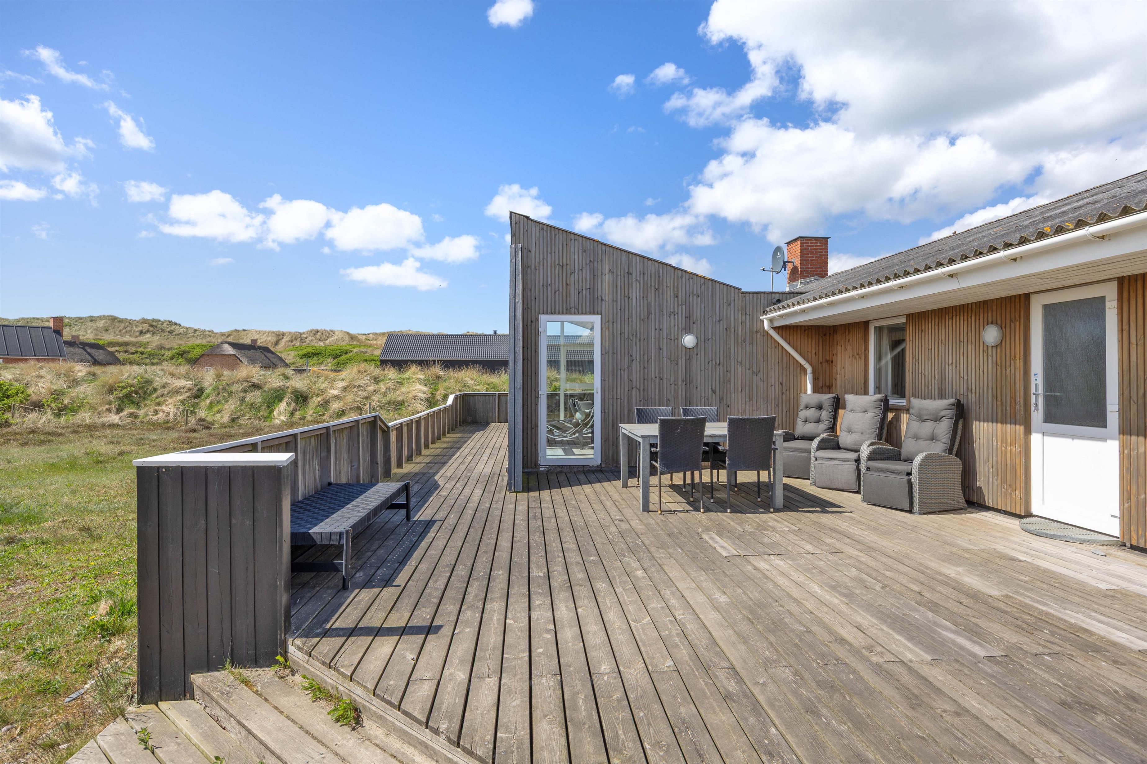 Sommerhuset er beliggende på en stor naturgrund i det storslåede klit- og hedelandskab på Holmsland Klit på Danmarks vestkyst. På den store og delvist overdækkede terrasse kan I i fred og ro nyde naturen og den friske vesterhavsluft. Her finder I naturligvis havemøbler, liggestole og en grill, som gør feriemadlavningen til en fornøjelse.