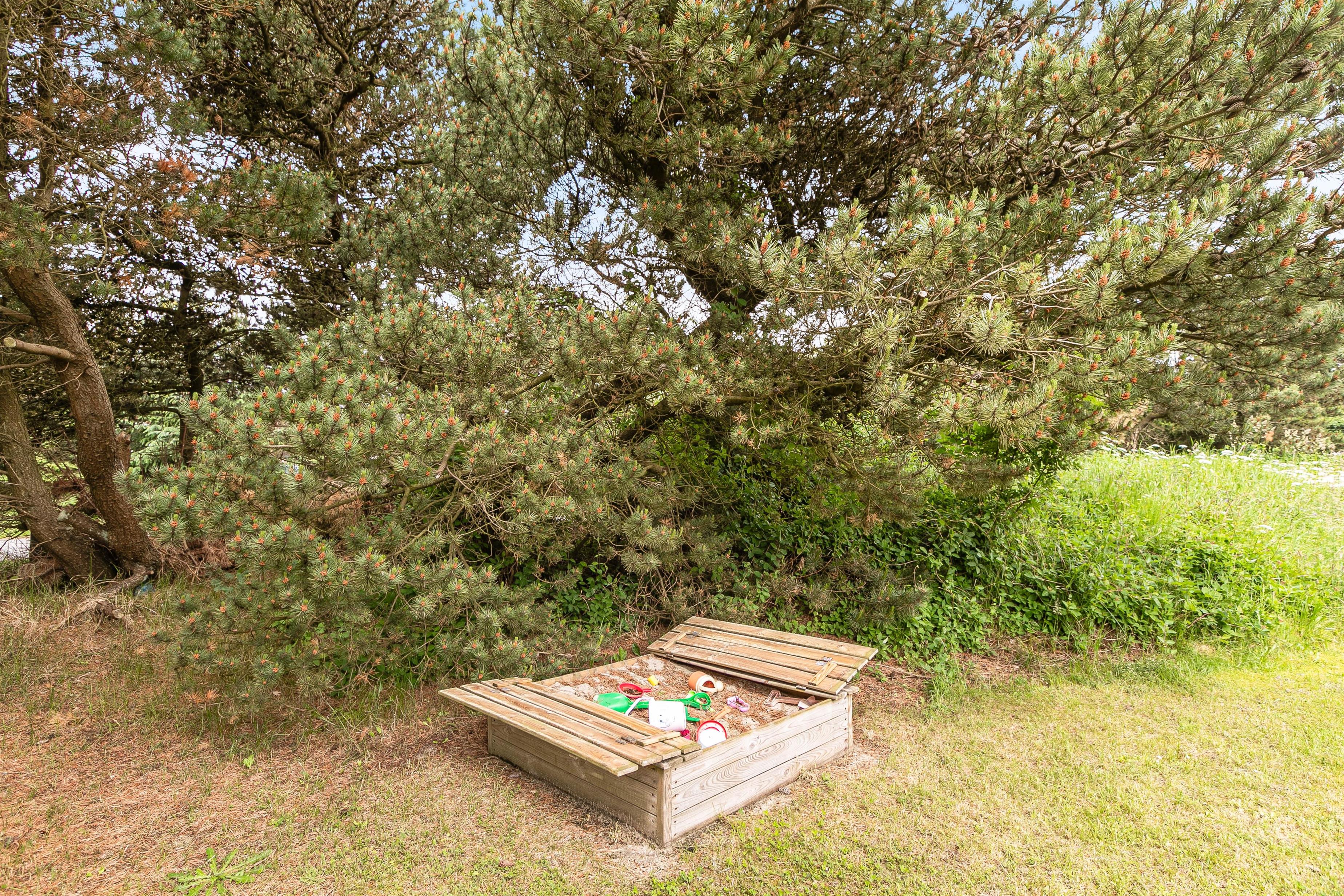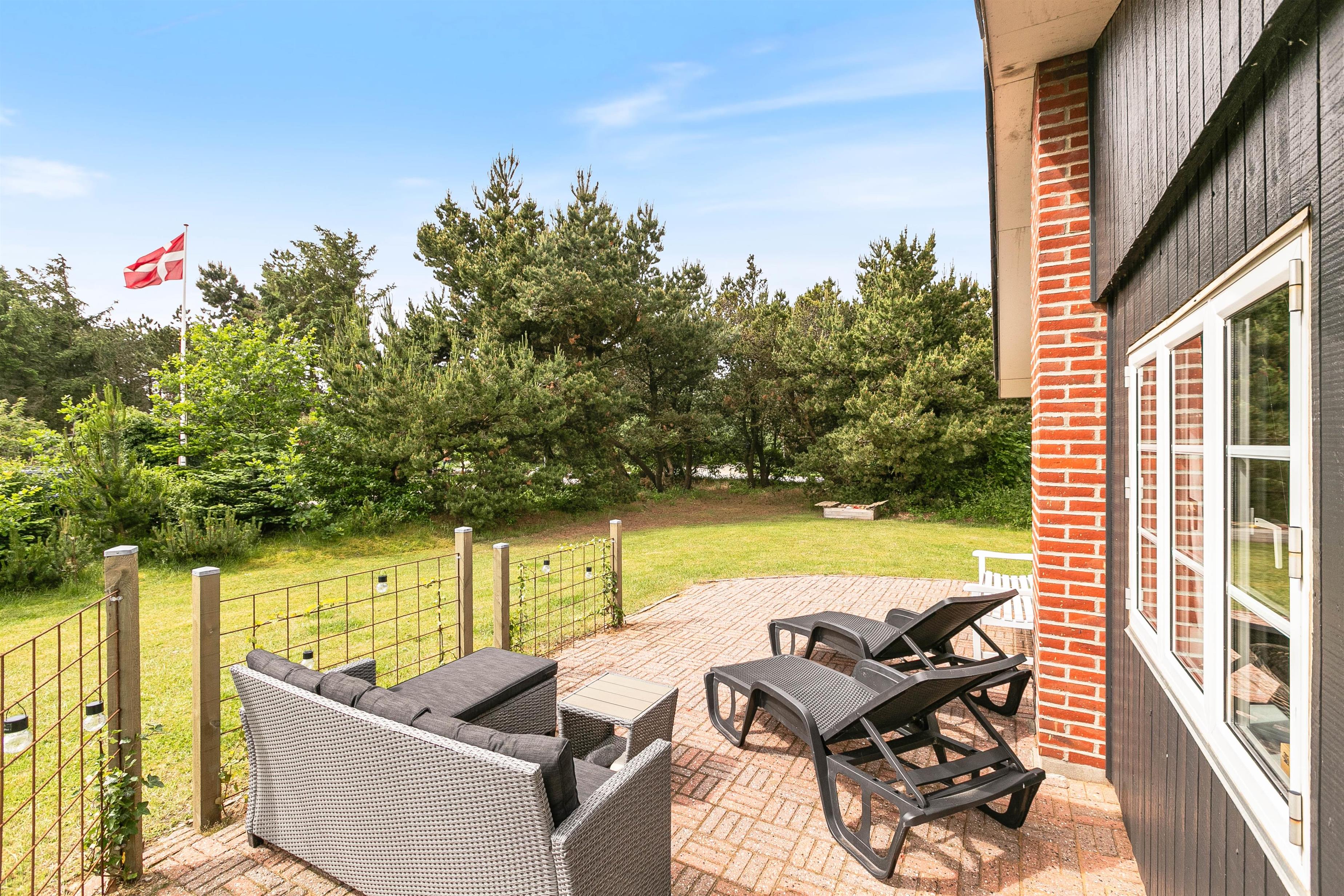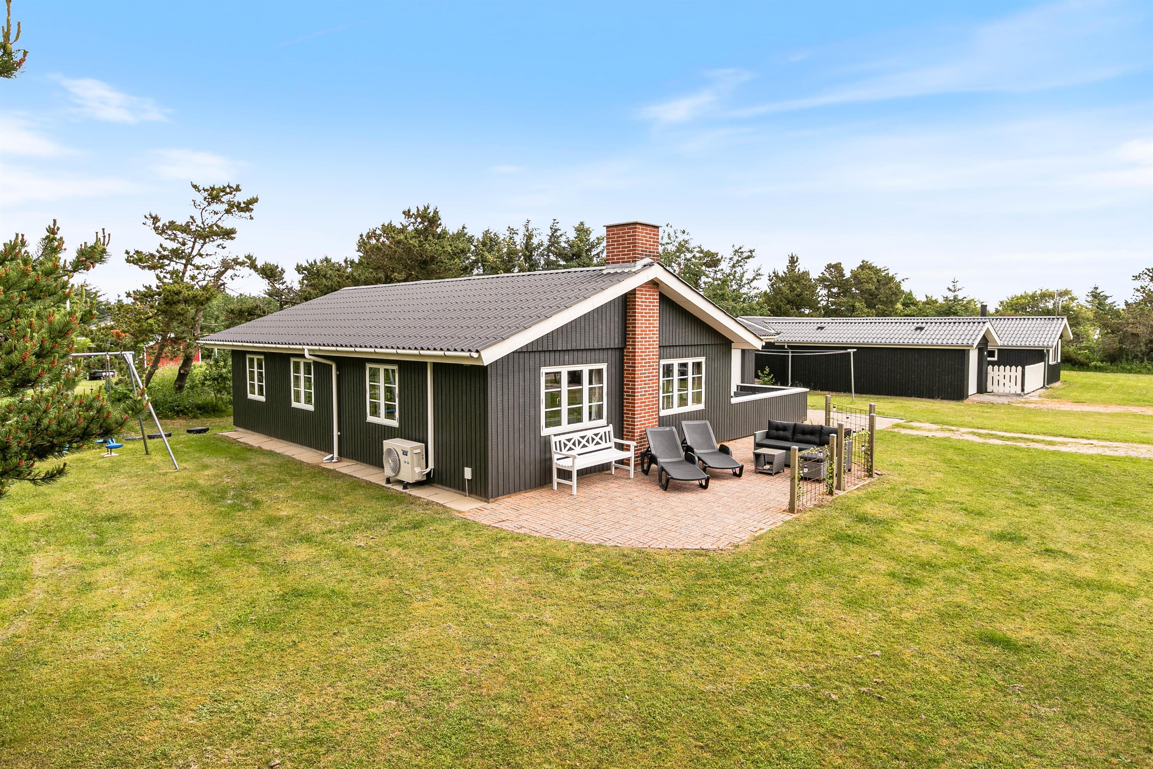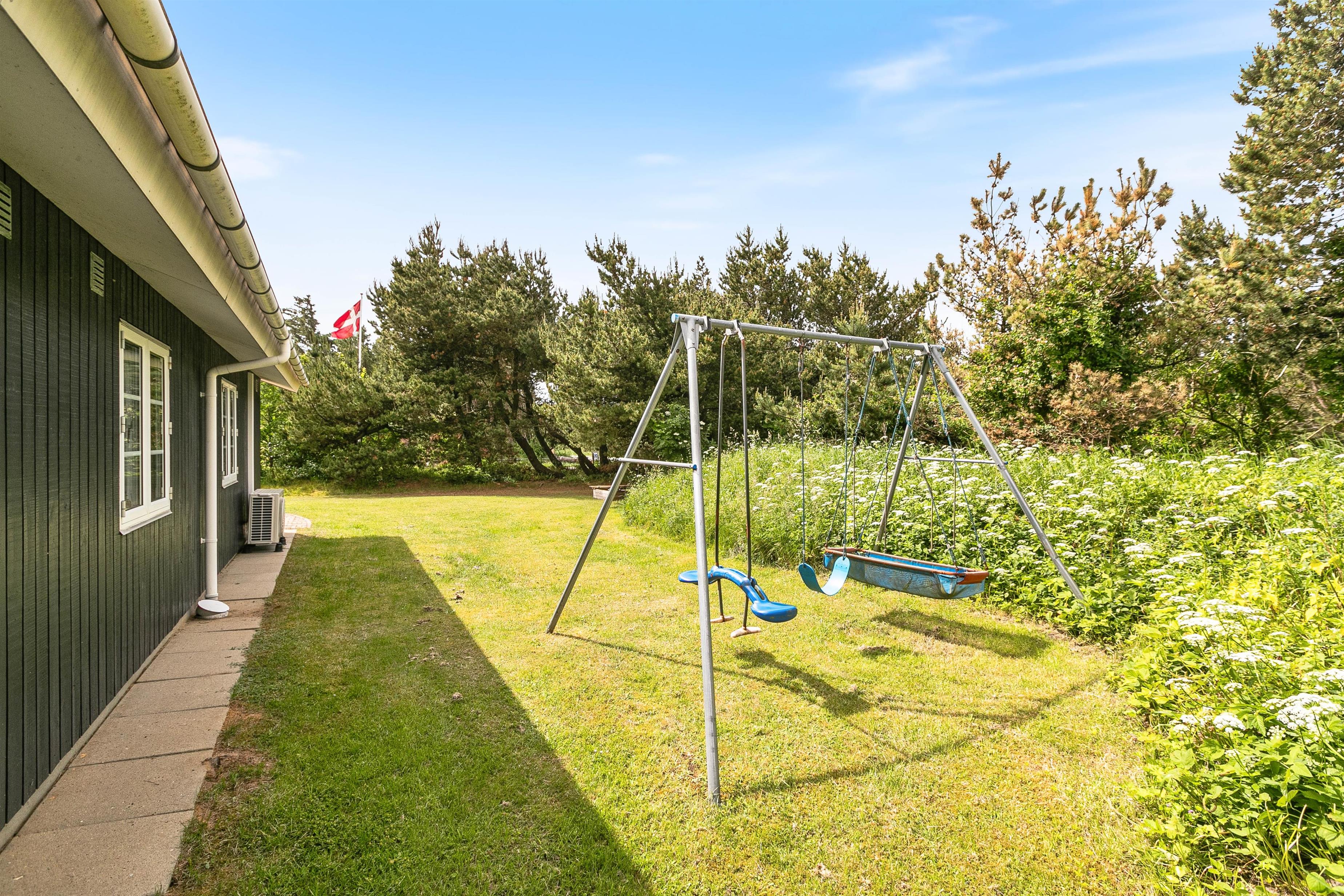 Sommerhuset er beliggende på en fin naturgrund, er omgivet af fyrretræer på de tre sider og giver både læ samt fred og ro på ferien. Her kan børnene og hunden udfolde sig på plænen eller i gyngerne og sandkassen og den fine møblerede terrasse med grill opfordrer til nydelse af naturen og den friske havluft. Terrassen er delvist afskærmet, så I kan sidde i læ for vinden.