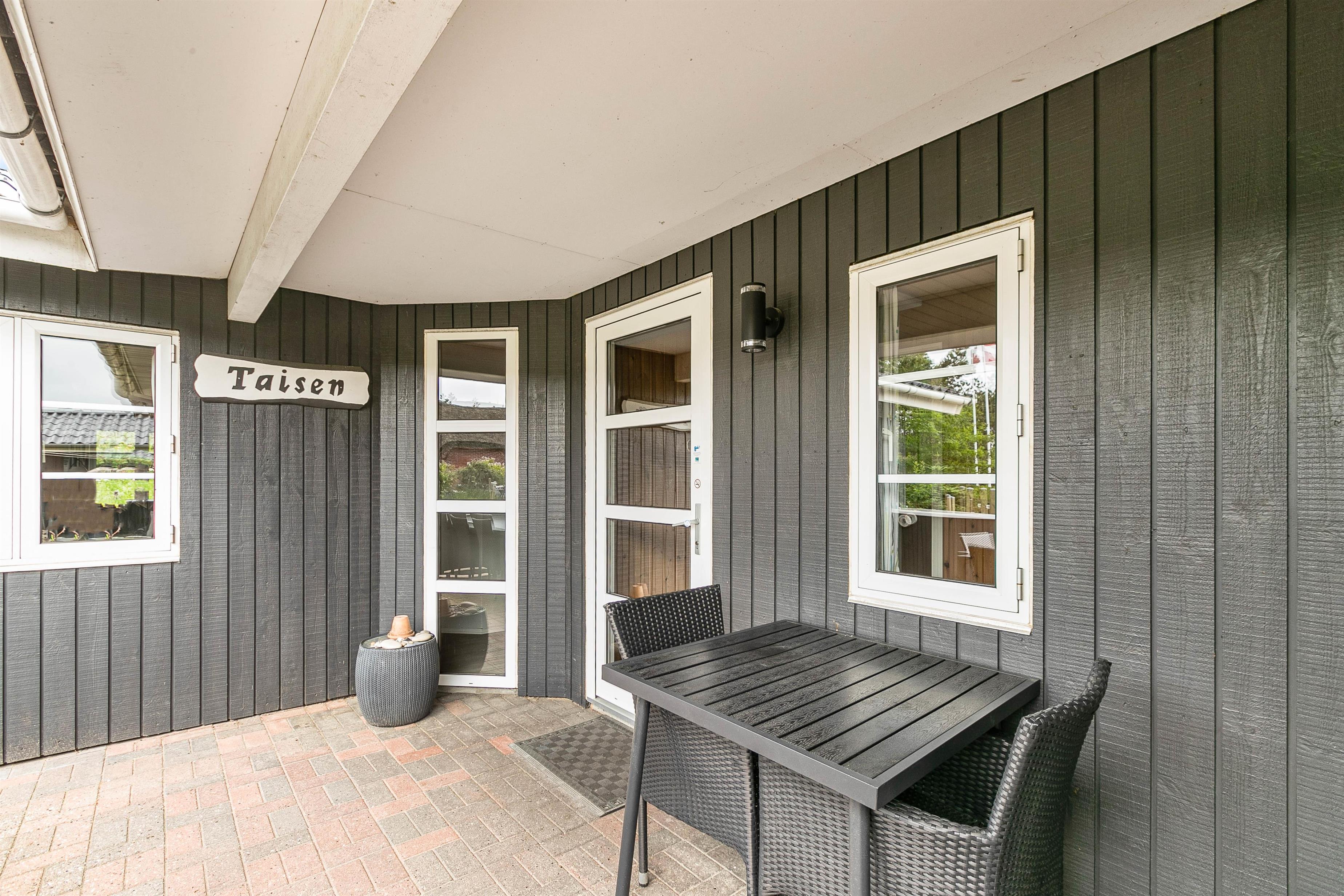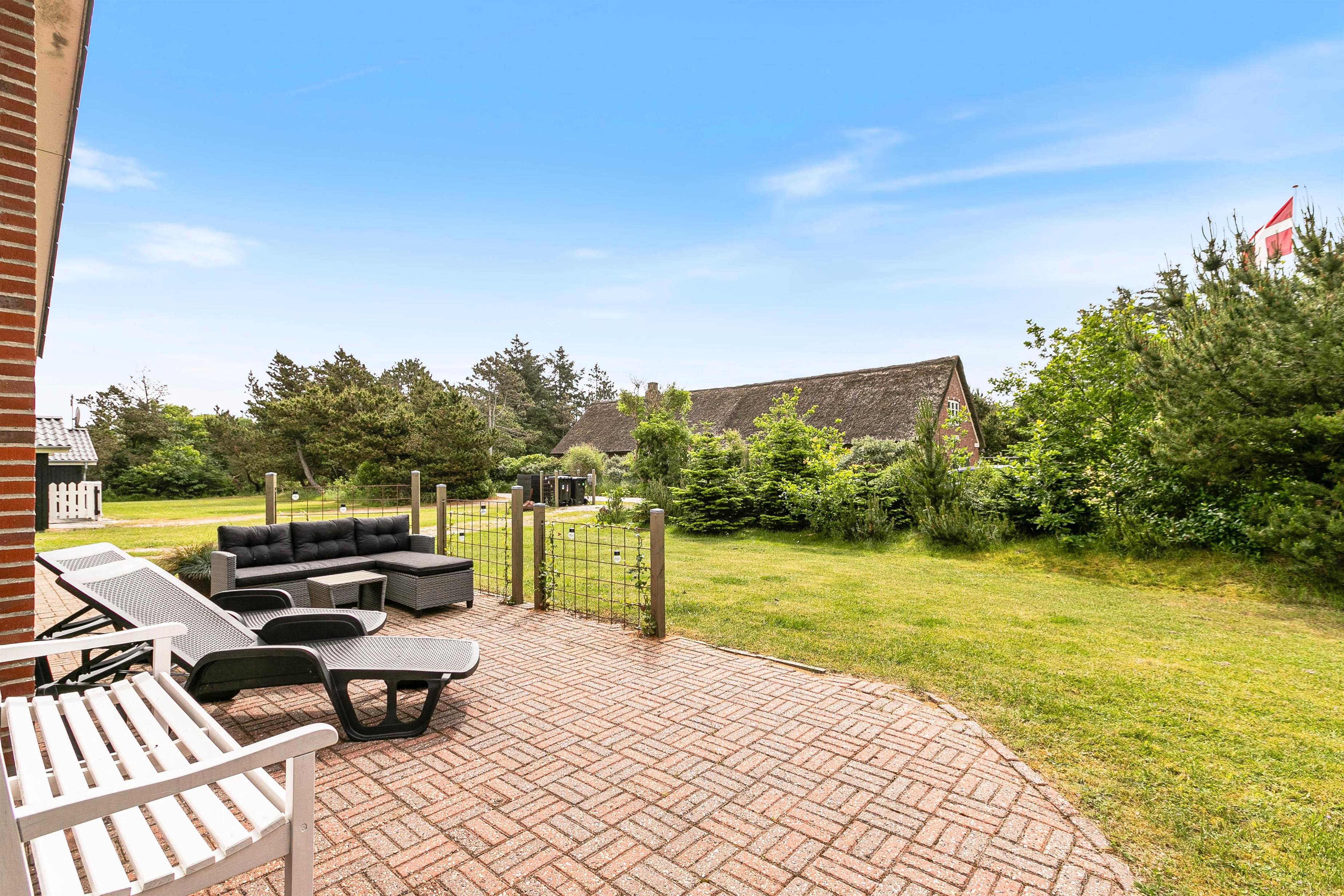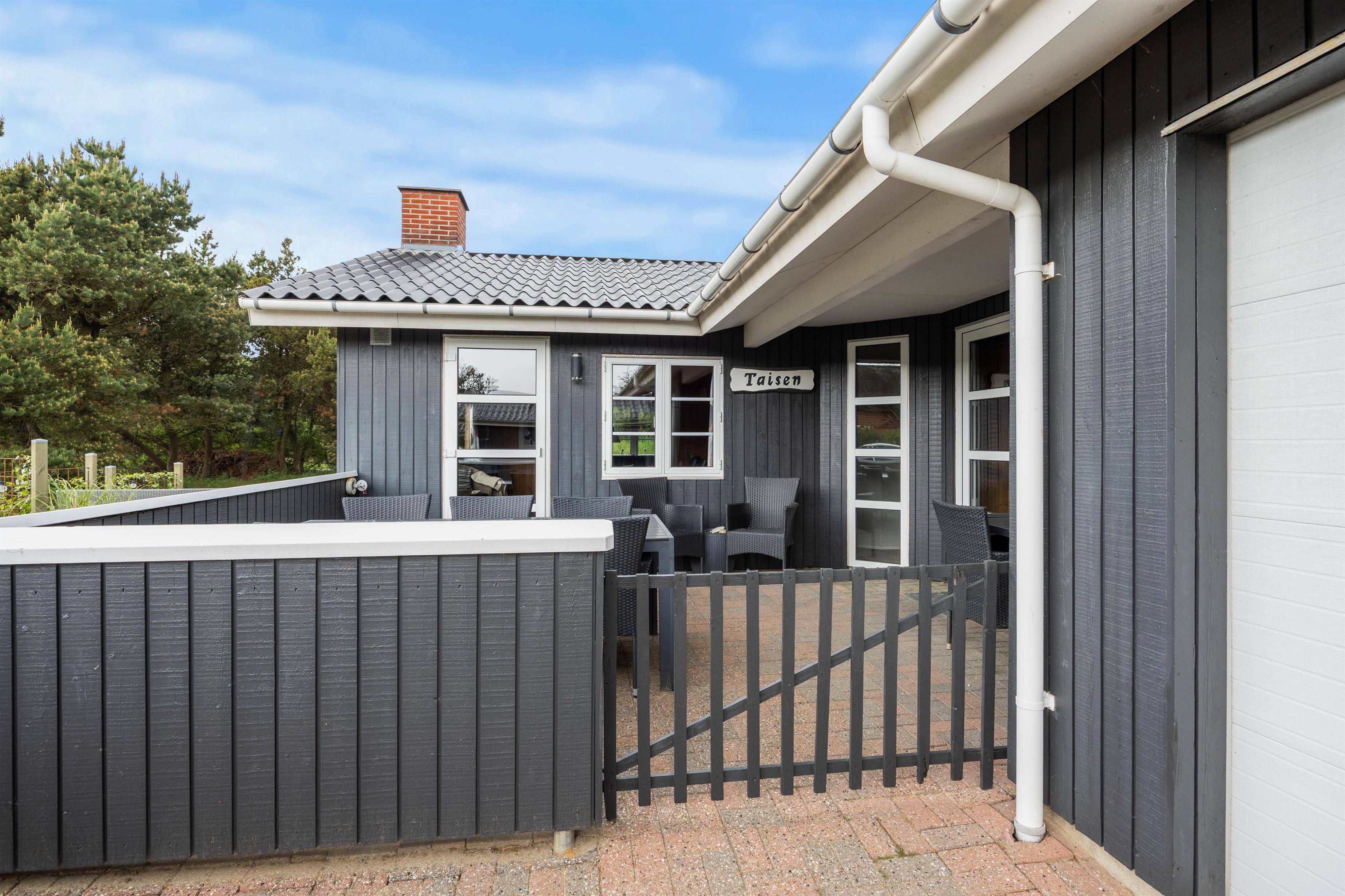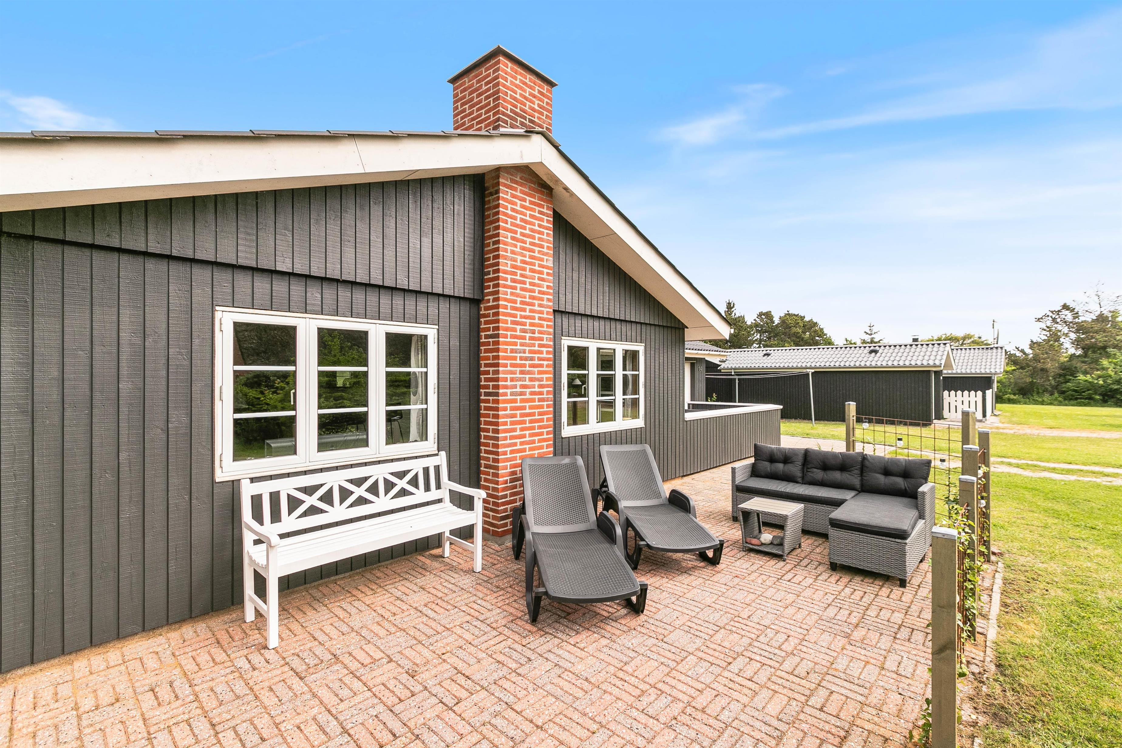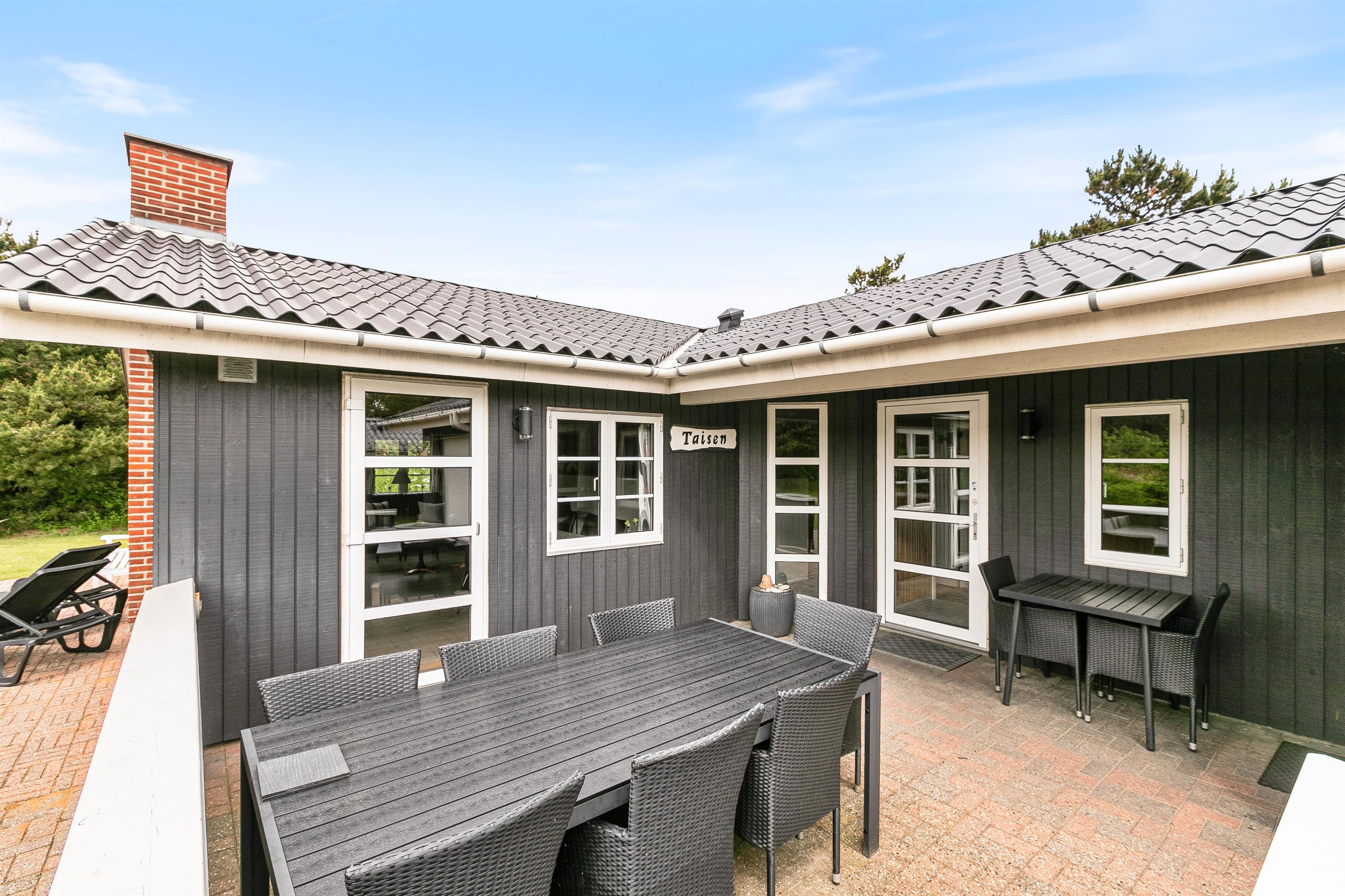 Sommerhuset er beliggende på en fin naturgrund, er omgivet af fyrretræer på de tre sider og giver både læ samt fred og ro på ferien. Her kan børnene og hunden udfolde sig på plænen eller i gyngerne og sandkassen og den fine møblerede terrasse med grill opfordrer til nydelse af naturen og den friske havluft. Terrassen er delvist afskærmet, så I kan sidde i læ for vinden.