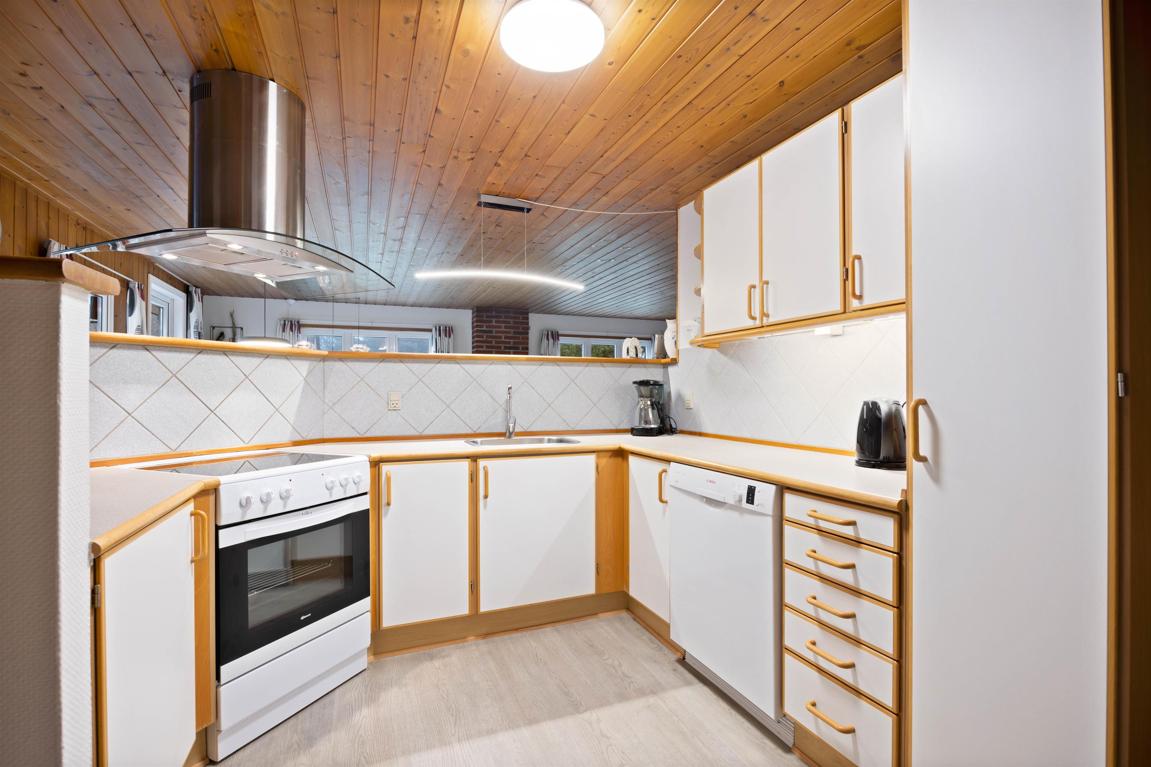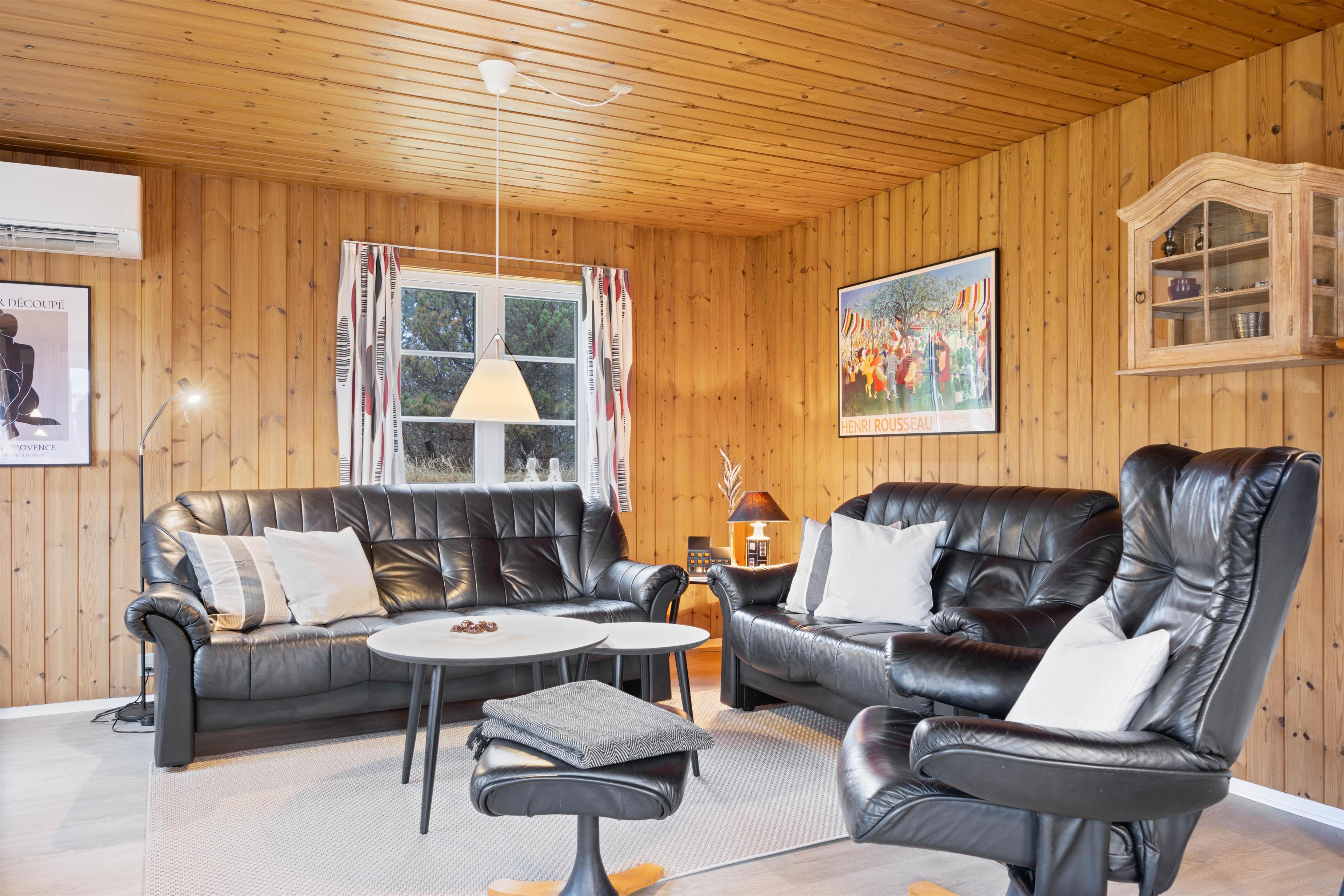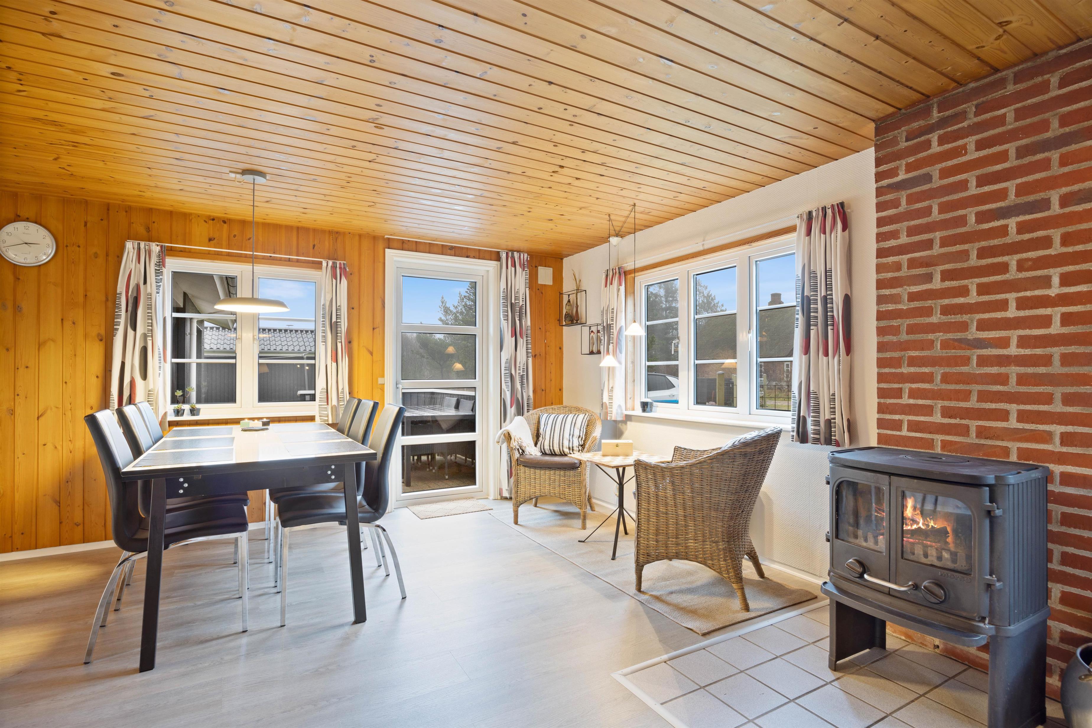 Køkkenet er hjertet i sommerhuset og er i åben forbindelse med både spiseafdeling og den godt møblerede opholdsafdeling, hvor brændeovnen spreder hygge og indbyder til afslapning på ferien. Her er også en varmepumpe, som I med fordel kan benytte jer af.