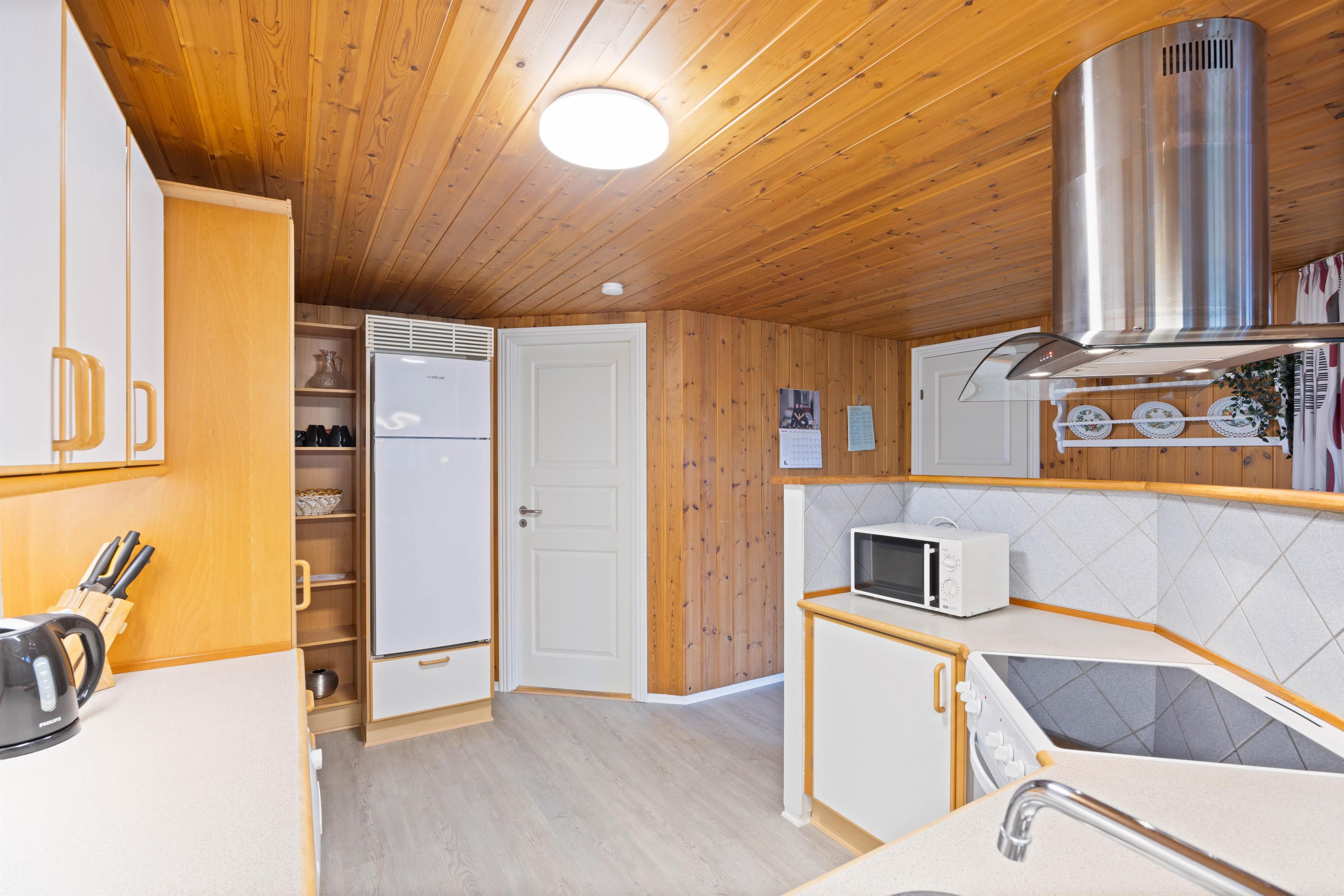Det hyggelige sommerhus har en indbydende indretning med træbeklædte lofter og vægge.