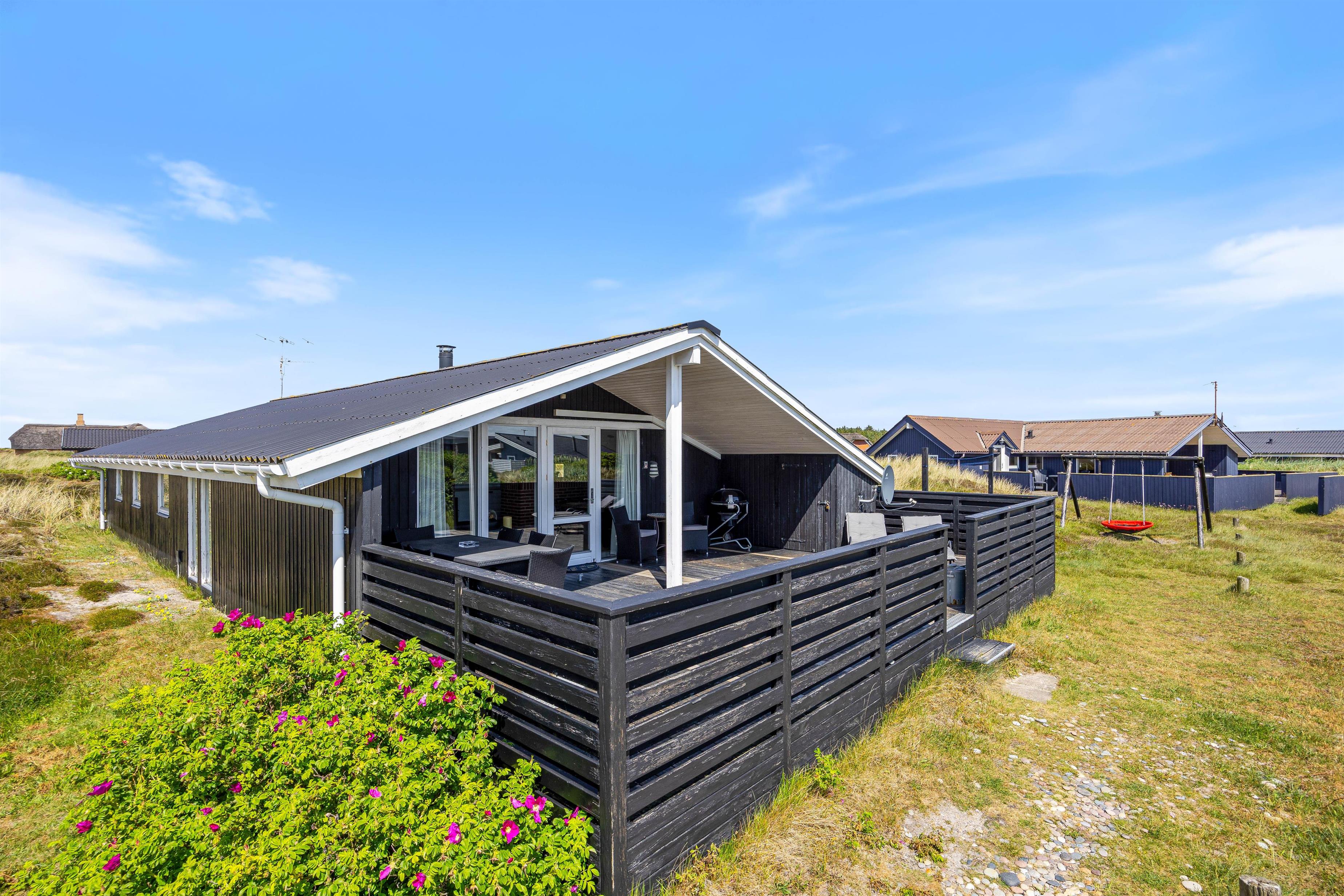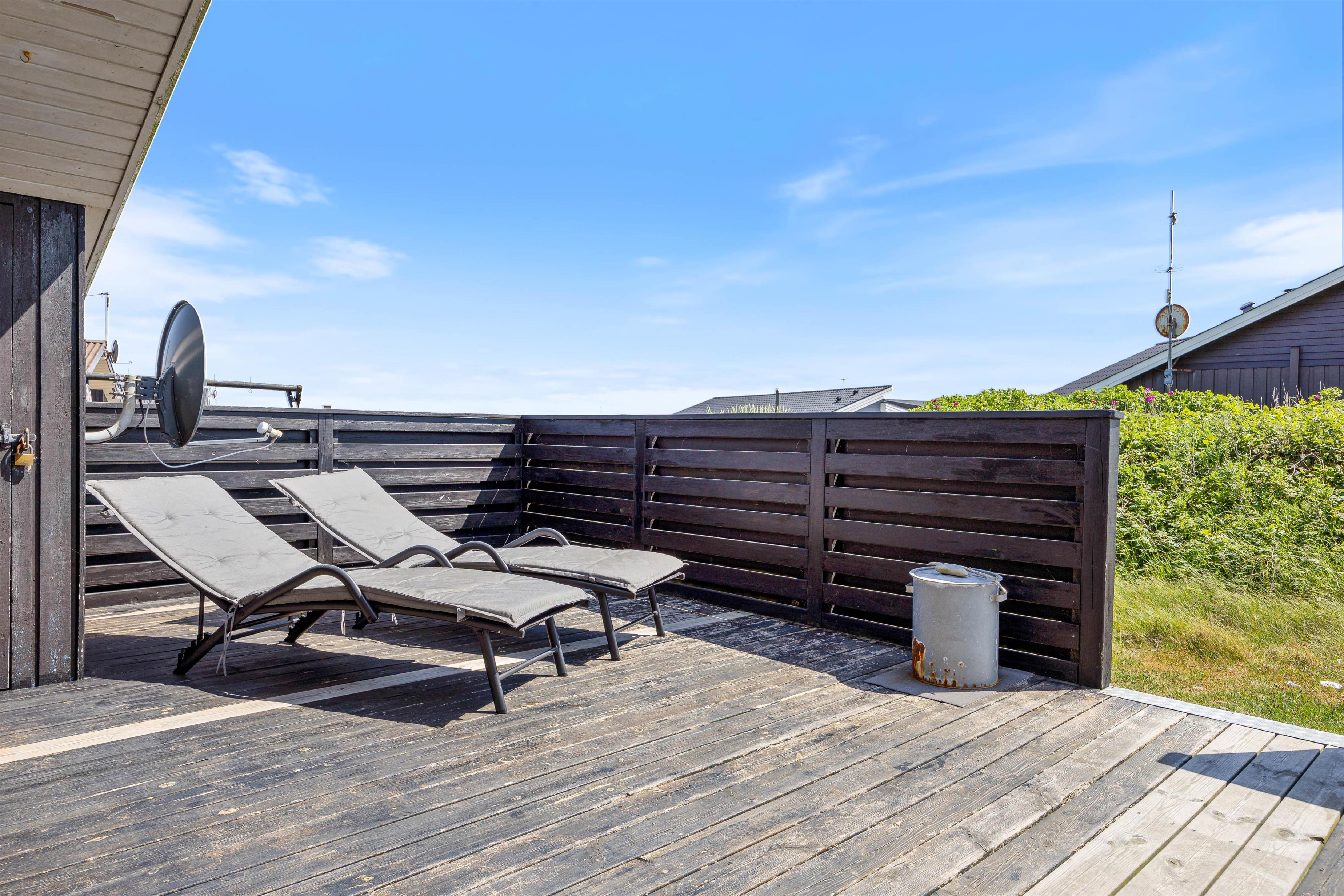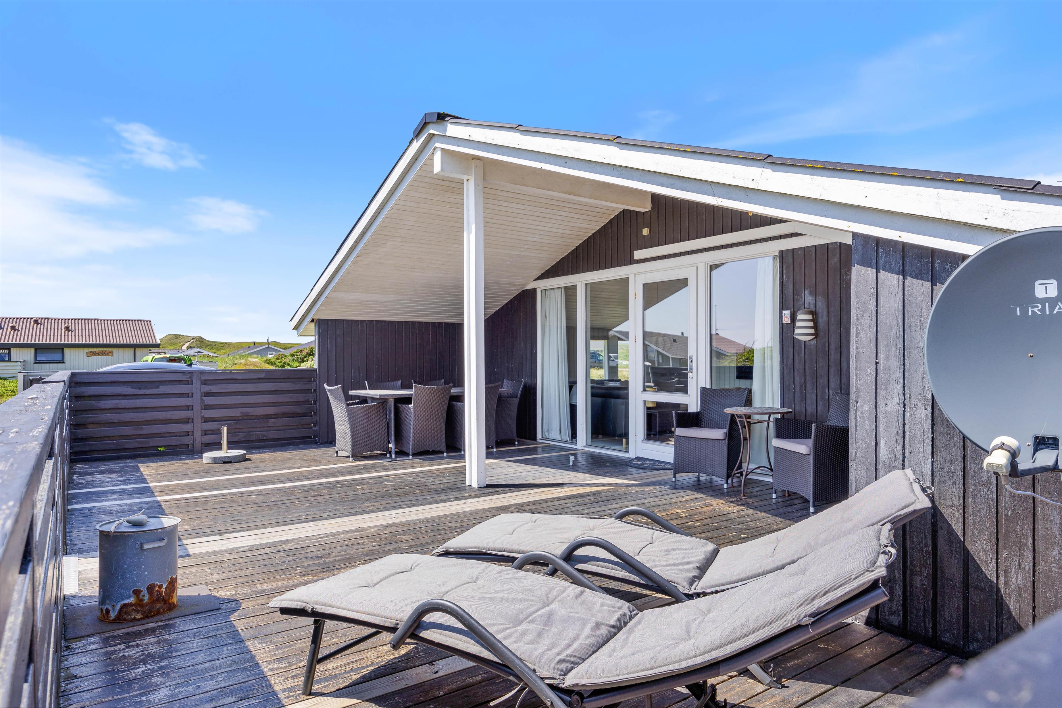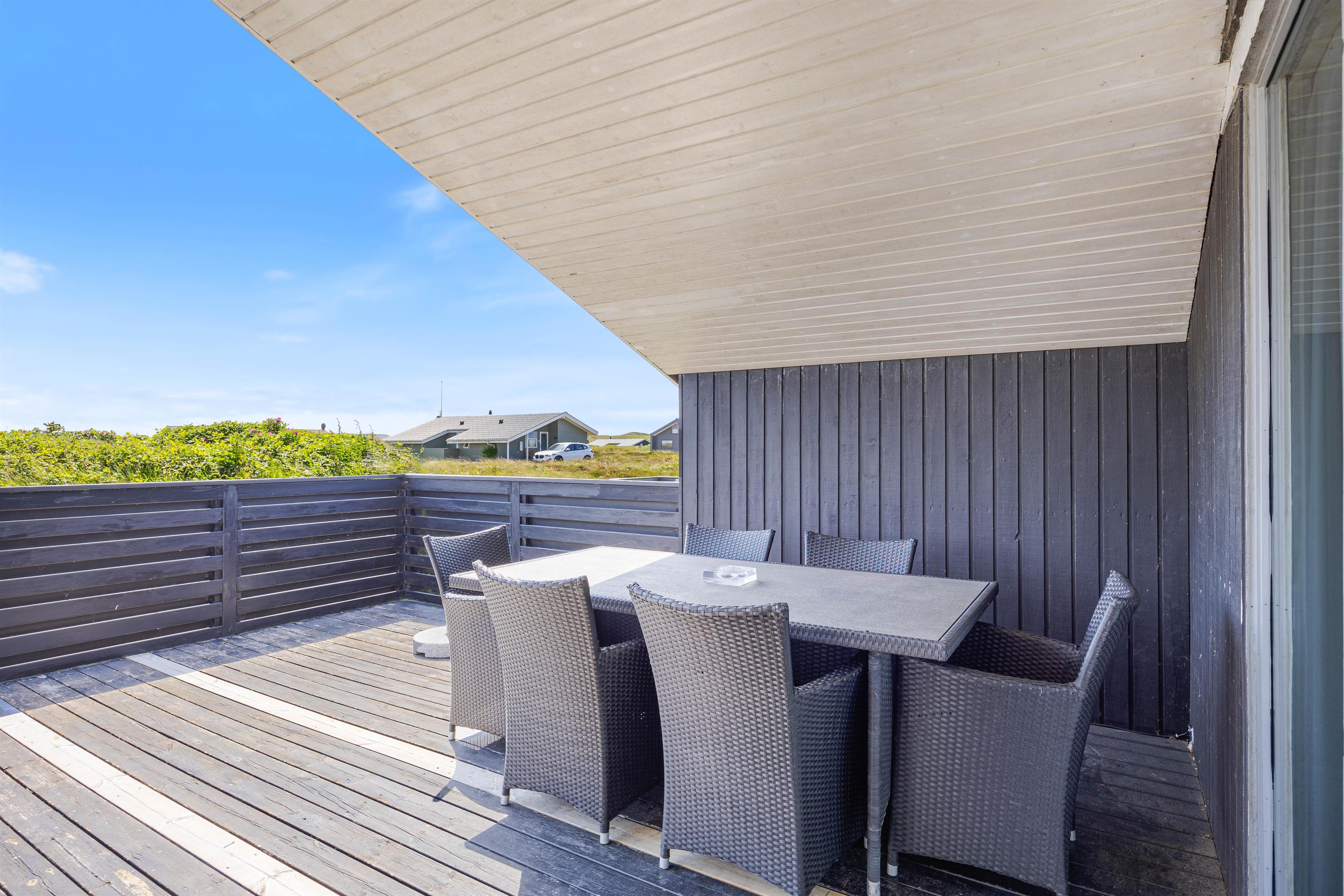 Udendørs venter en skøn terrasse, som er både afskærmet og delvist overdækket – det perfekte sted til at nyde dagens måltider i læ for vinden eller til at slappe af med en kop kaffe i den friske havluft. Når aftenen falder på, kan I tænde op i grillen og samles til hygge og nærvær. Her er der god mulighed for at finde ro i solen eller i skyggen, alt efter humør og vejr.