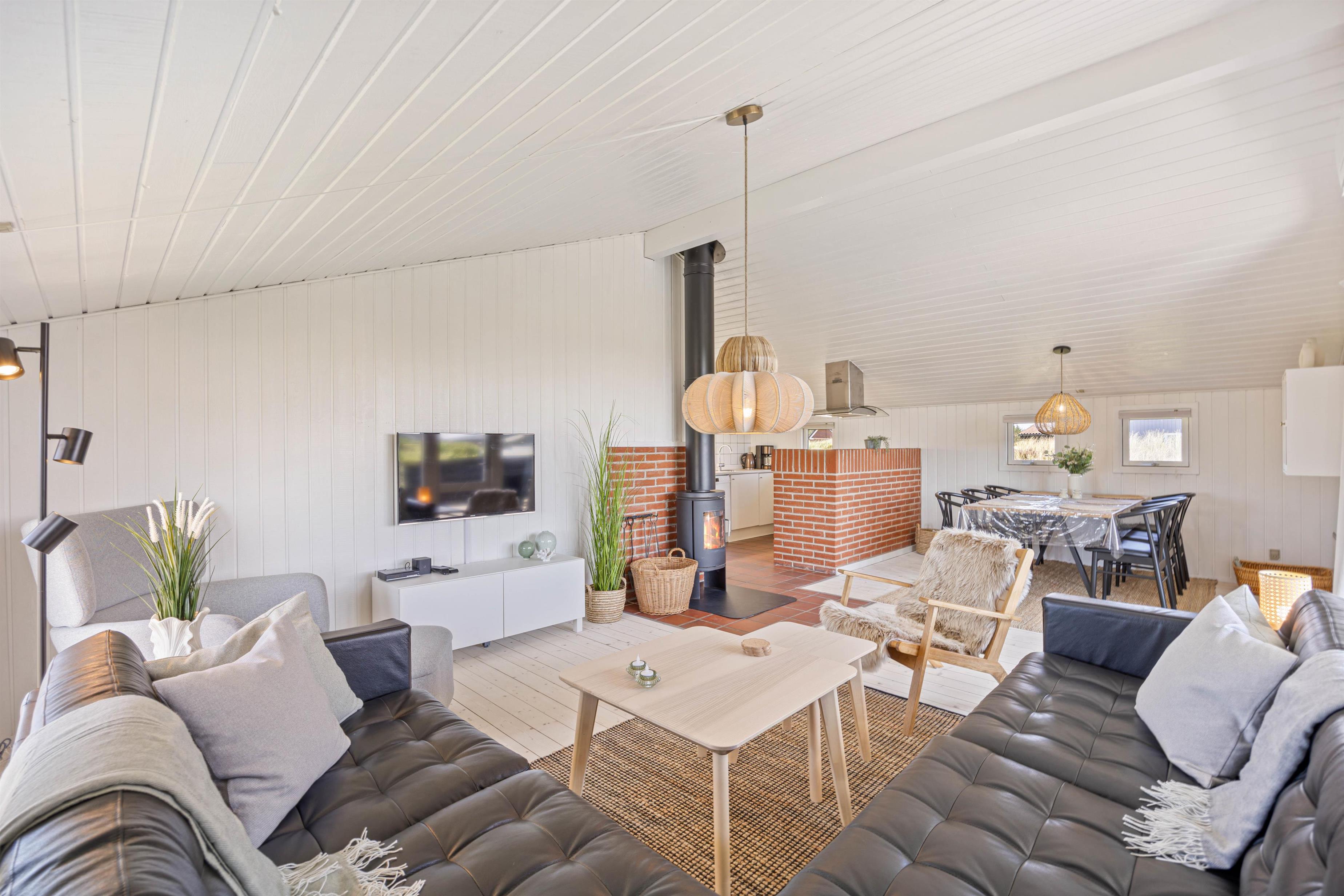 Stuen er indrettet med fokus på hygge og samvær og danner rammen om mange gode feriestunder. Her kan I tænde op i brændeovnen, læne jer tilbage i sofaen med en god bog eller samles omkring bordet til spil og samtaler. Varmepumpen sørger for et behageligt indeklima, og efter en dag med oplevelser i naturen kan I slappe af i sommerhusets sauna.